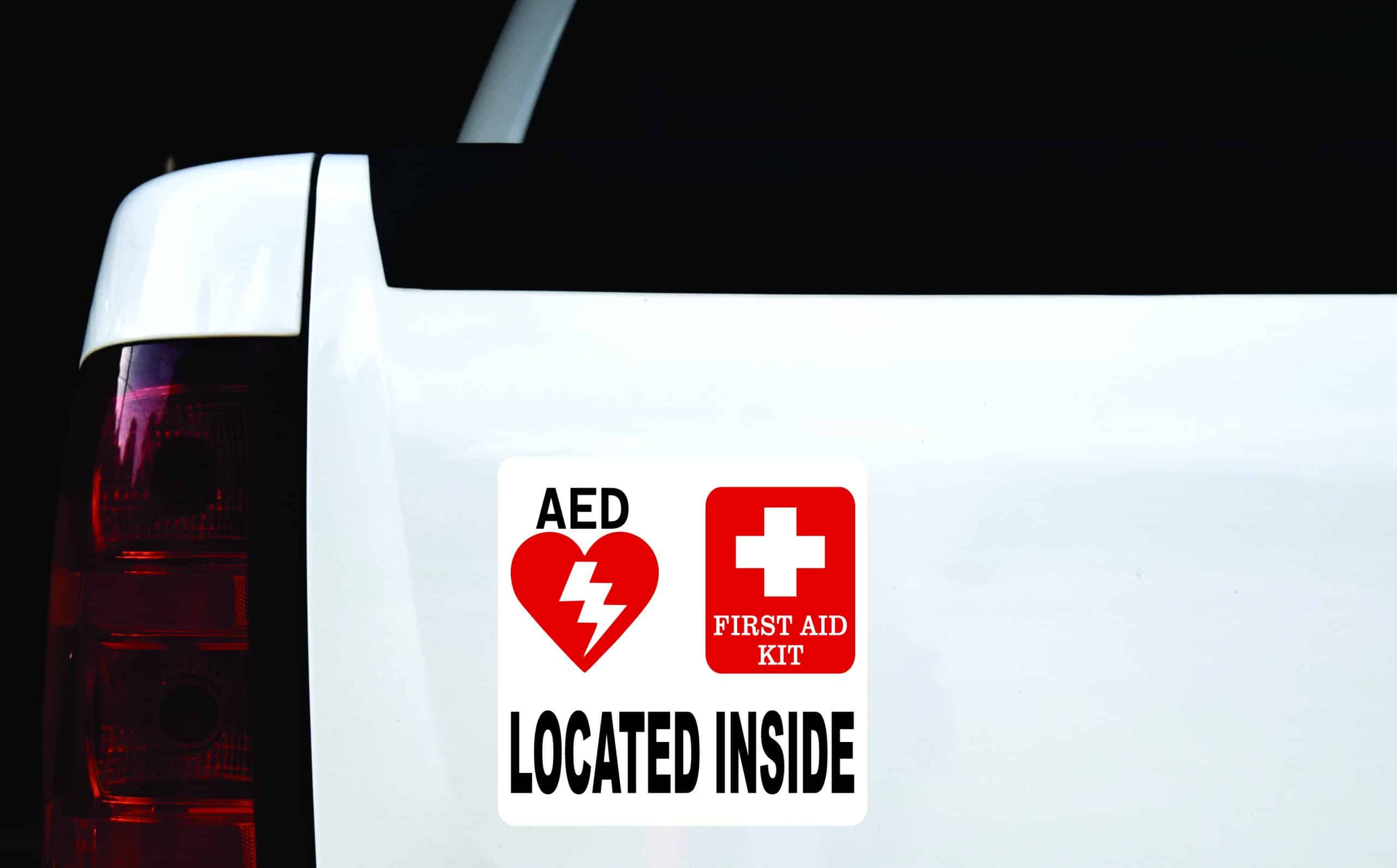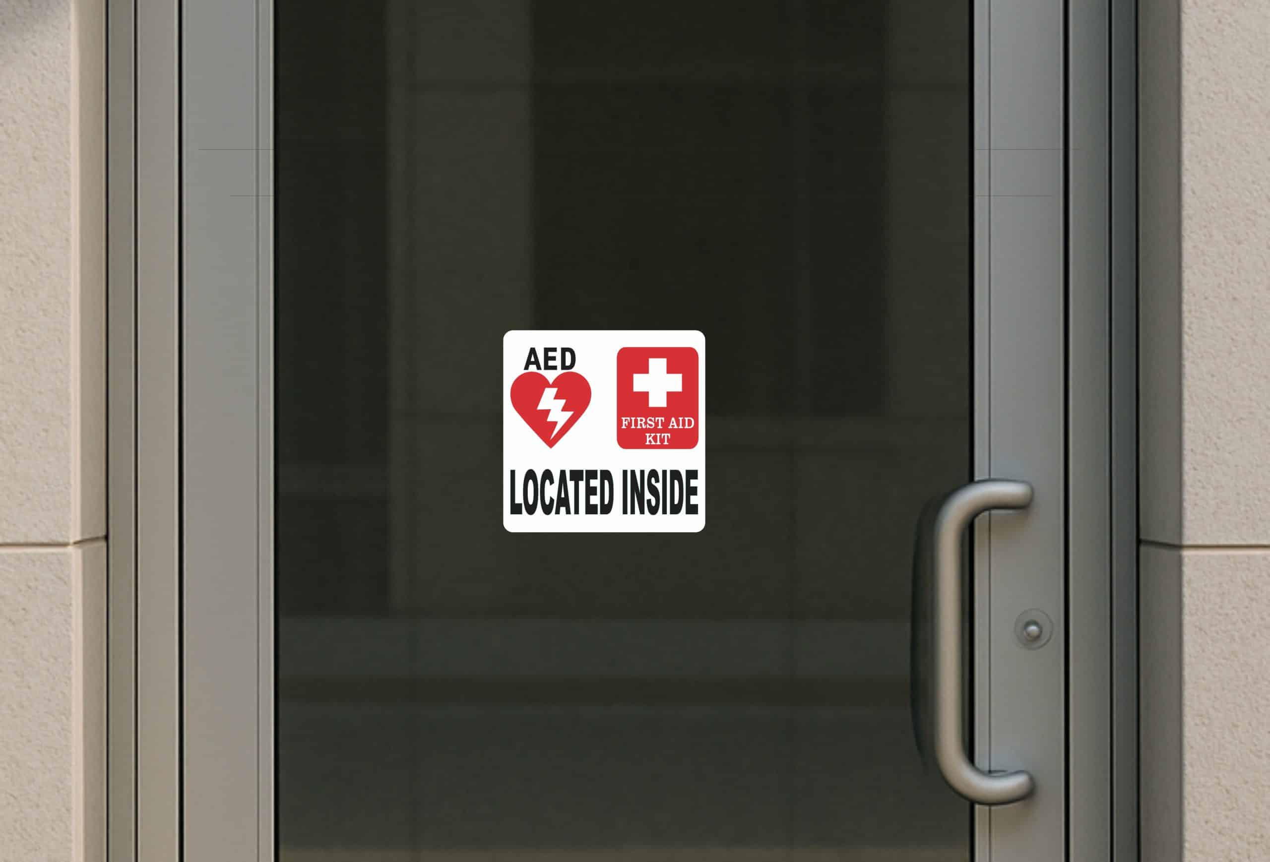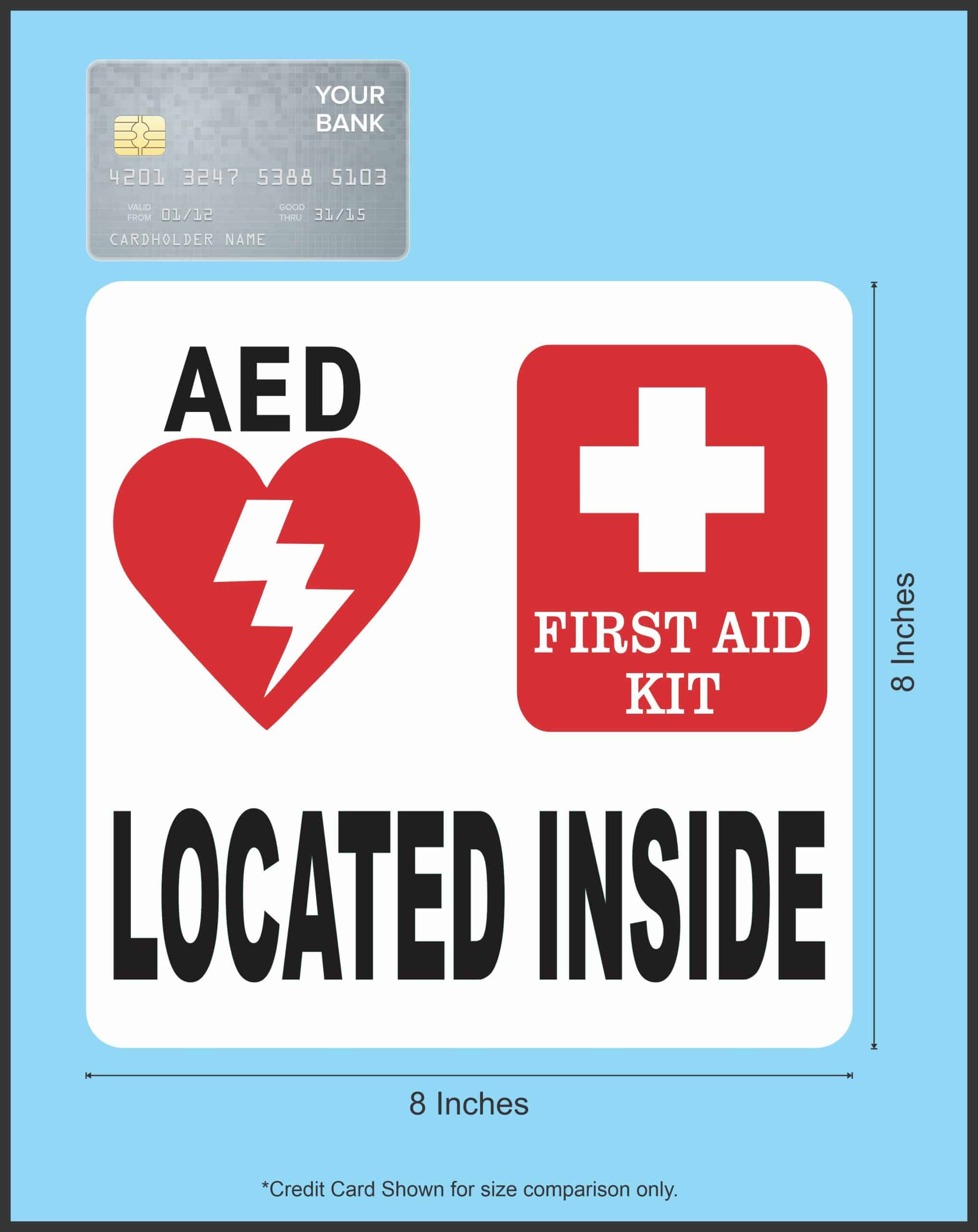 This sticker measures 8 inches tall and 8 inches wide. It depicts an AED symbol and a first aid kit symbol above the words, LOCATED INSIDE, printed in black letters. The sticker’s background is solid white. This carefully crafted product is durable and easily visible, making it ideal for display in a variety of settings and scenarios!