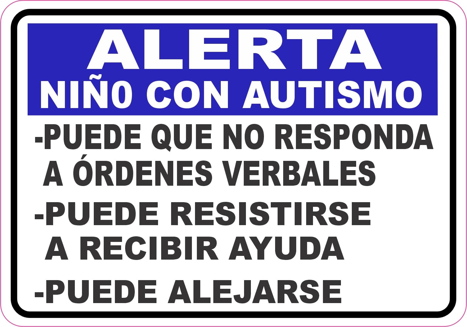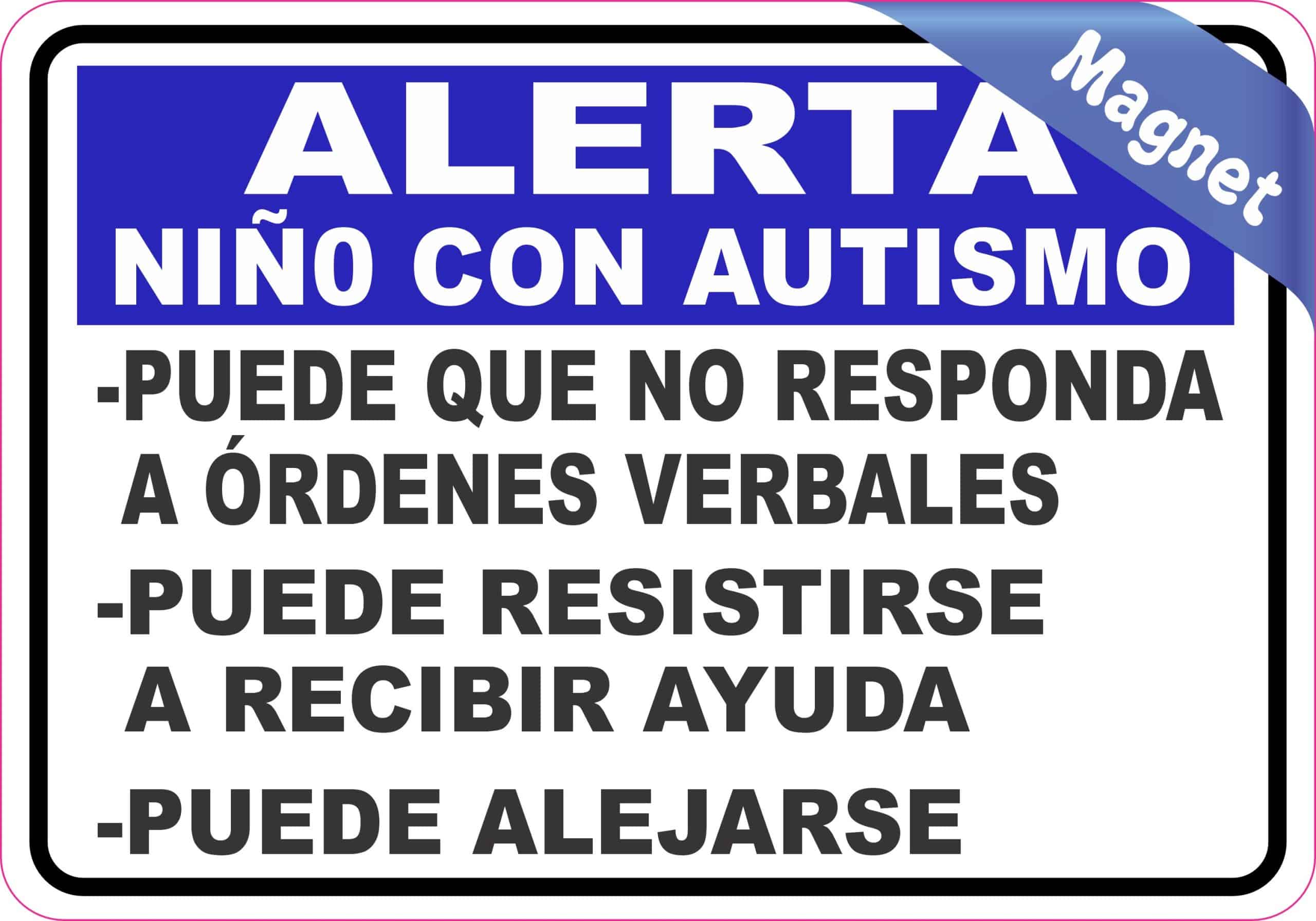 This magnet measures 5 inches wide and 3.5 inches tall. At the top of the magnet, there is a blue banner with white text that says, “ALERTA NIÑO CON AUTISMO”. Below that, the magnet has a white background and black text that says, “- PUEDE QUE NO RESPONDA A ÓRDENES VERBALES – PUEDE RESISTIRSE A RECIBIR AYUDA – PUEDE ALEJARSE”. This magnet communicates the needs of a child with autism to emergency responders in Spanish. It looks best when applied to a flat smooth magnetic surface.