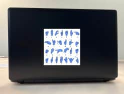 This sticker is 5 inches wide by 5 inches tall when applied and has a blue hand performing each of the letters of the alphabet in American Sign Language. The letter each sign represents is printed below the hand in black. The sticker’s background is solid white. The pink line in the image shows where the sticker is cut; the pink line is not printed on the sticker. This carefully crafted product is a great tool for ASL students of all ages!