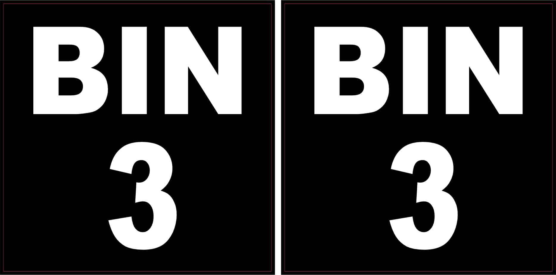 This is a set of 2 stickers. Each one measures 3 inches wide by 3 inches tall. Each sticker has the words Bin 3 in white letters on a black background.