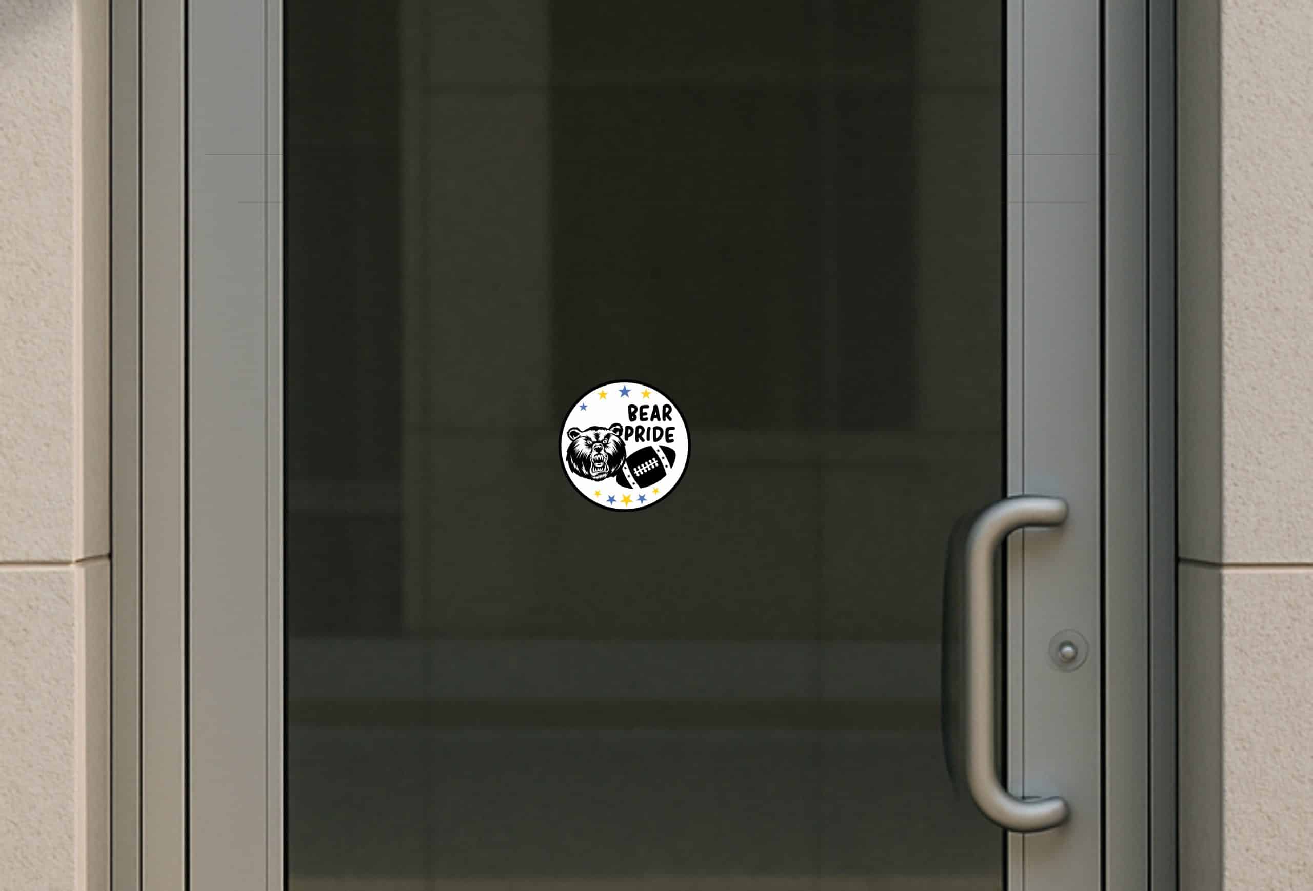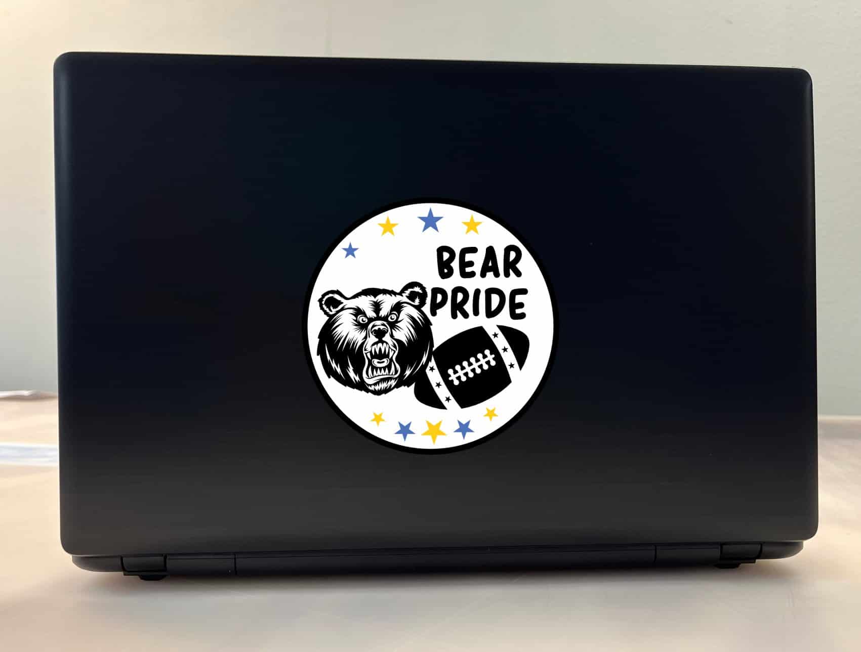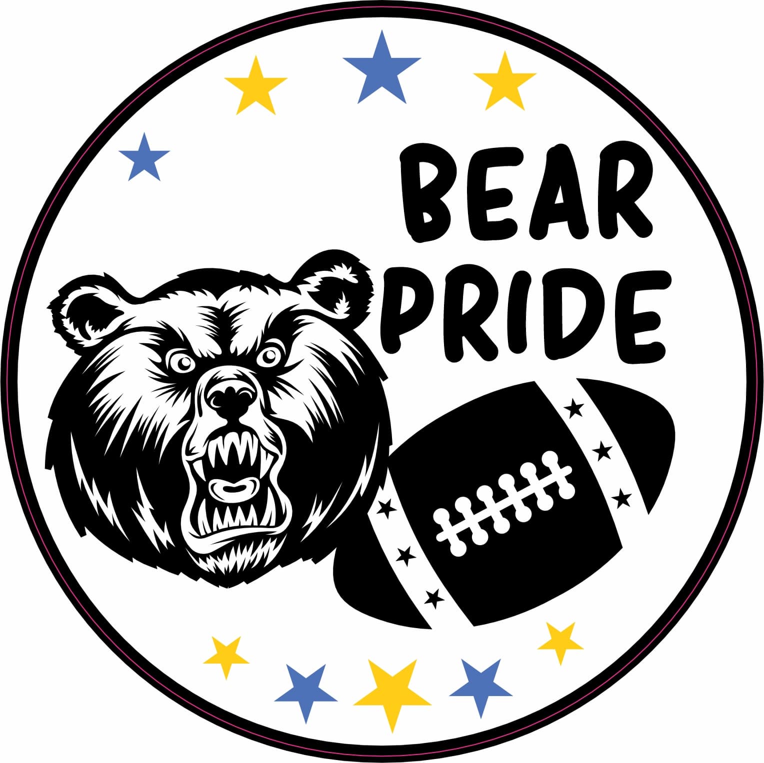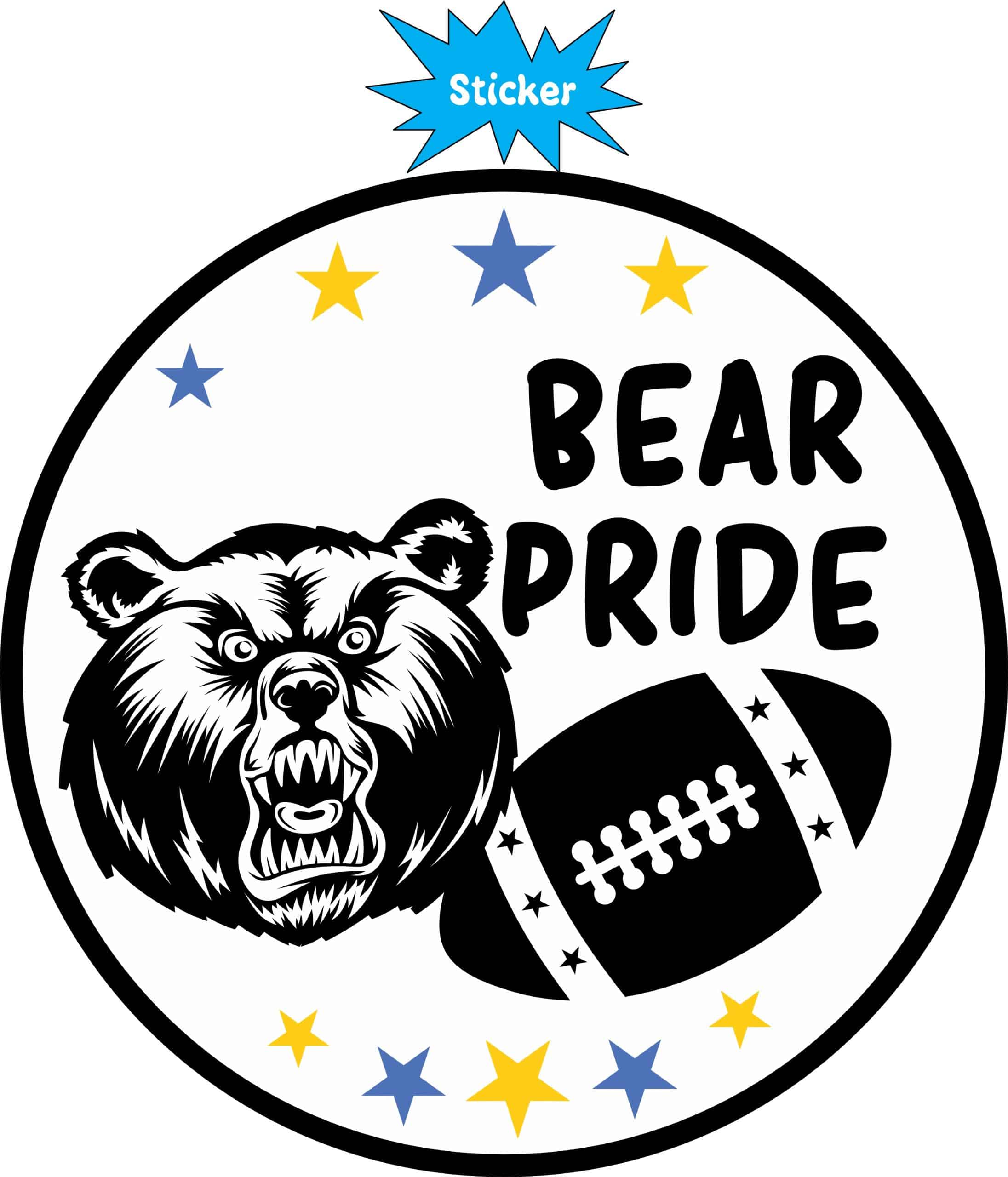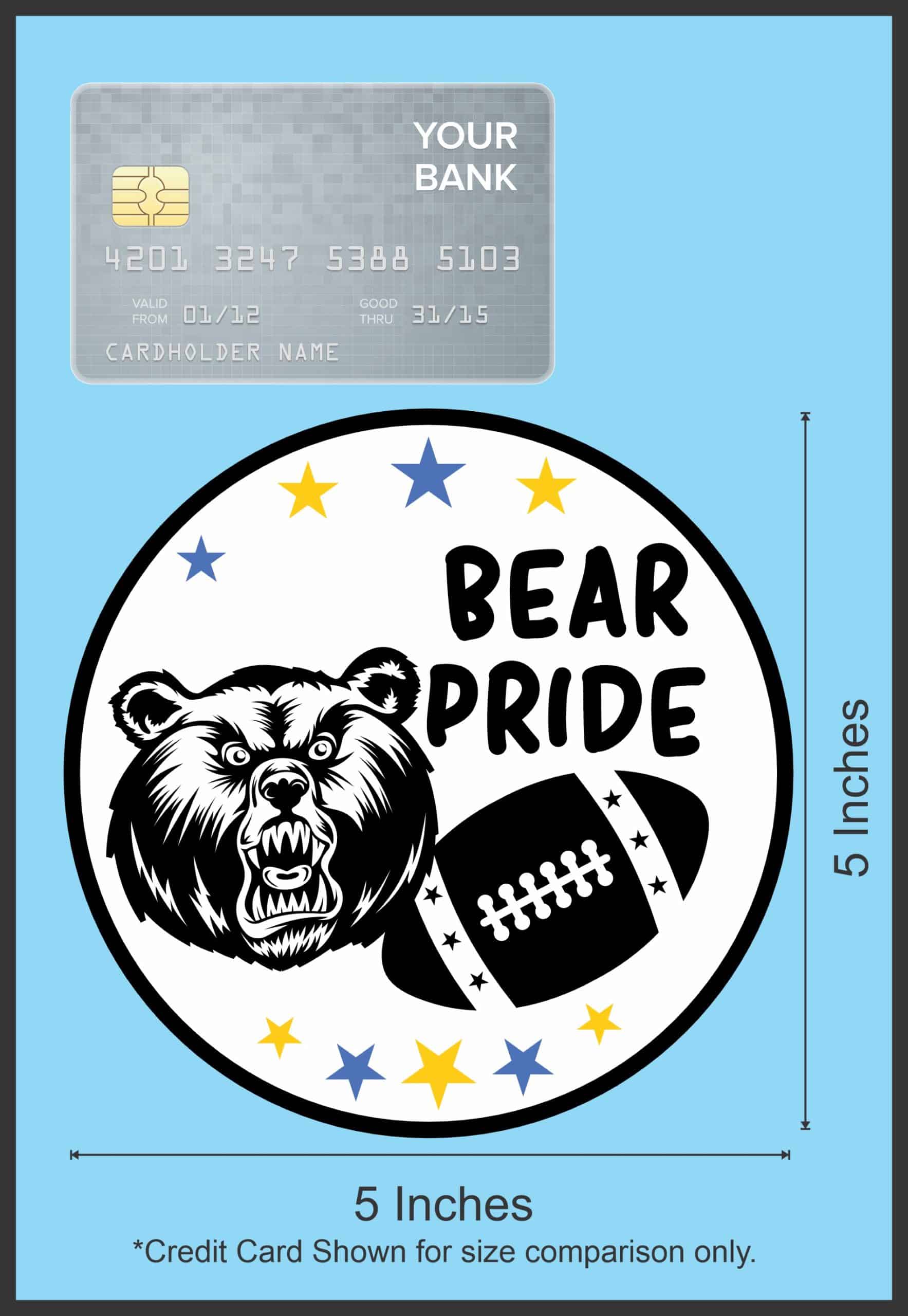 This sticker measures 5 inches in diameter. This a circle sticker with a fierce bear and a star studded football in the center in black and white. Above that on the right in black text it says BEAR PRIDE. On the top and bottom there are yellow and blue stars. This sticker is the perfect way to show your support of the bears football team. It looks best when applied to a flat smooth surface. The pink line indicates where the sticker will be cut and will not be printed on the final product.