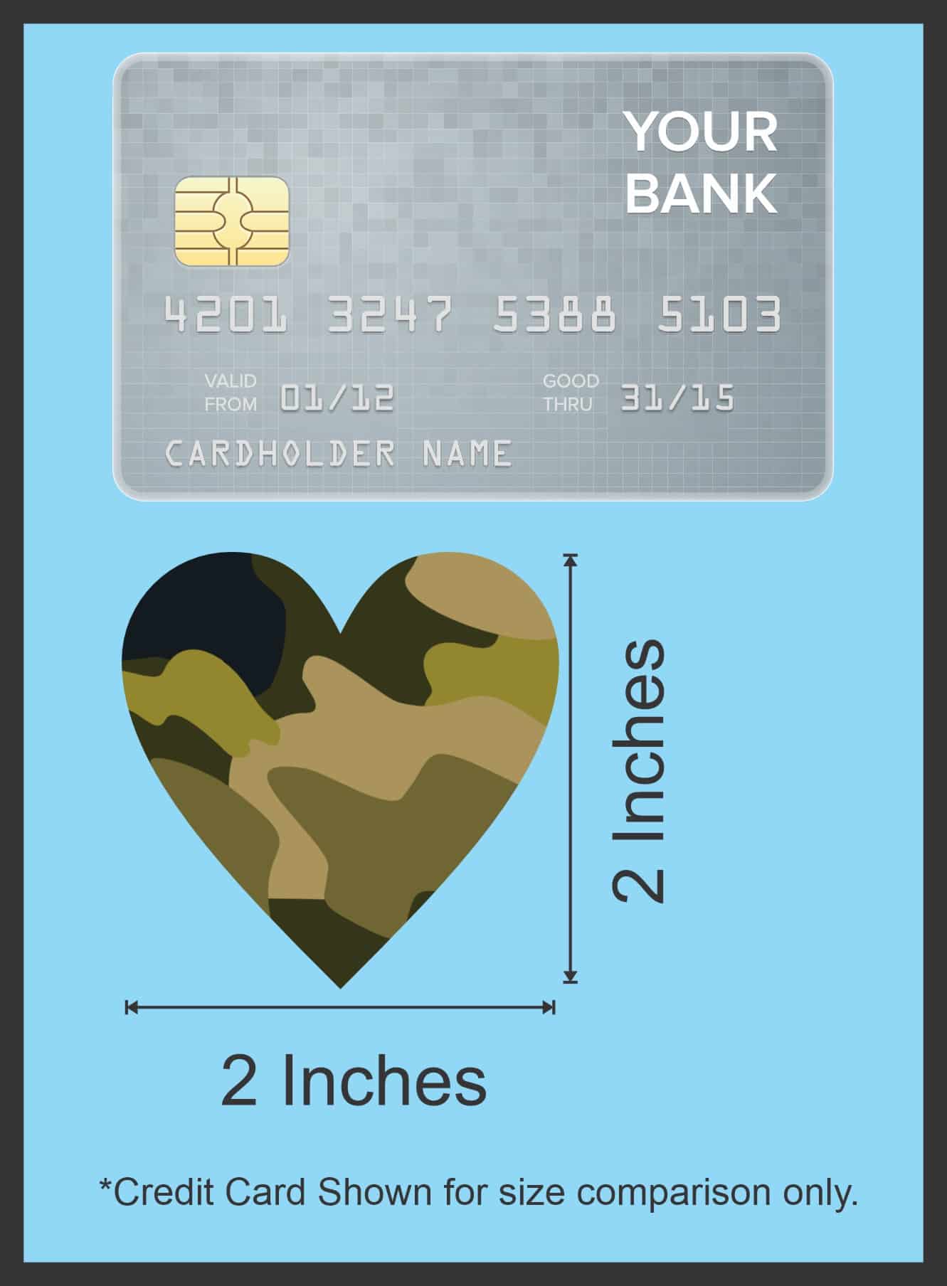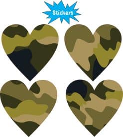This product is a sheet of 4 stickers.  Each sticker is 2 inches wide by 2 inches tall when applied.  They are cut into the shape of a heart and decorated with a traditional green camouflage pattern.  These carefully crafted stickers are the perfect way to add some personality to vehicles, cups and tumblers, luggage, and other hard, smooth surfaces!