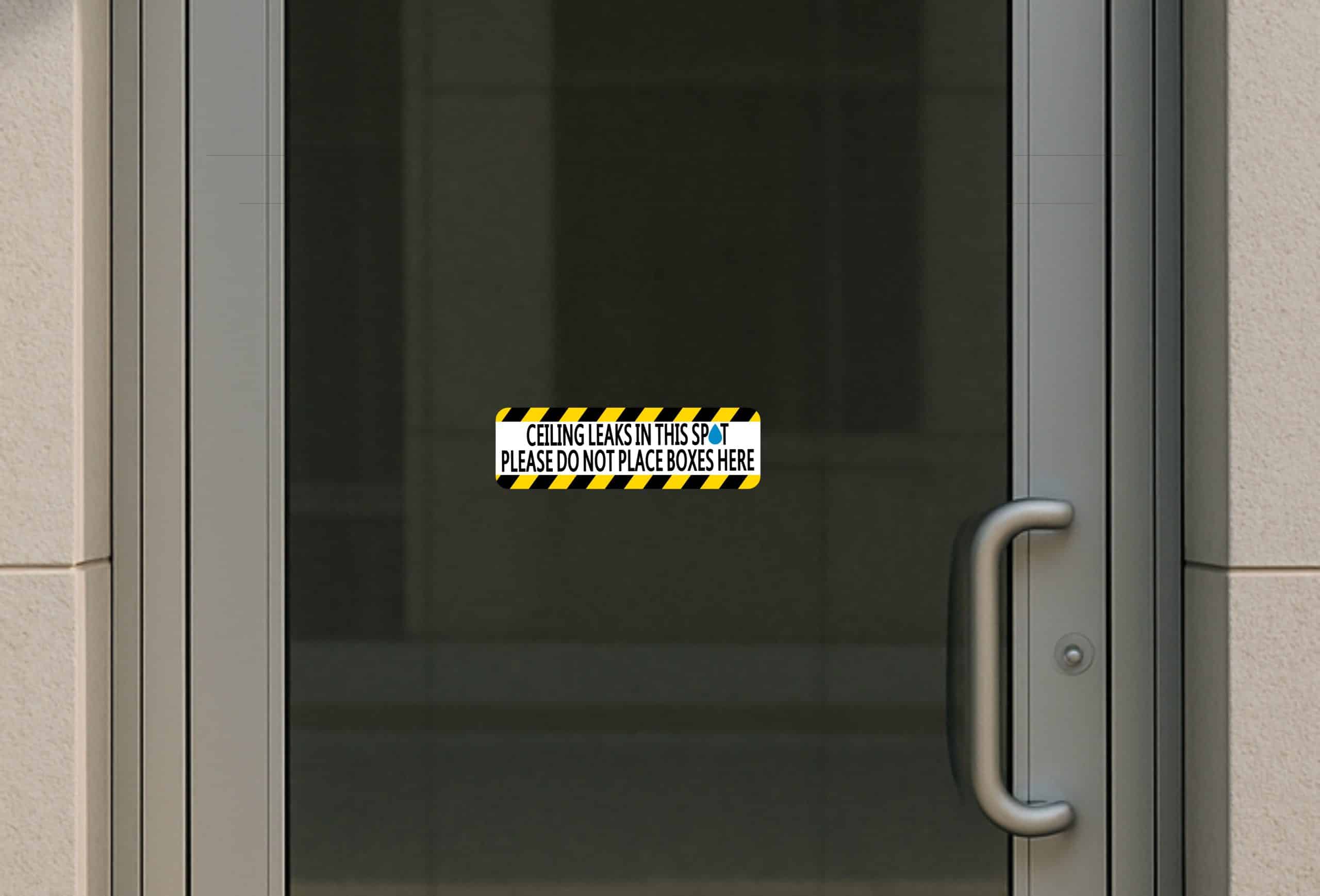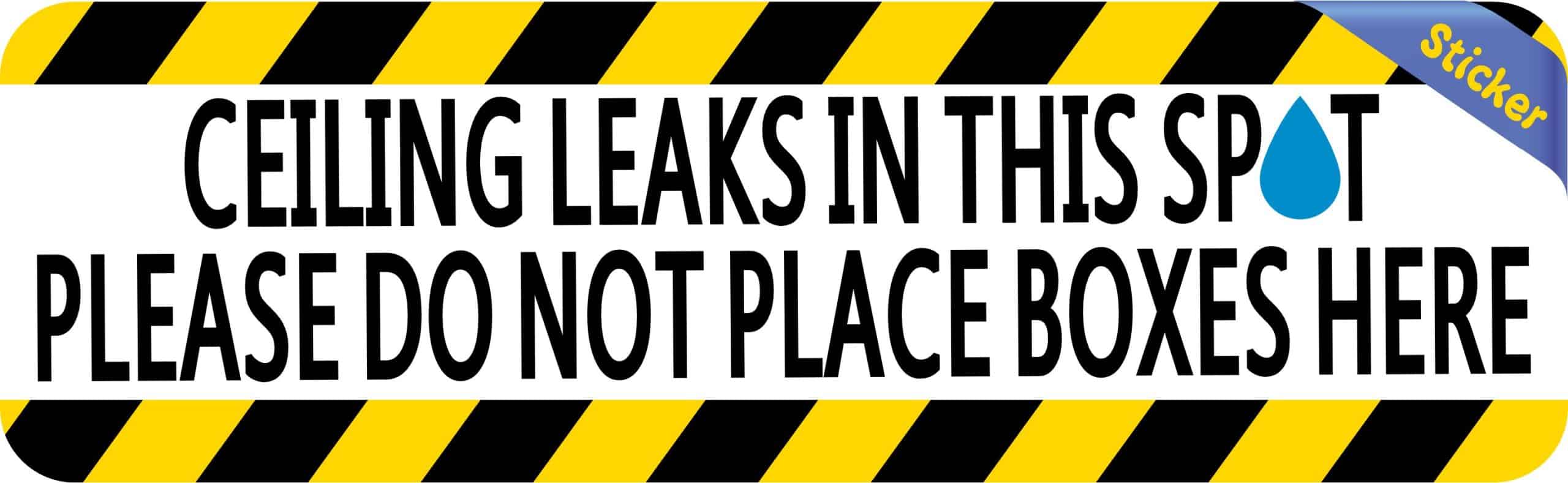 This sticker measures 10 inches wide by 3 inches tall. Professional warning sign featuring bold black text on white background with yellow and black safety stripes. The message “CEILING LEAKS IN THIS SPOT PLEASE DO NOT PLACE BOXES HERE” with water droplet graphic clearly communicates the hazard. Made from premium air release vinyl with UV resistant PVC lamination for superior durability. Waterproof and weatherproof construction resists fading and cracking, making it suitable for both indoor and outdoor applications. Professional warning sign sticker alerts about ceiling leaks.