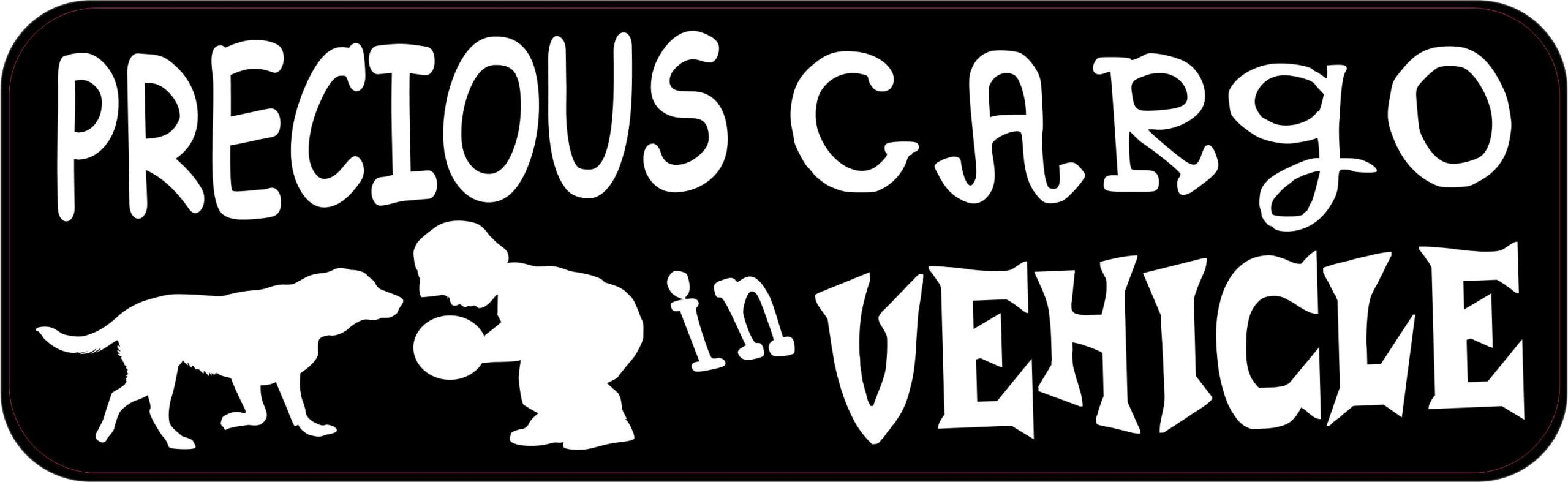 This sticker is 10 inches wide by 3 inches tall when applied.  It features the words, PRECIOUS CARGO in VEHICLE, in white letters on a black background.  A white silhouette of a small child and a dog playing with a ball is printed in the bottom left corner of the sticker.  This carefully crafted product is durable and easily visible, making it a great way to help keep you little ones safe on the road!