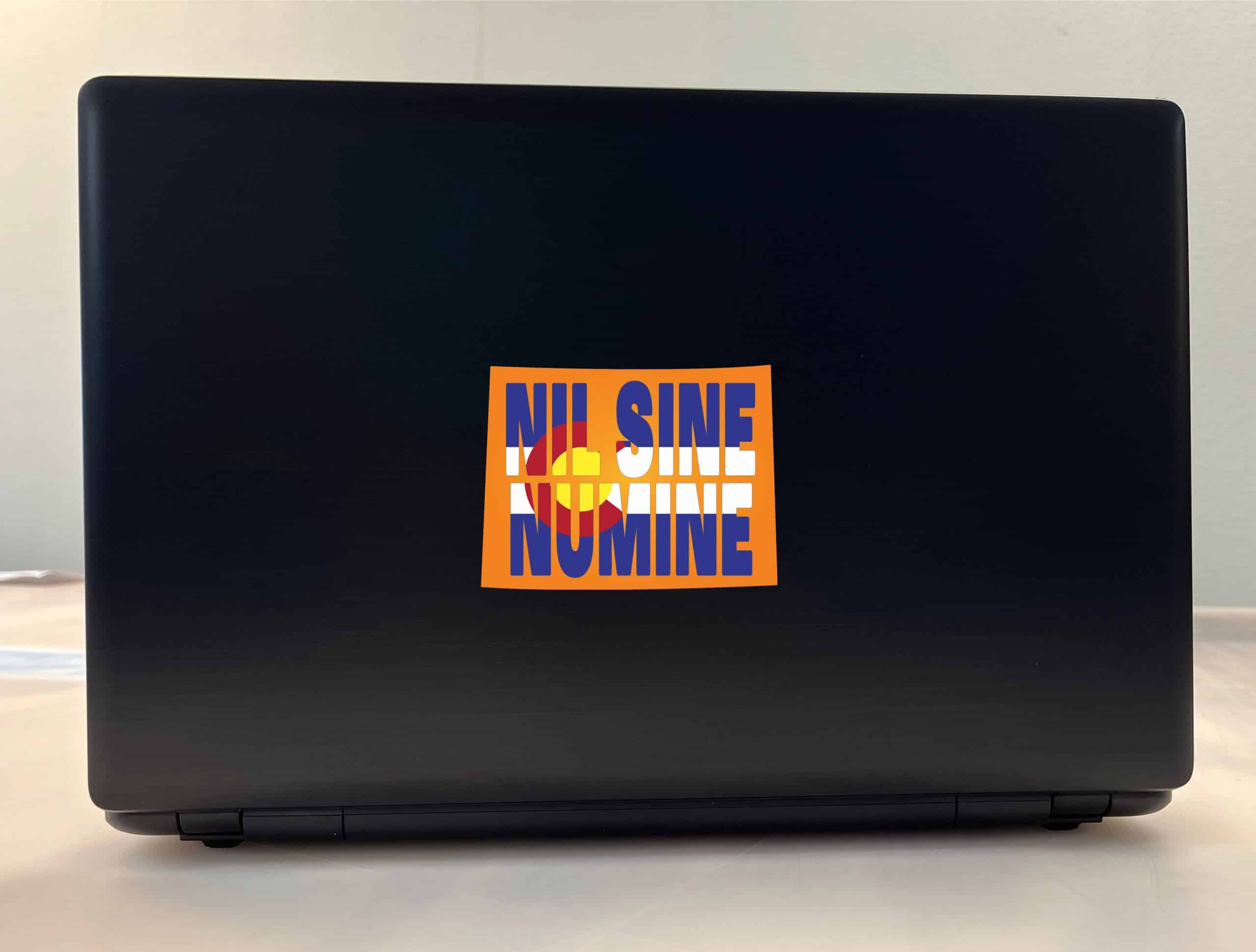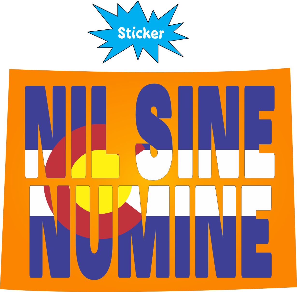 This sticker measures 4 inches wide and 3 inches tall. It is cut into the shape of Colorado and has an orange background. In large block letters it says, Nil Sine Numine. A Latin phrase that means, nothing without the deity, the state’s motto. Inside the letters is Colorado’s flag. This sticker is great as a way to remember good times spent there. It can be applied to any flat smooth surface. The pink line indicates where the sticker will be cut and will not be printed on the final product.