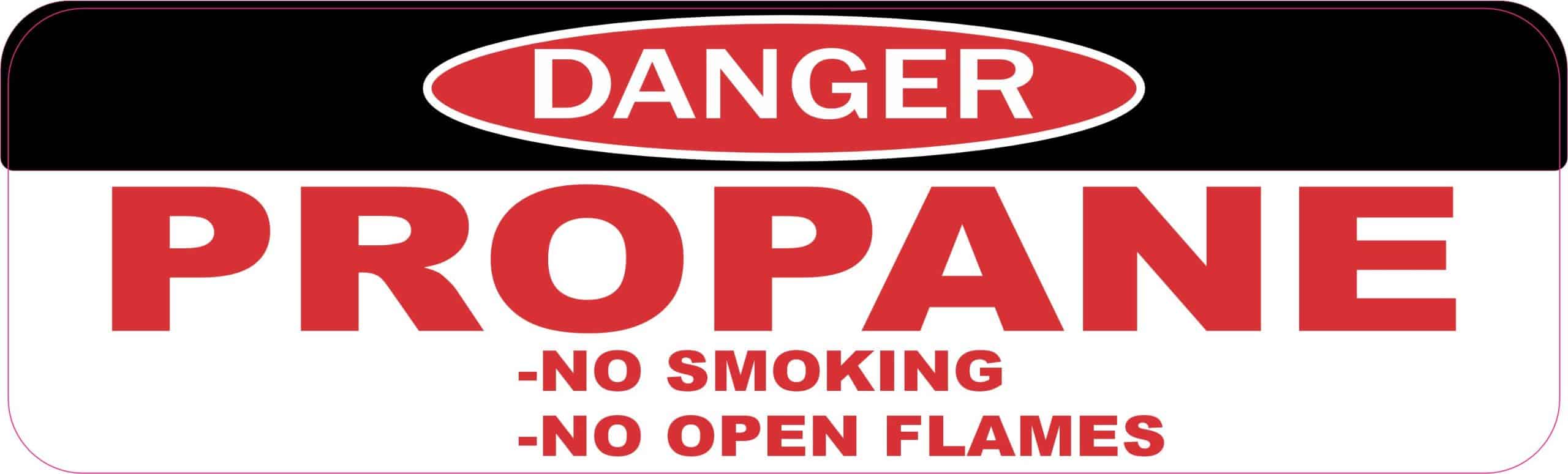 This magnet measures 10 inches wide and 3 inches tall. At the top of this magnet there is a black banner with a red oval that has a white outline in the center of the banner it has white text that says, DANGER. Below that the magnet has a white background with red text that says, PROPANE. At the bottom of the magnet in the form of bullet points it says the phases, NO SMOKING and NO OPEN FLAMES. This magnet is easy to read making it a great warning sign. This magnet can be applied to any flat smooth magnetic surface. The pink line indicates where the magnet will be cut and will not be printed on the final product.