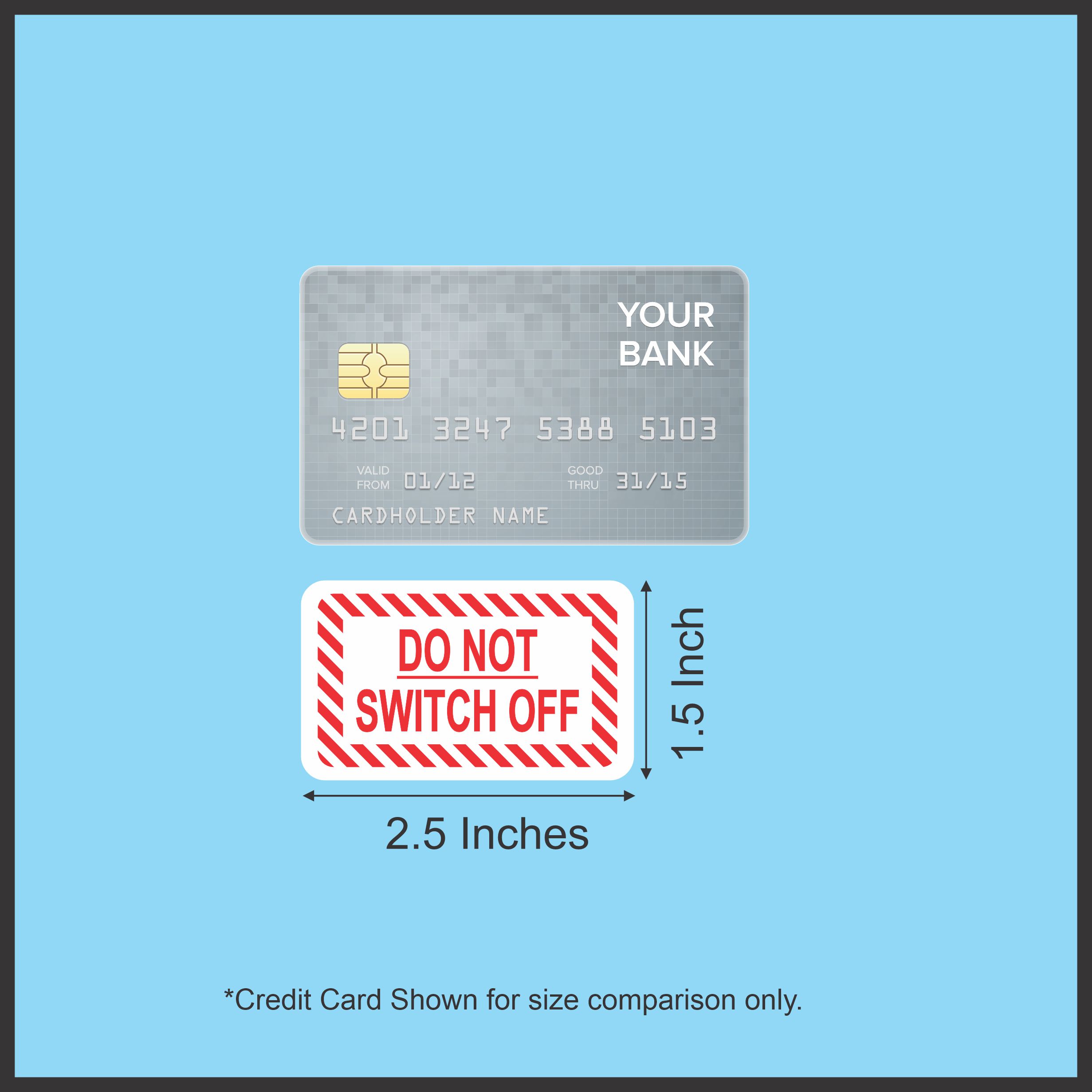 This is 1 sheet of 4 stickers, each one measures 2.5 inches wide by 1.5 inches tall. These professional DO NOT SWITCH OFF warning stickers feature bold red text on a white background with distinctive red and white striped borders for maximum visibility and attention. These safety stickers help prevent accidental shutdowns and maintain operational safety in critical systems.