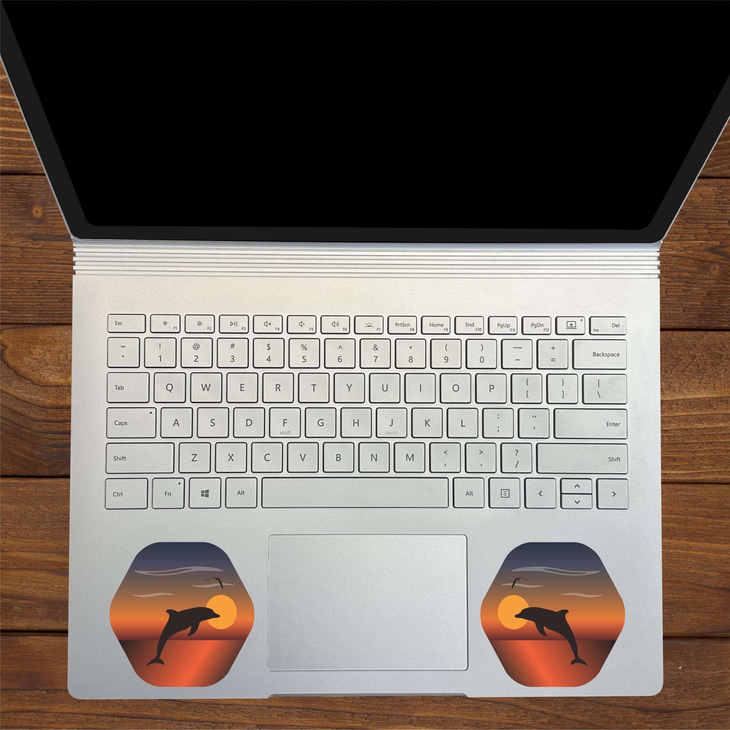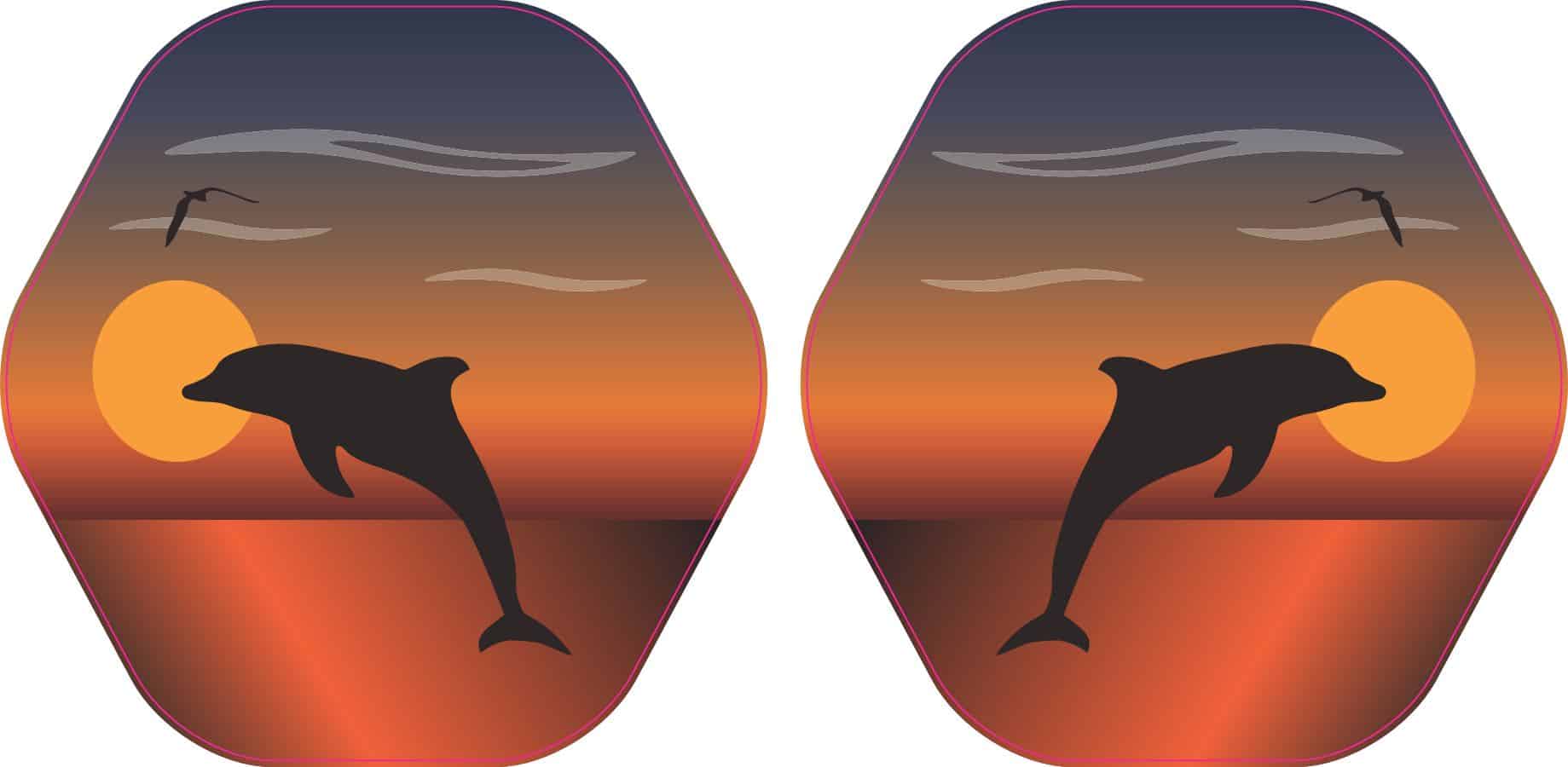 This is a set of 2 stickers. Each one measures 3 inches wide by 3 inches tall. Each one has an image of a dolphin breaching with a sunset in the background. These stickers are great for you laptop, cell phone, vehicle or any smooth flat surface. The pink line indicates where the sticker will be cut and will not be printed on the final product.