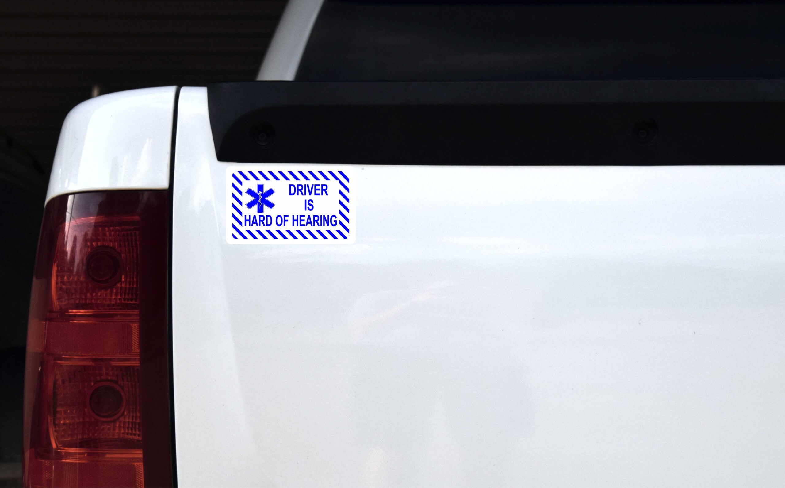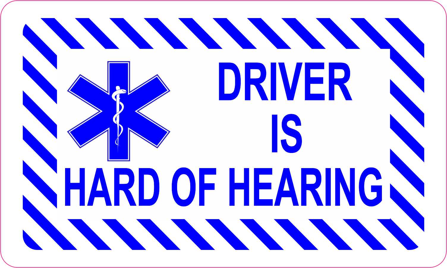 This magnet is 5 inches wide by 3 inches tall when applied.  The words, DRIVER IS HEARING IMPAIRED, are printed in blue letters on a white background.  The blue and white Star of Life is printed on the left side of the magnet.  The magnet’s border is decorated with white and blue, diagonal stripes.  The pink line in the image shows where the magnet is cut; the pink line is not printed on the magnet.  This quality-made product is durable and easily visible, making it an effective way to promote safe and alert driving.  However, it only attracts ferromagnetic metals.