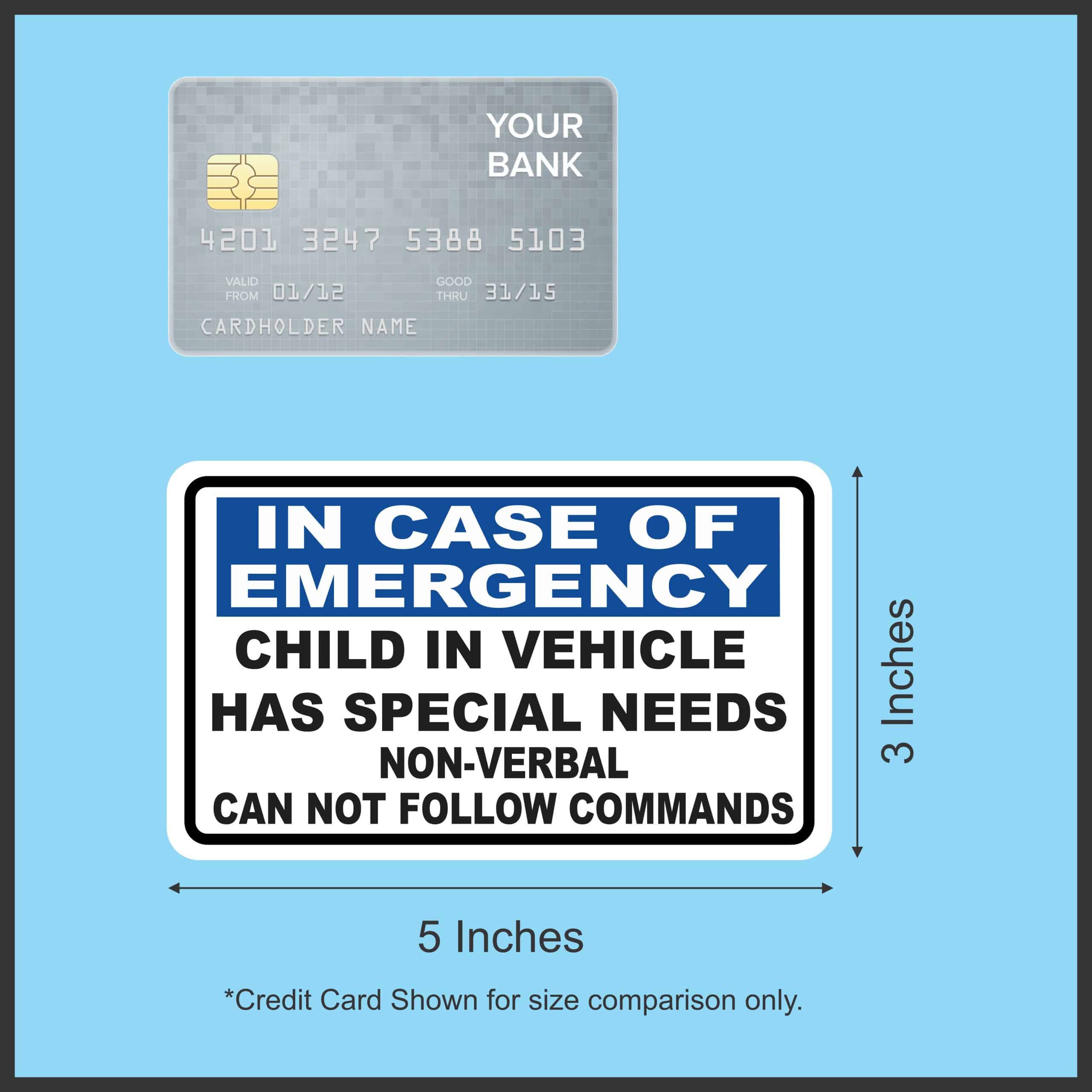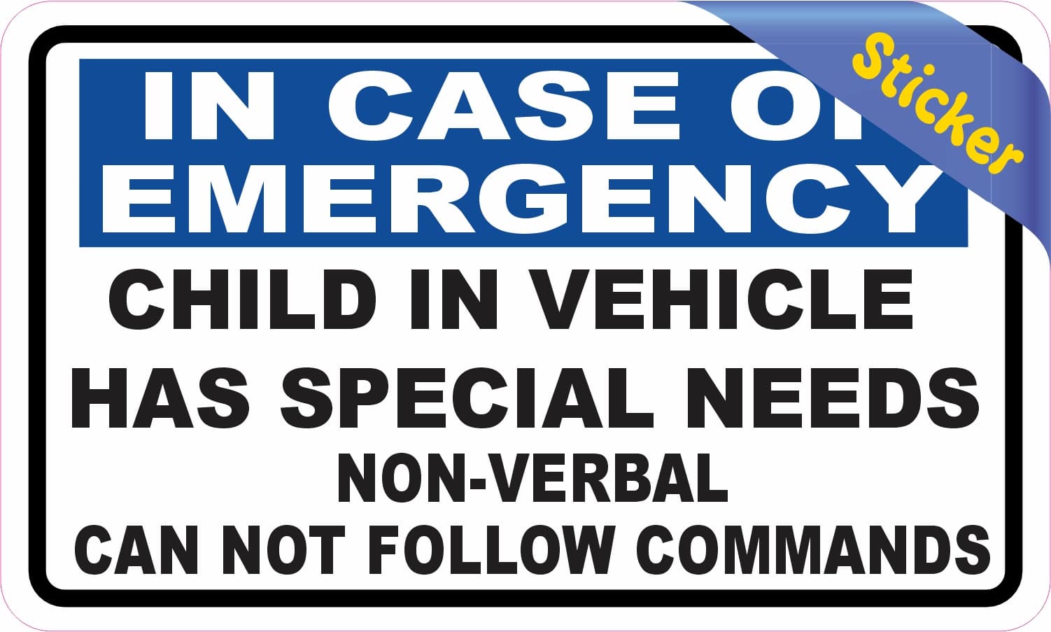 This sticker measures 5 inches wide and 3 inches tall. It has a white background and a black border. At the top of this sticker there is a blue banner with white text that says, IN CASE OF EMERGENCY. Below the banner in black text it says, CHILD IN VEHICLE HAS SPECIAL NEEDS NON-VERBAL CAN NOT FOLLOW COMMANDS. This sticker is an easy way to alert emergency workers of the needs of the child in the vehicle. It can be applied to any flat smooth surface. The pink line indicates where the sticker will be cut and will not be printed on the final product.