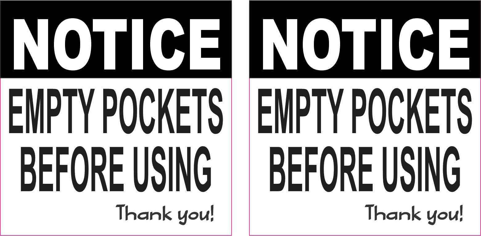 This product is a sheet of 2 square stickers. Each sticker is 2.5 inches wide by 2.5 inches tall when applied and features the word, NOTICE, in white letters on a black background near the top of the sticker. Below, the words, EMPTY POCKETS BEFORE USING Thank you!, are printed in black letters on a white background. The pink lines in the image show where the stickers are cut; the pink lines are not printed on the stickers. These quality-made products are durable and easily visible, making them ideal for display in a variety of settings and scenarios!