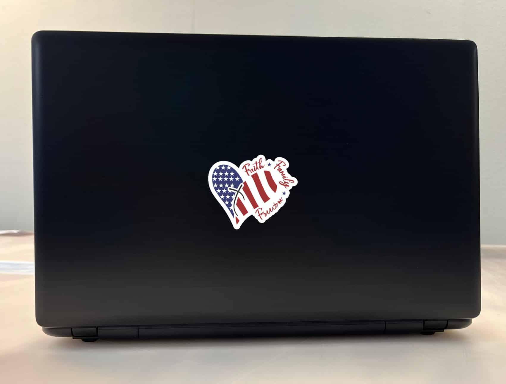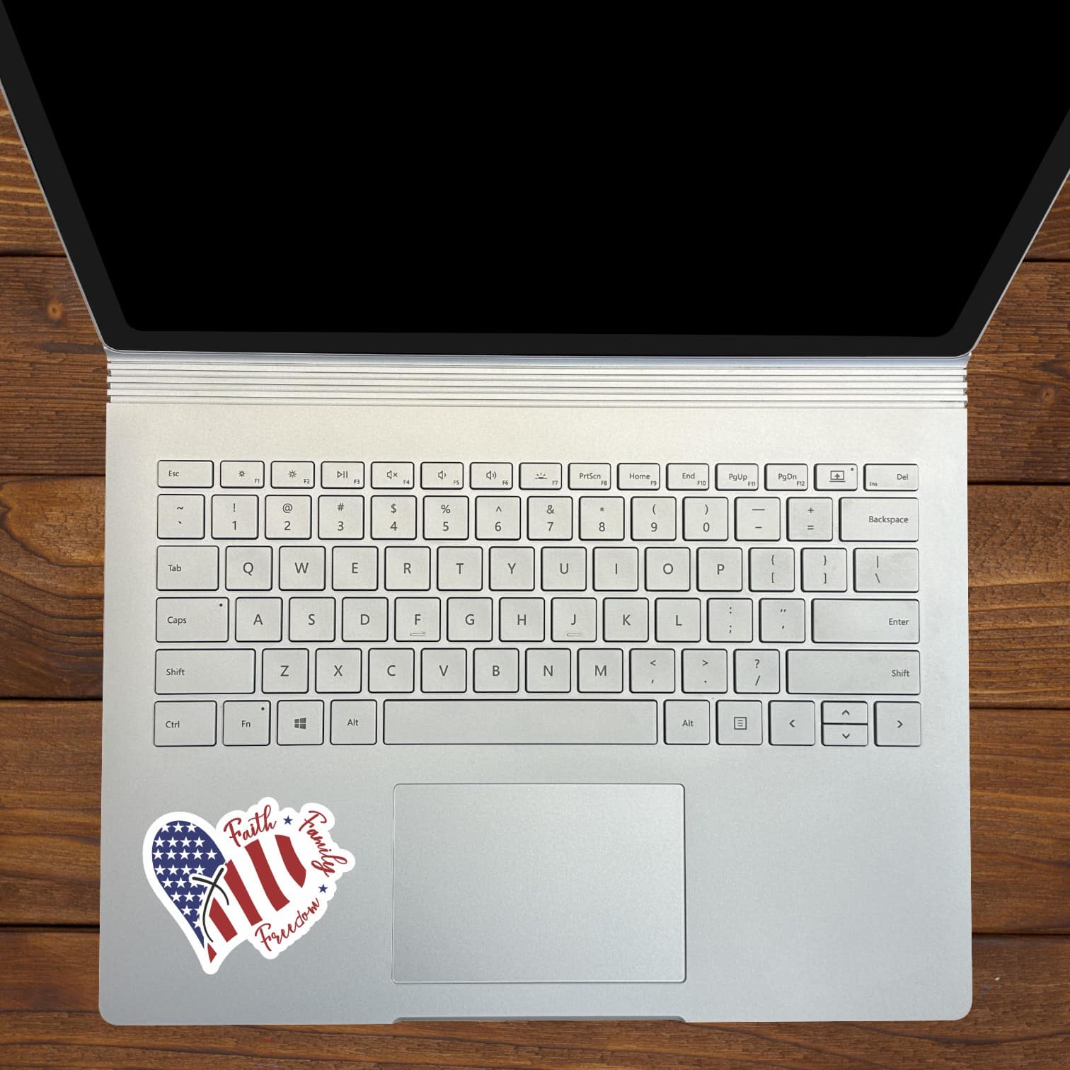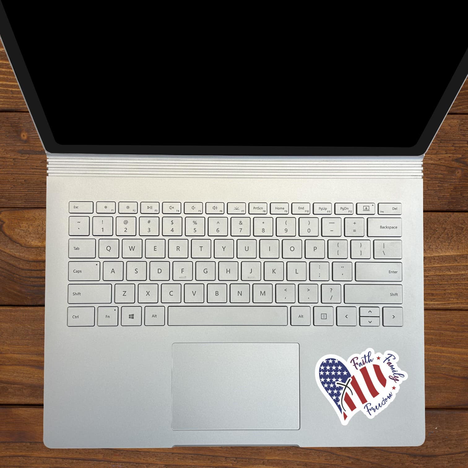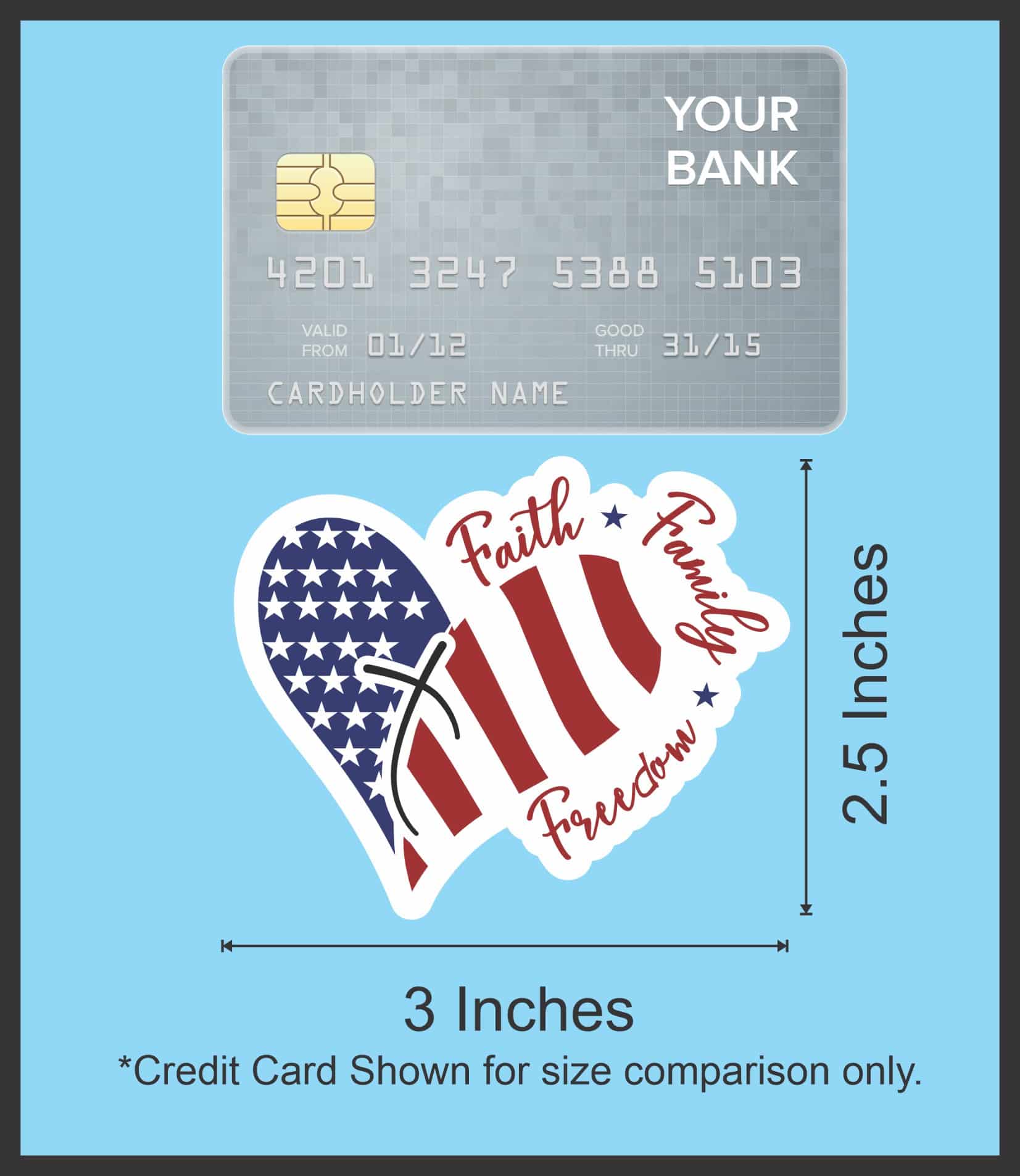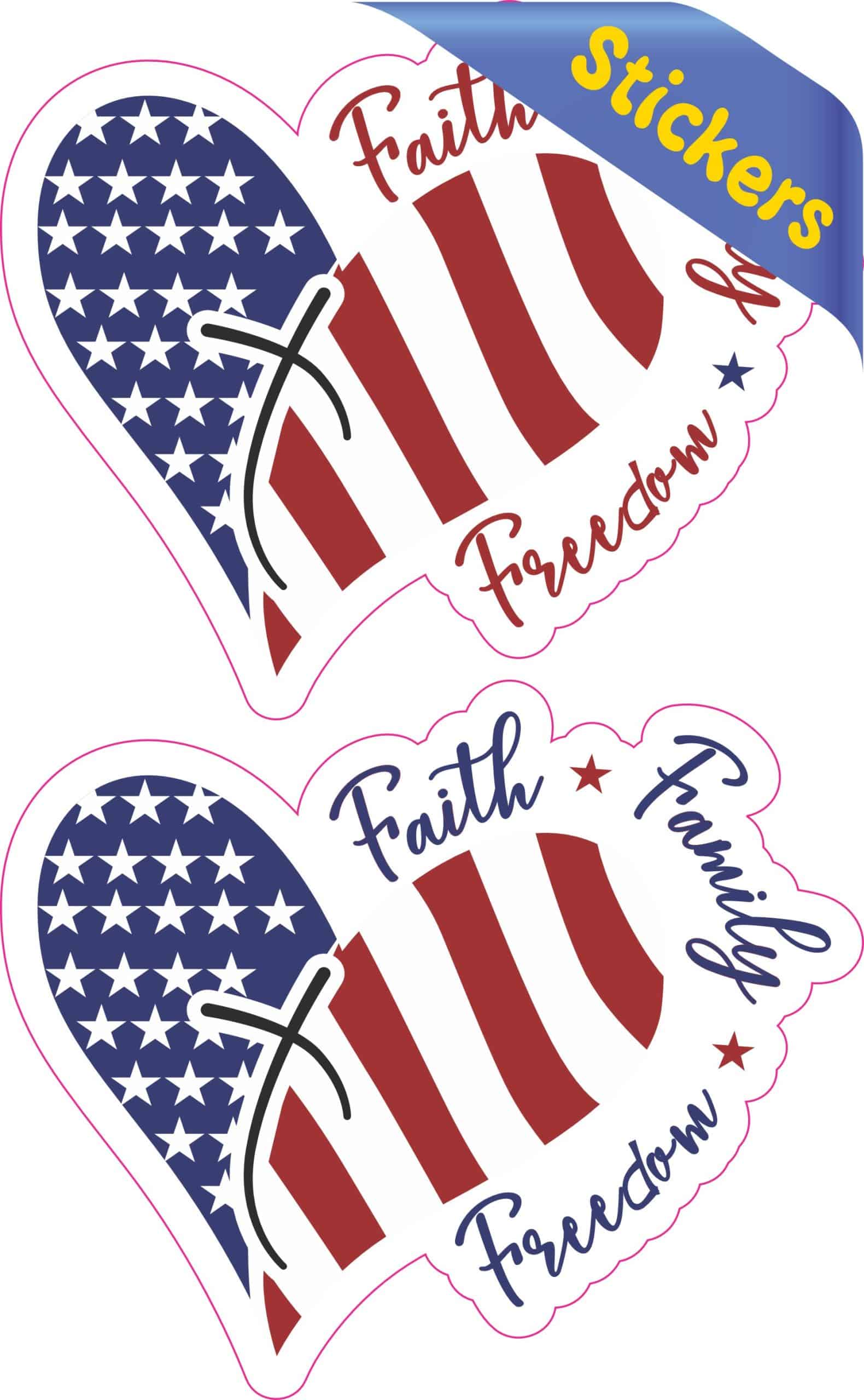 This is 1 sheet of 2 stickers, each one measures 3 inches wide by 2.5 inches tall. These patriotic heart-shaped vinyl stickers feature a beautiful American flag design with a white cross prominently displayed in the center. The inspirational words “Faith,” “Family,” and “Freedom” are elegantly scripted around the cross with decorative stars, creating a meaningful design that celebrates both patriotic spirit and Christian values.  Perfect for expressing your values on laptops, cars, water bottles, notebooks, or any smooth surface. The rich red, white, and blue colors combined with the heartfelt message make these stickers ideal for religious events, patriotic holidays, or everyday inspiration.