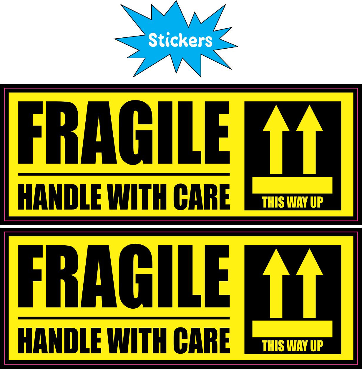 This is 1 sheet of 2 stickers. Each sticker measures 4 inches wide and 1.5 inches tall. They both have yellow backgrounds with black text on the left side that read, FRAGILE HANDLE WITH CARE. On the right side there is a black square with a yellow horizontal line under two up pointing arrows. Below the line is text that reads, THIS WAY UP. This sticker is perfect for labeling breakable objects. It can be applied to any flat smooth surface. The pink line indicates where the stickers will be cut and will not be printed on the final product.