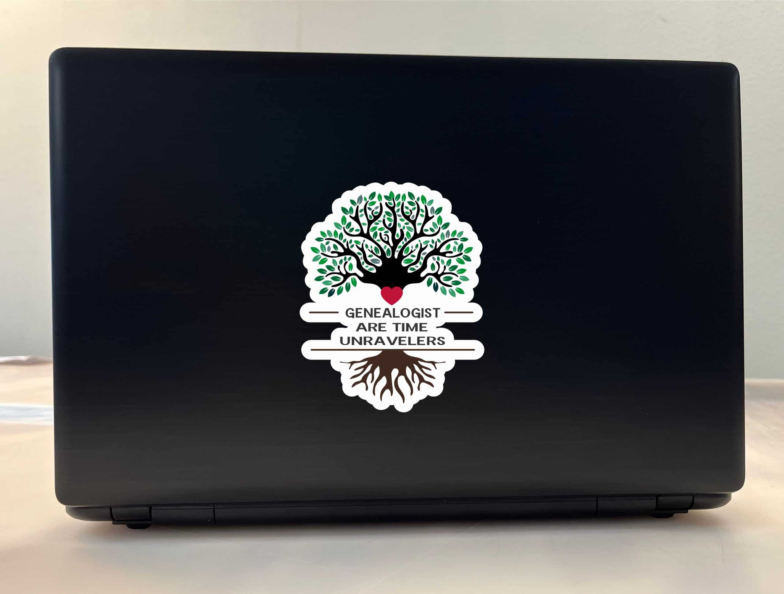 This sticker measures 4 inches wide and 5 inches tall. It is of a tree with black branches and green leaves and brown roots below the text. The text reads, GENEALOGIST ARE TIME UNRAVELERS, with a red heart above genealogist. This sticker is perfect for the genealogist in your life. It can be applied to any flat smooth surface. The pink line indicates where the sticker will be cut and will not be printed on the final product.