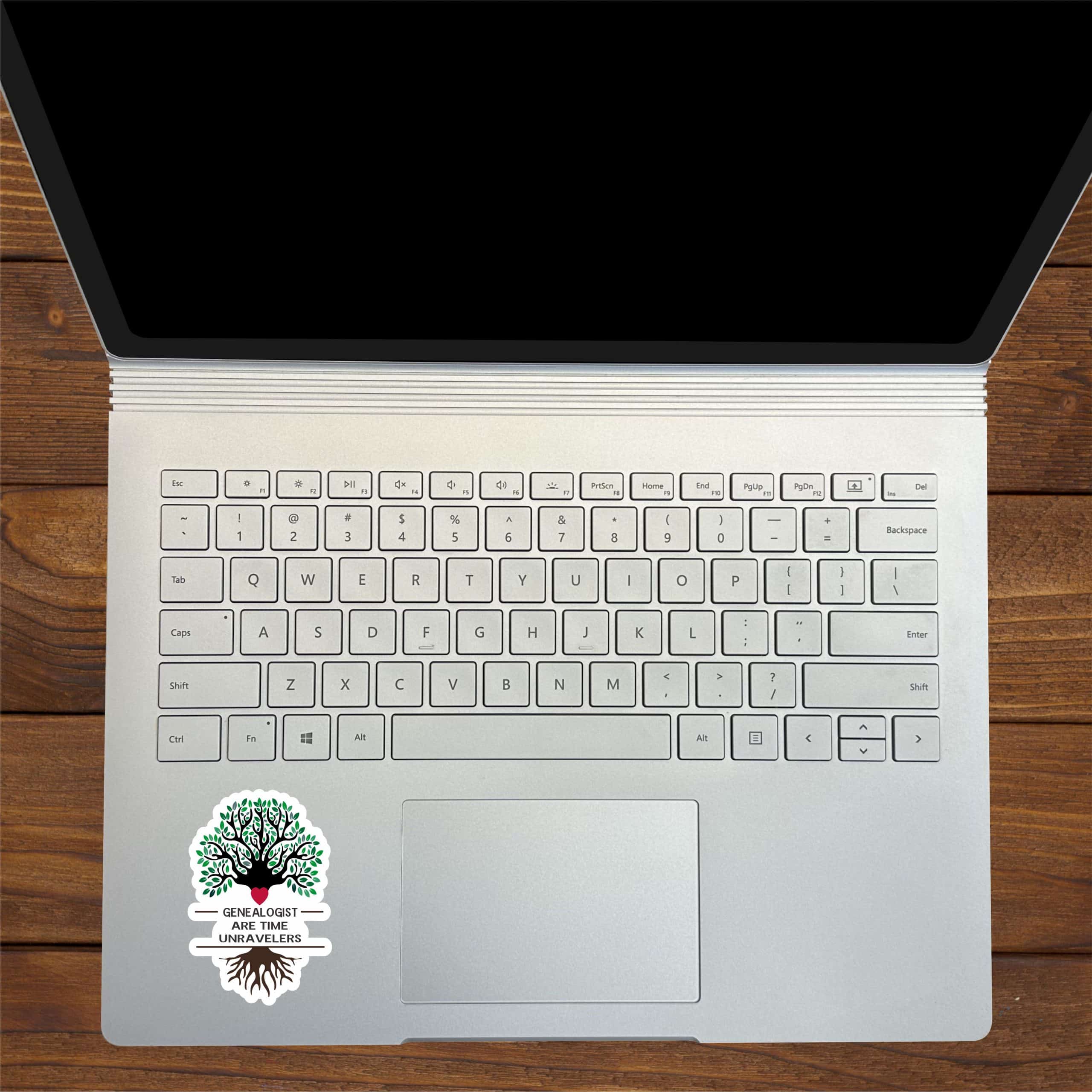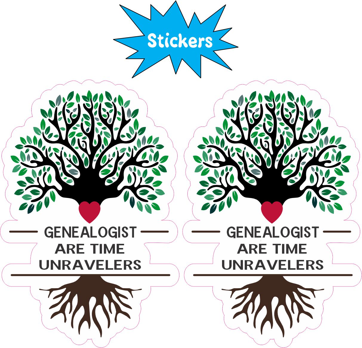 This is 1 sheet of 2 stickers. Each sticker measures 2 inches wide and 3 inches tall. They are of a tree with black branches and green leaves and brown roots below the text. The text reads, GENEALOGIST ARE TIME UNRAVELERS, with a red heart above genealogist. These stickers are perfect for the genealogist in your life. They can be applied to any flat smooth surface. The pink line indicates where the stickers will be cut and will not be printed on the final product.