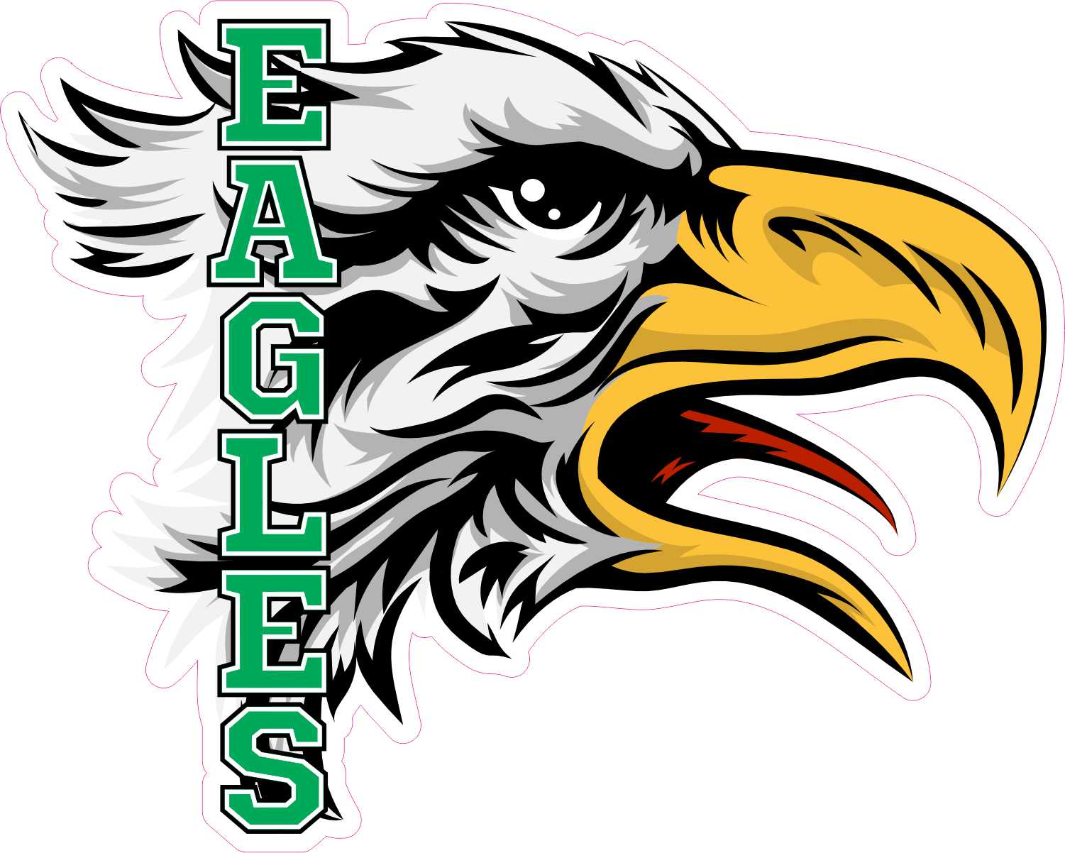 This product includes a single sticker. The sticker features a right-facing eagle head mascot. The word, EAGLES, is printed vertically down the mascot head in green text with a white and black outline. This sticker is cut with a slight contour, so minimal white border will remain after application. The pink line in the image shows where the sticker is cut; however, the pink line is not printed on the sticker. This carefully crafted product is a great way to share your eagle spirit! It can be proudly displayed on vehicles, laptops, luggage, and other hard, smooth surfaces.