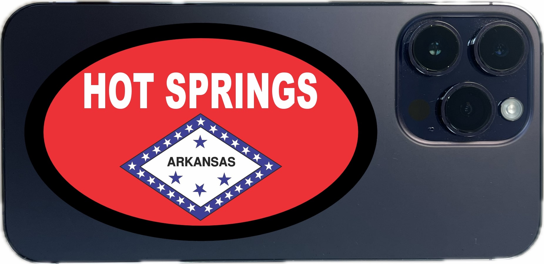 This oval sticker measures 4 inches wide by 2.5 inches tall. It has the Arkansas flag as the background with the words Hot Springs in white across the front. This is a great sticker to document your journey to the great state of Arkansas or just to show pride in your home town. The pink line indicates where the sticker will be cut and will not be printed on the final product.