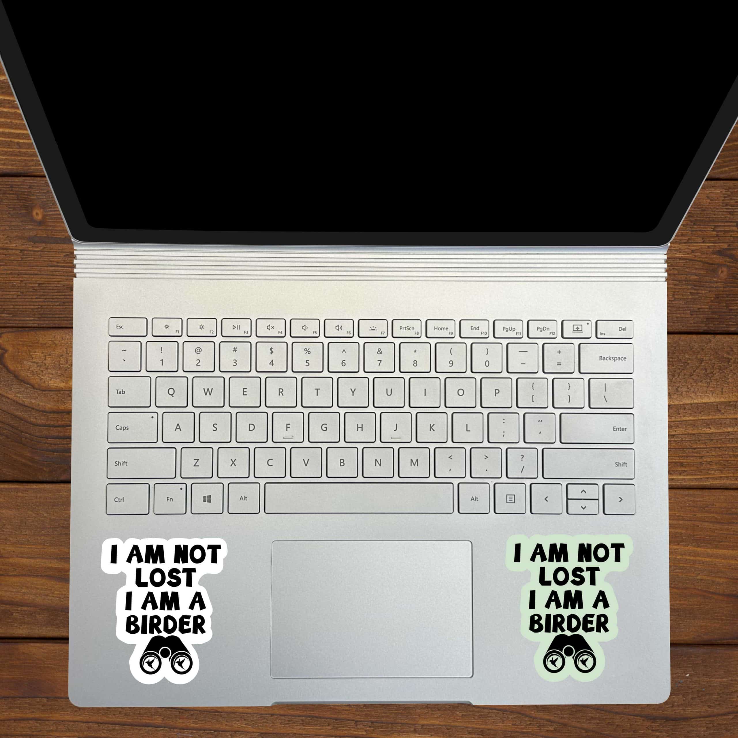 This product is a sheet of 2 stickers, each sticker is 2.6 inches wide by 3 inches tall when applied.  The background on one sticker is white in color while the other sticker depicts a light green background. On the sticker the words, I AM NOT LOST I AM A BIRDER, appear in black letters. A set of black binoculars appears beneath the text with silhouettes of birds in the binocular lenses. The pink lines in the image show where the stickers are cut; however, the pink lines are not printed on the stickers. This carefully crafted product is a witty way to share your love for birdwatching! These stickers can be placed on laptops, cups and tumblers, vehicles, and other flat, hard surfaces!