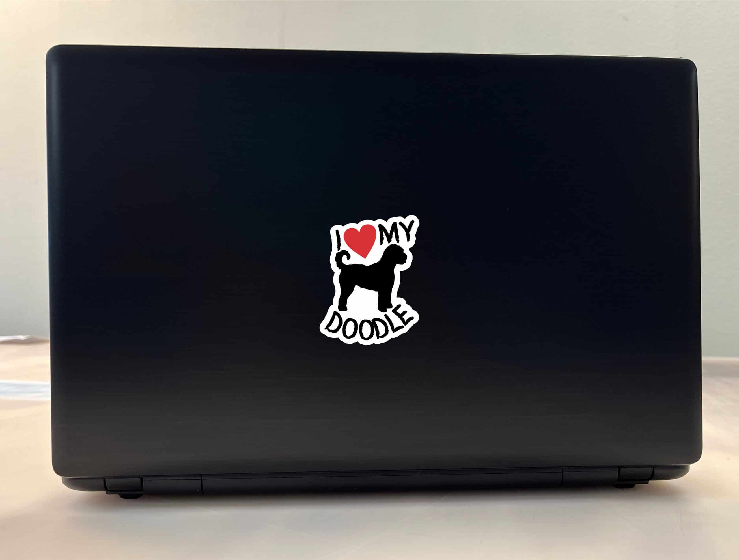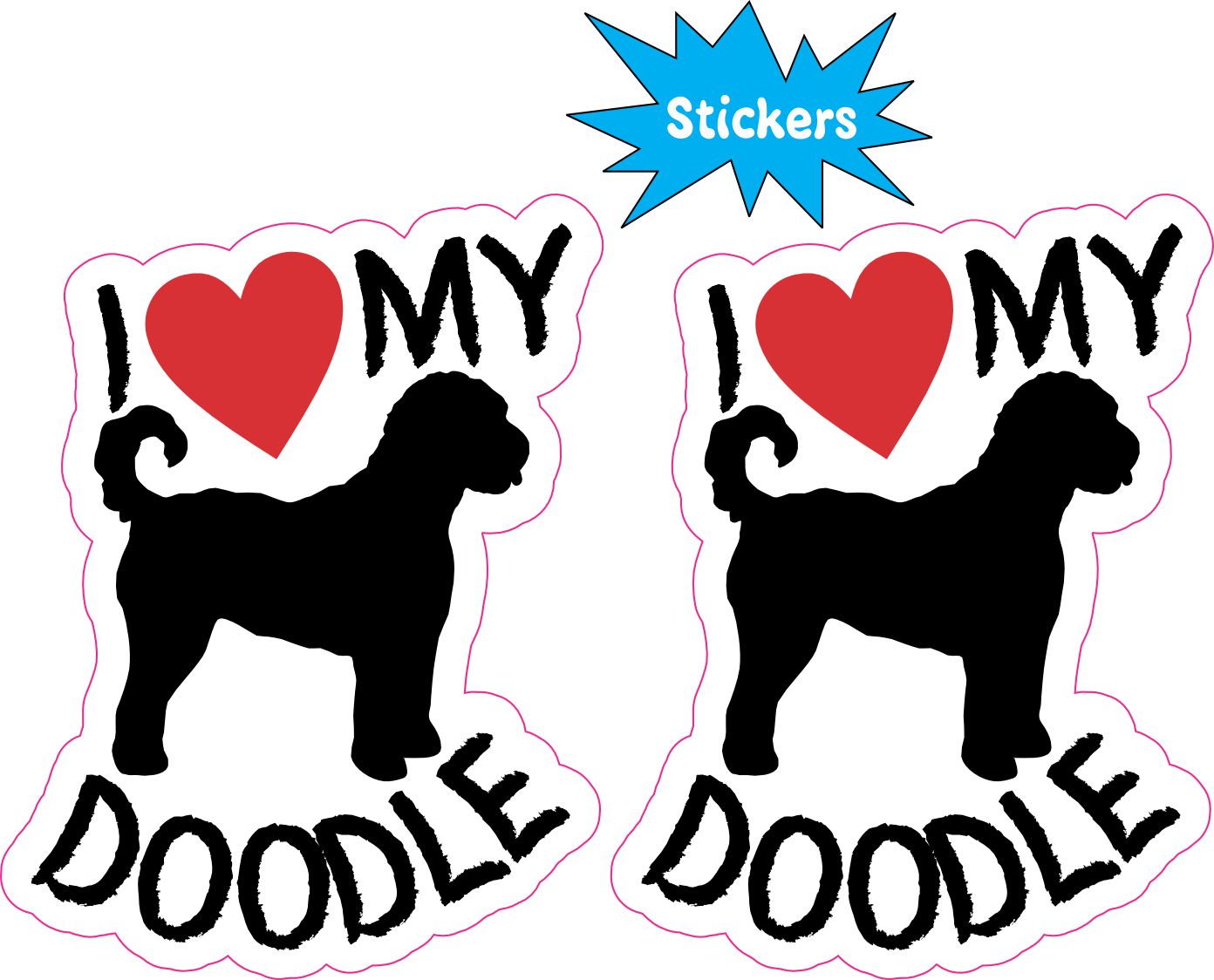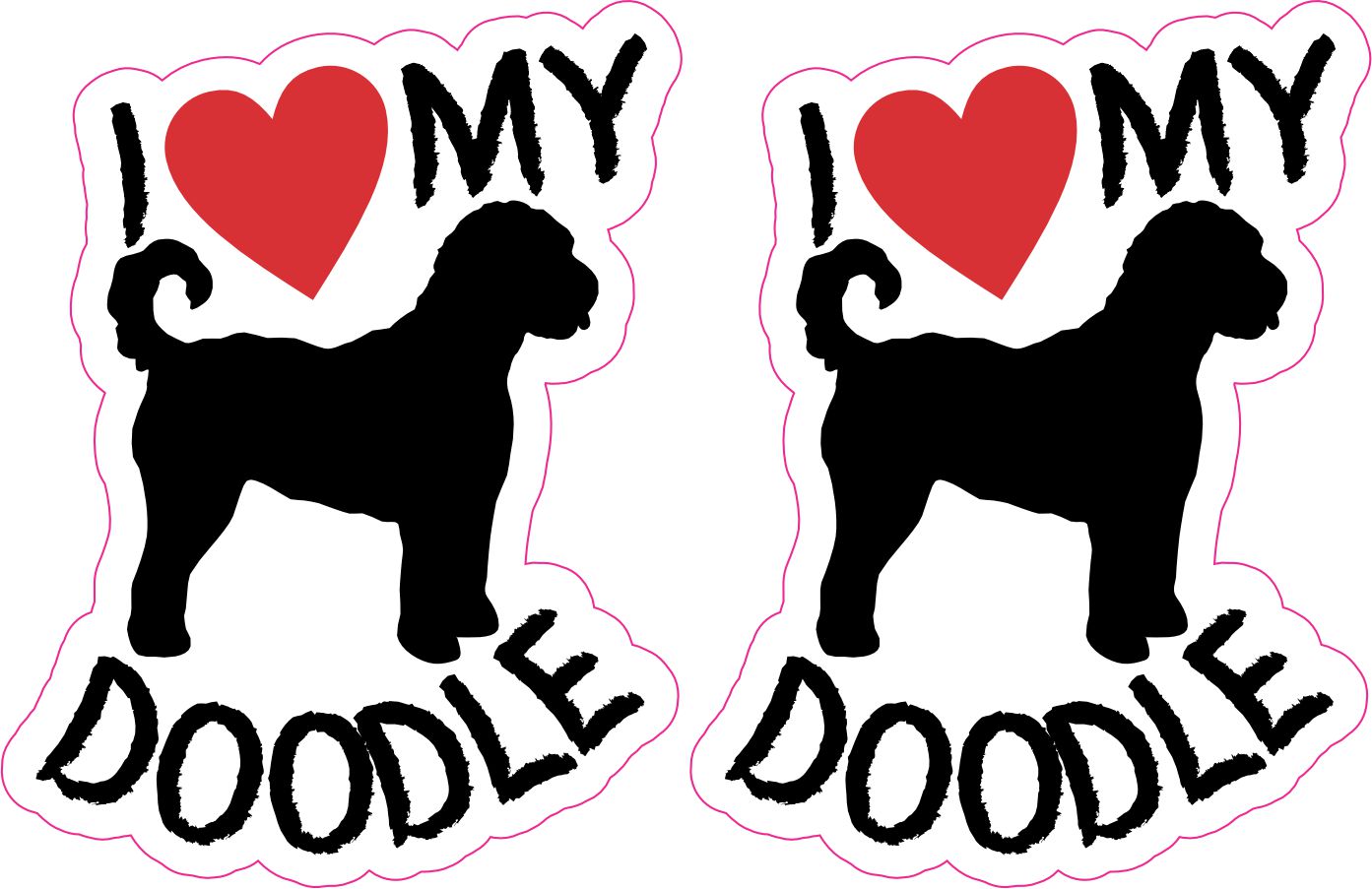 This is 1 sheet of 2 stickers. Each sticker measures 2.3 inches wide and 3 inches tall. In black text they both say, I heart MY DOODLE, with a red heart. In the middle of the stickers there is the silhouette of a doodle in black. This is the perfect sticker for every doodle lover. They can be applied to any flat smooth surface. The pink line indicates where the stickers will be cut and will not be printed on the final product.