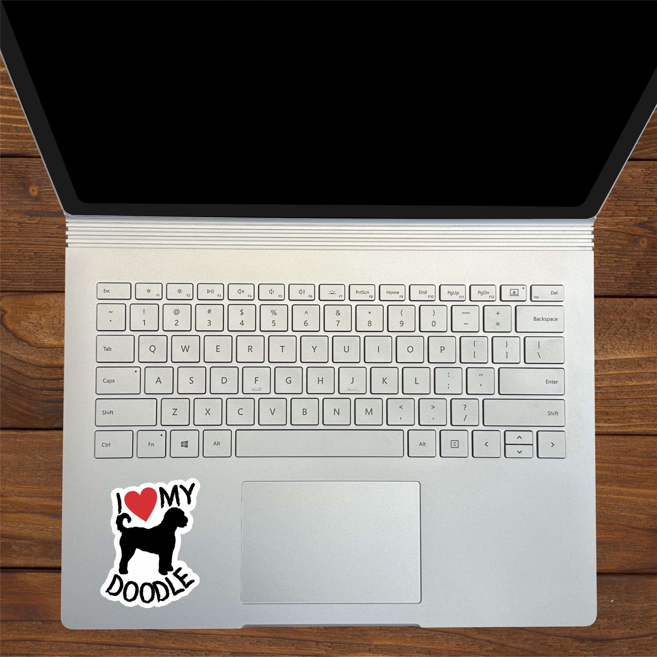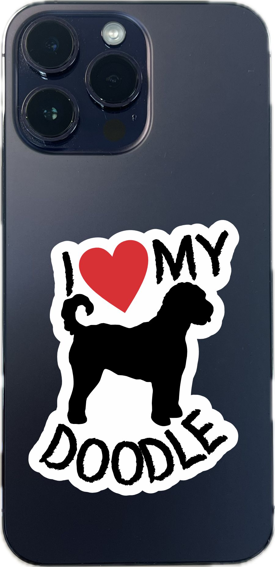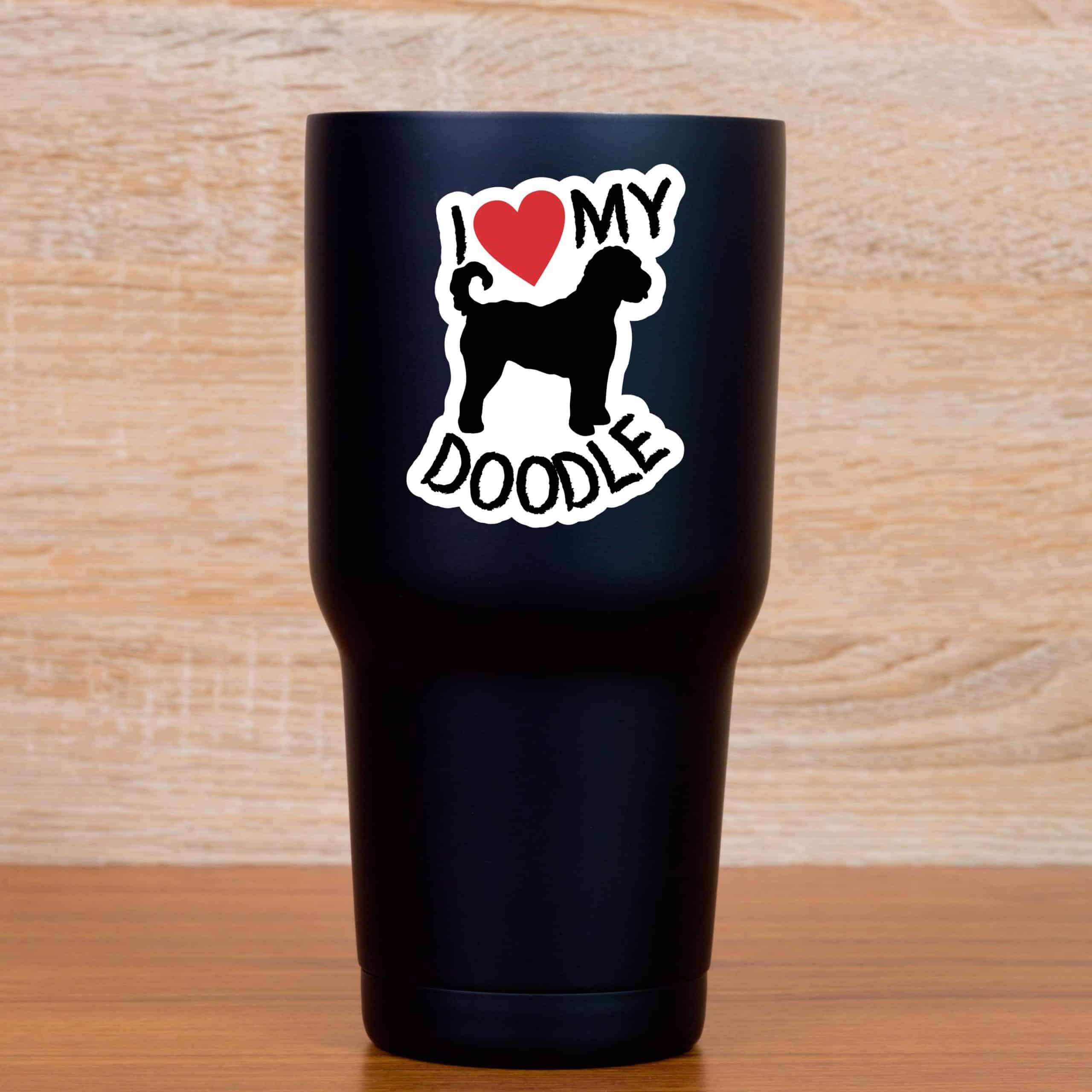 This is 1 sheet of 2 stickers. Each sticker measures 2.3 inches wide and 3 inches tall. In black text they both say, I heart MY DOODLE, with a red heart. In the middle of the stickers there is the silhouette of a doodle in black. This is the perfect sticker for every doodle lover. They can be applied to any flat smooth surface. The pink line indicates where the stickers will be cut and will not be printed on the final product.
