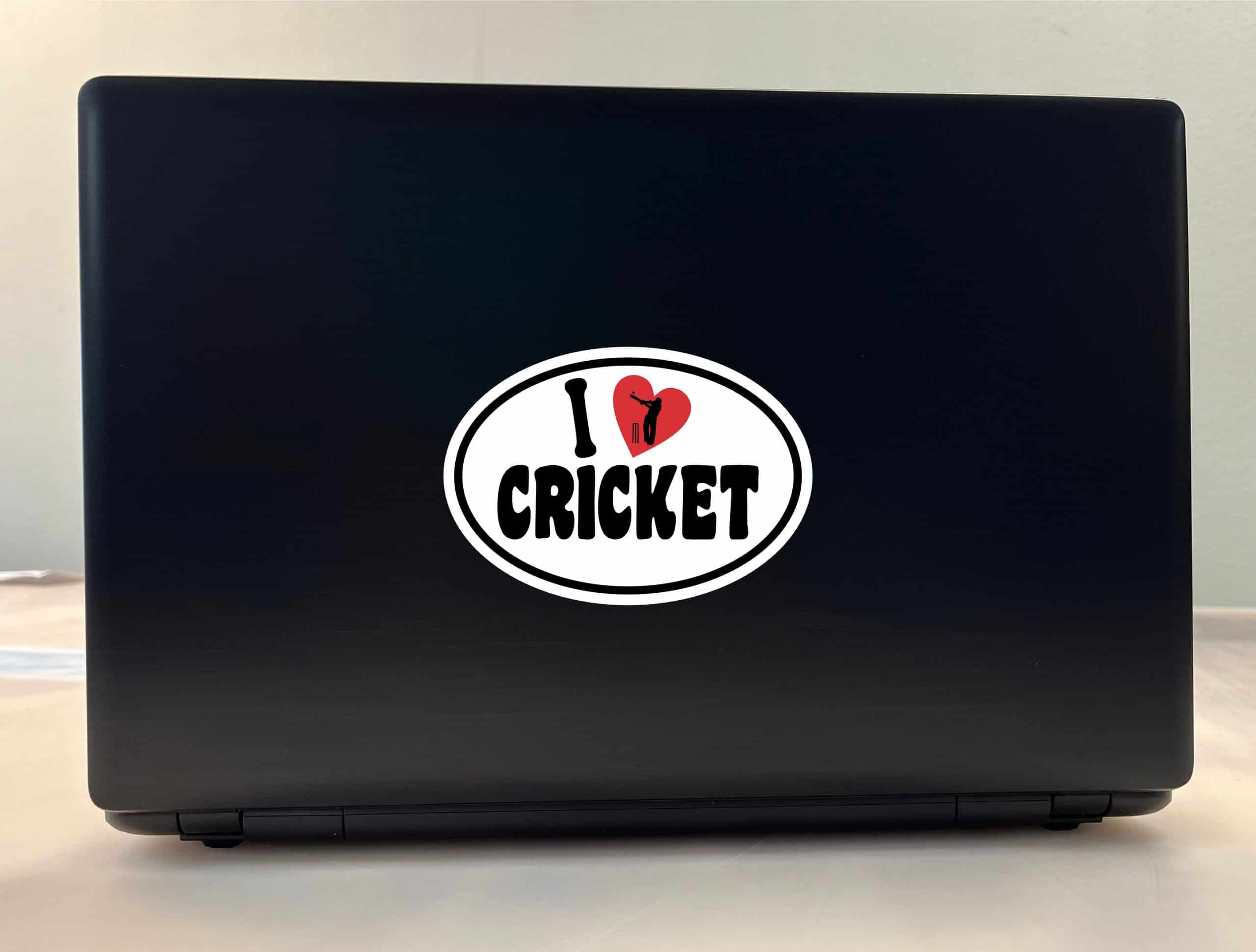 This sticker measures 5 inches wide by 3.5 inches tall (127.0 mm x 88.9 mm). Express your love for cricket with this eye-catching oval vinyl sticker featuring bold black text “I CRICKET” with a red heart containing a cricket batsman silhouette and wickets. The classic design combines passion and sport in one striking decal.