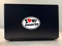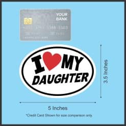 Express your parental love with this oval I Love My Daughter vinyl sticker featuring a red heart. Perfect for cars, laptops, and more.