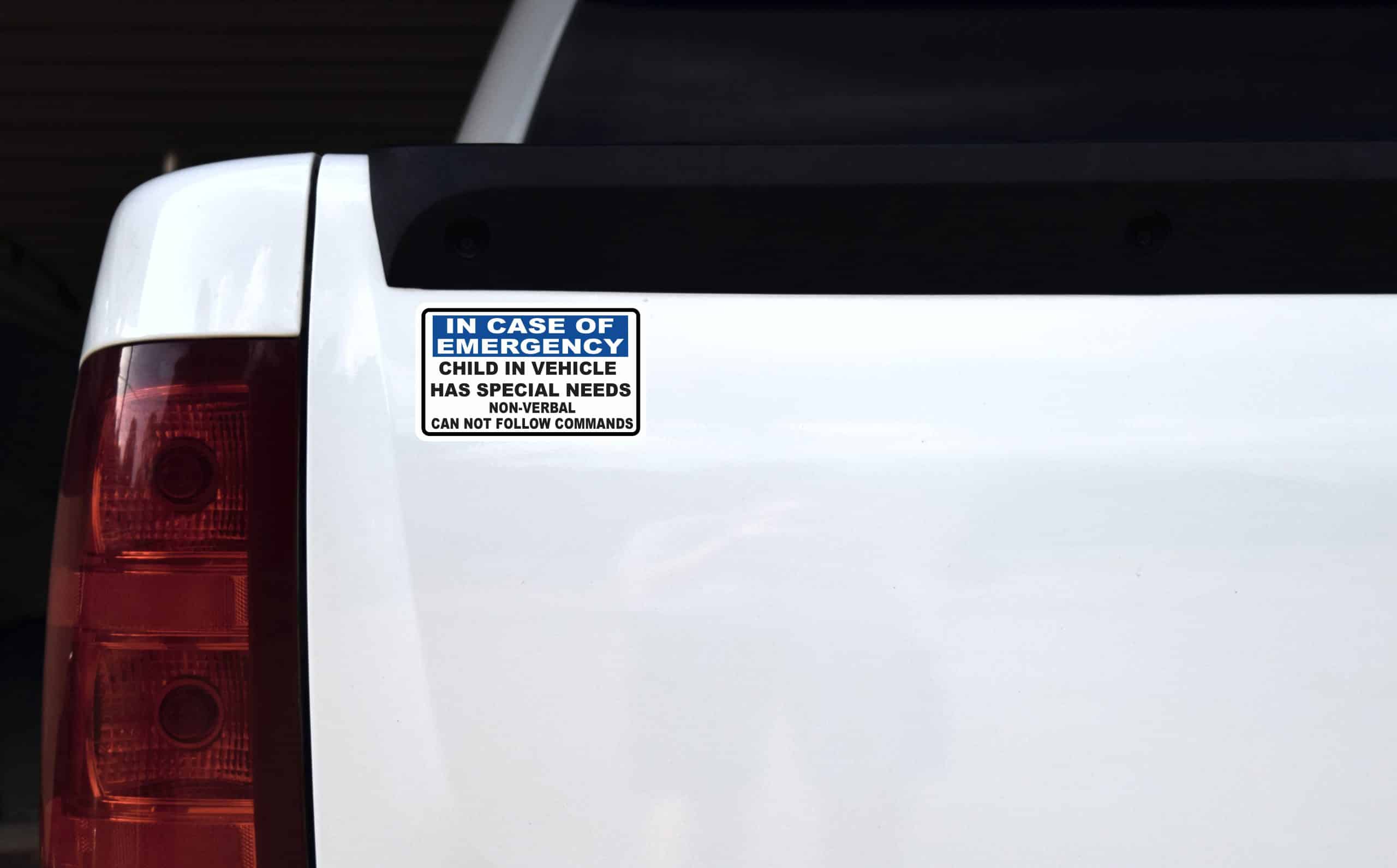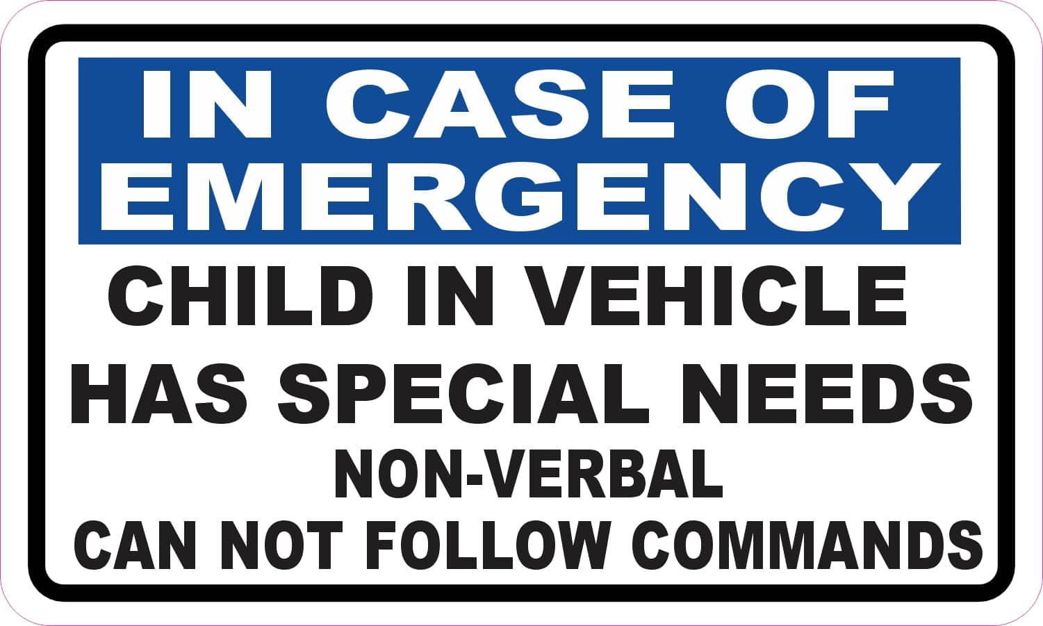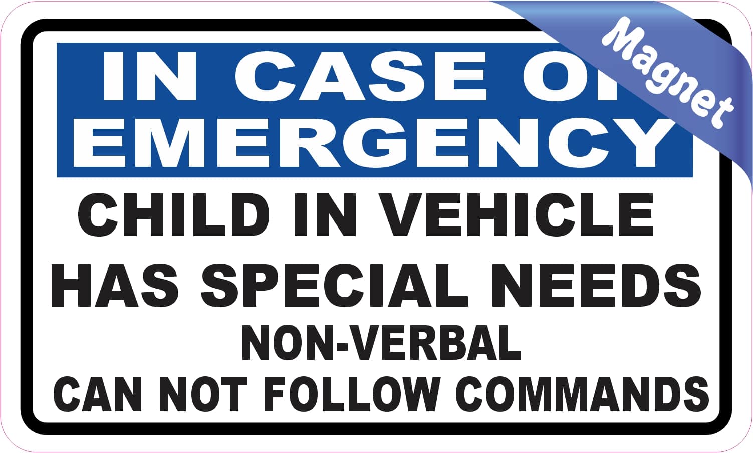 This magnet measures 5 inches wide and 3 inches tall. It has a white background and a black border. At the top of this magnet there is a blue banner with white text that says, IN CASE OF EMERGENCY. Below the banner in black text it says, CHILD IN VEHICLE HAS SPECIAL NEEDS NON-VERBAL CAN NOT FOLLOW COMMANDS. This magnet is an easy way to alert emergency workers of the needs of the child in the vehicle. It can be applied to any flat smooth magnetic surface. The pink line indicates where the magnet will be cut and will not be printed on the final product.