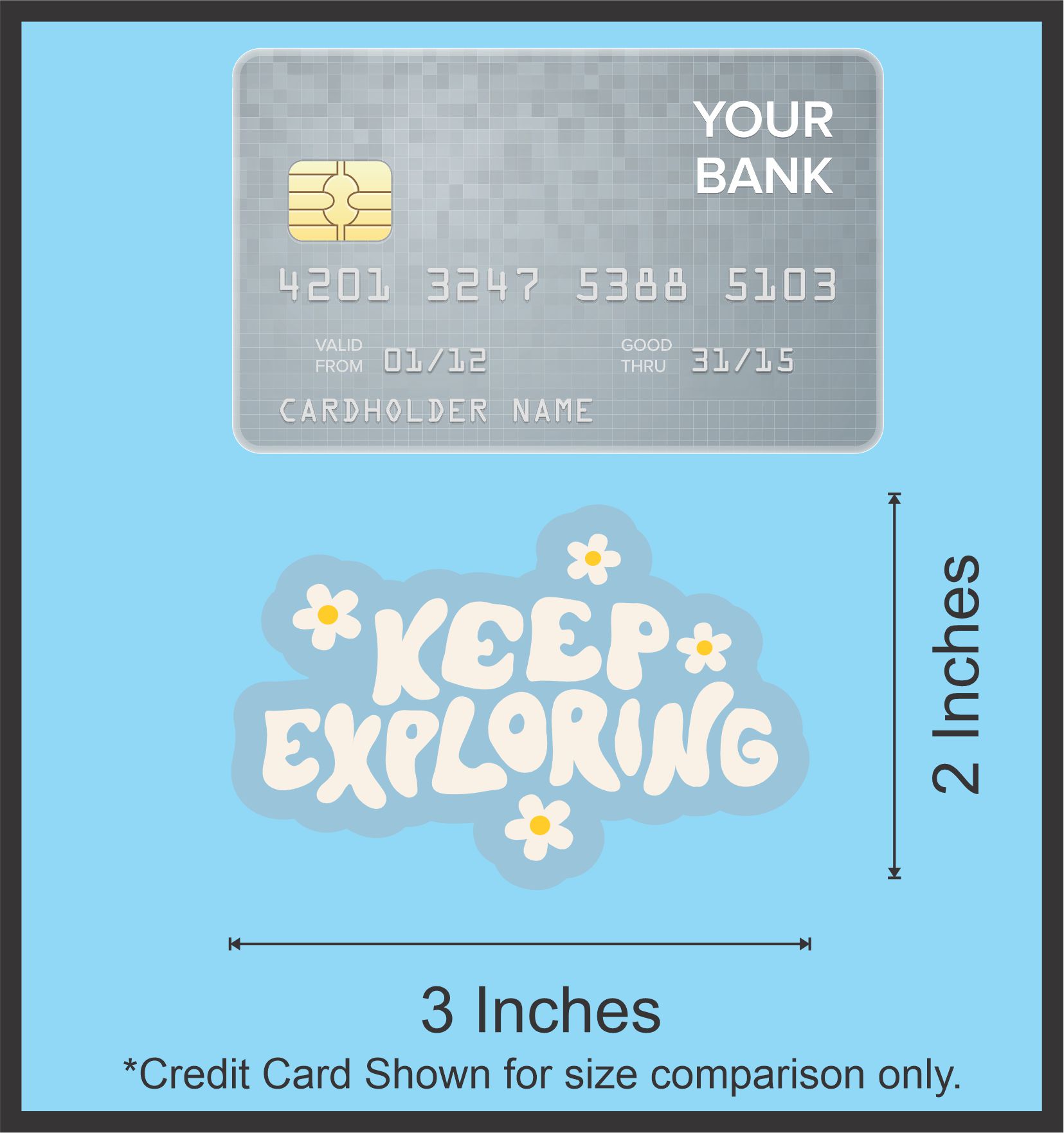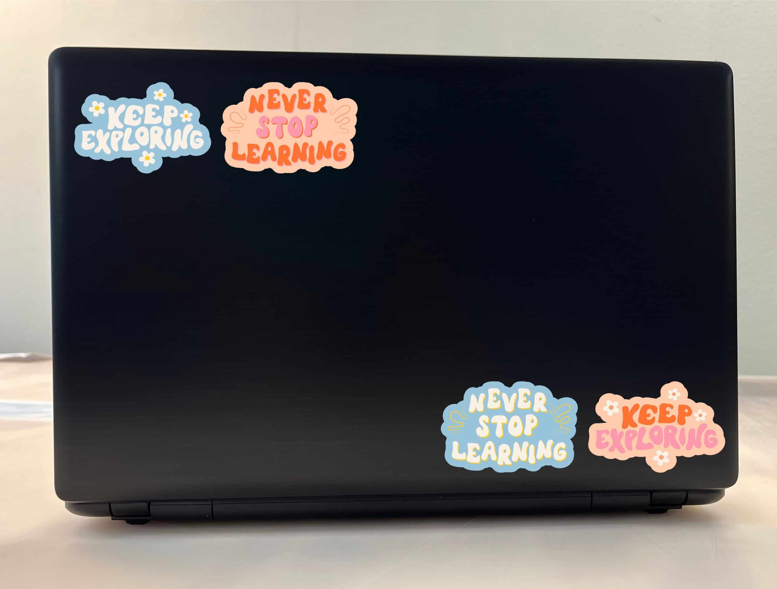 This is 1 sheet of 4 stickers, each one measures 3 inches wide by 2 inches tall (76.2 mm x 50.8 mm). These inspirational vinyl stickers feature uplifting messages including ‘Keep Exploring’ and ‘Never Stop Learning’ in a charming retro design. The collection showcases beautiful cloud-like backgrounds in soft blue and coral pink tones, adorned with delicate white daisy accents that add a whimsical touch.