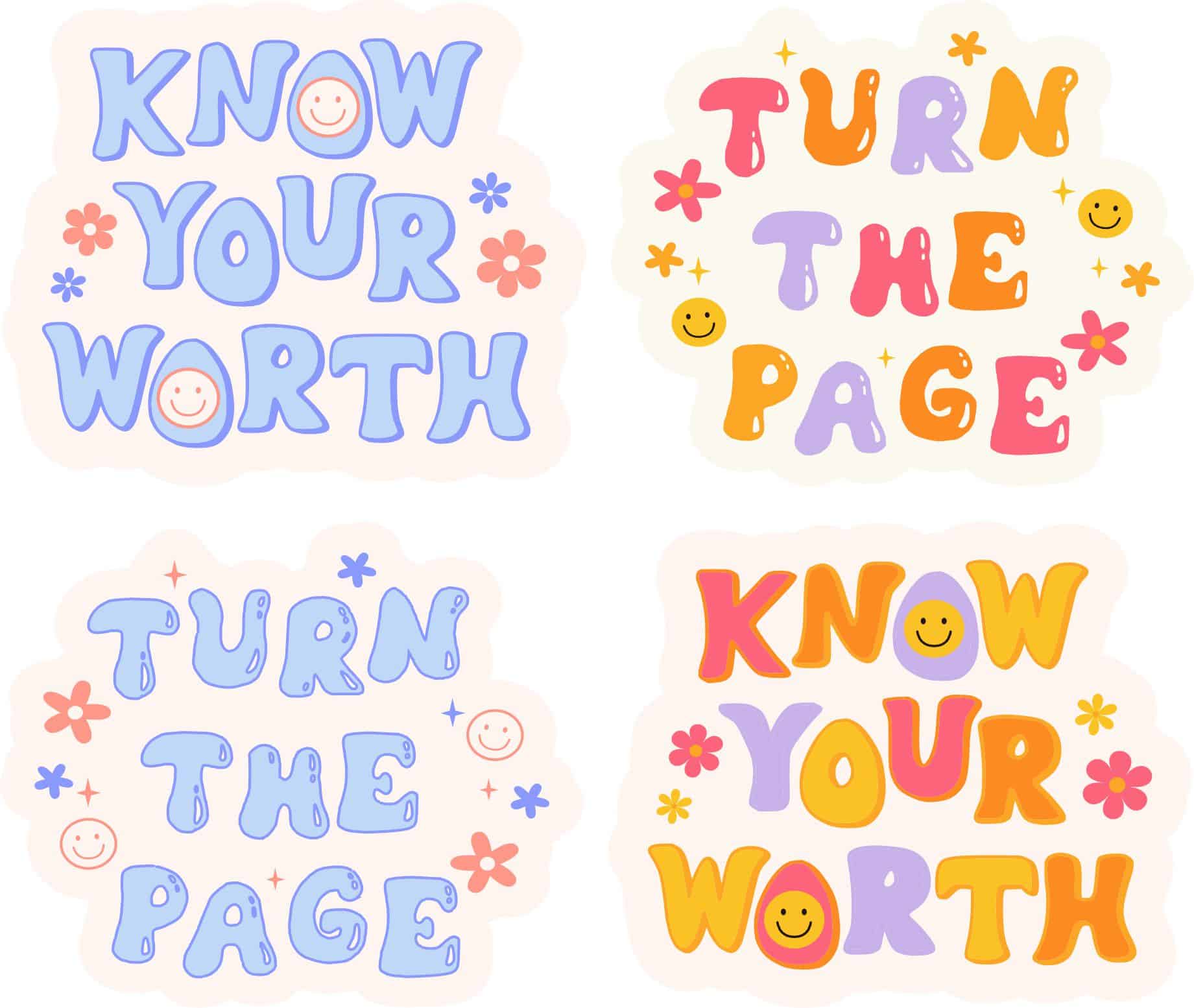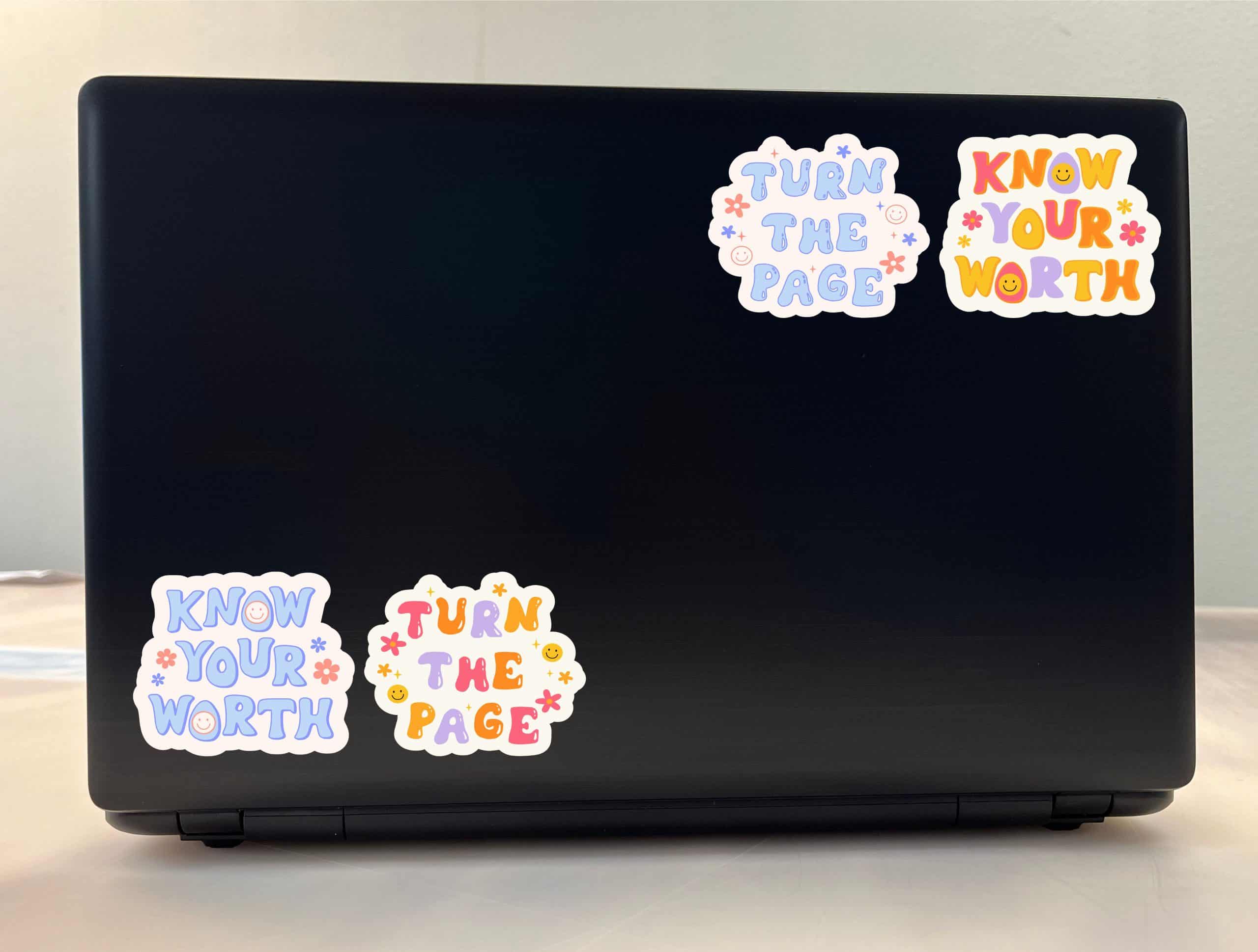 This is 1 sheet of 4 stickers, each one measures 3 inches wide by 2.5 inches tall (76.2 mm x 63.5 mm). These vibrant inspirational vinyl stickers feature uplifting messages including “Know Your Worth,” “Turn the Page,” and “Know Your Worth” in cheerful bubble letters with smiley faces and decorative flower accents. Each sticker showcases a delightful color palette of blues, purples, oranges, pinks, and yellows that will brighten any surface. Crafted from premium air release vinyl with standard removable adhesive, these stickers are laminated with UV resistant PVC for superior durability. They are completely waterproof and weatherproof, resisting fading and cracking over time. The air release technology ensures easy application without bubbles, while the removable adhesive allows for repositioning during initial placement. These motivational stickers are perfect for decorating laptops, water bottles, notebooks, planners, phone cases, mirrors, or any smooth surface that could use an uplifting message. Made in the USA with high-quality materials, these stickers maintain their vibrant colors and strong adhesion in various weather conditions. Note that while easily removable, these are designed for one-time use. Whether you’re looking to inspire yourself daily or give encouraging gifts to friends, these cheerful motivational stickers spread positivity wherever they’re placed.