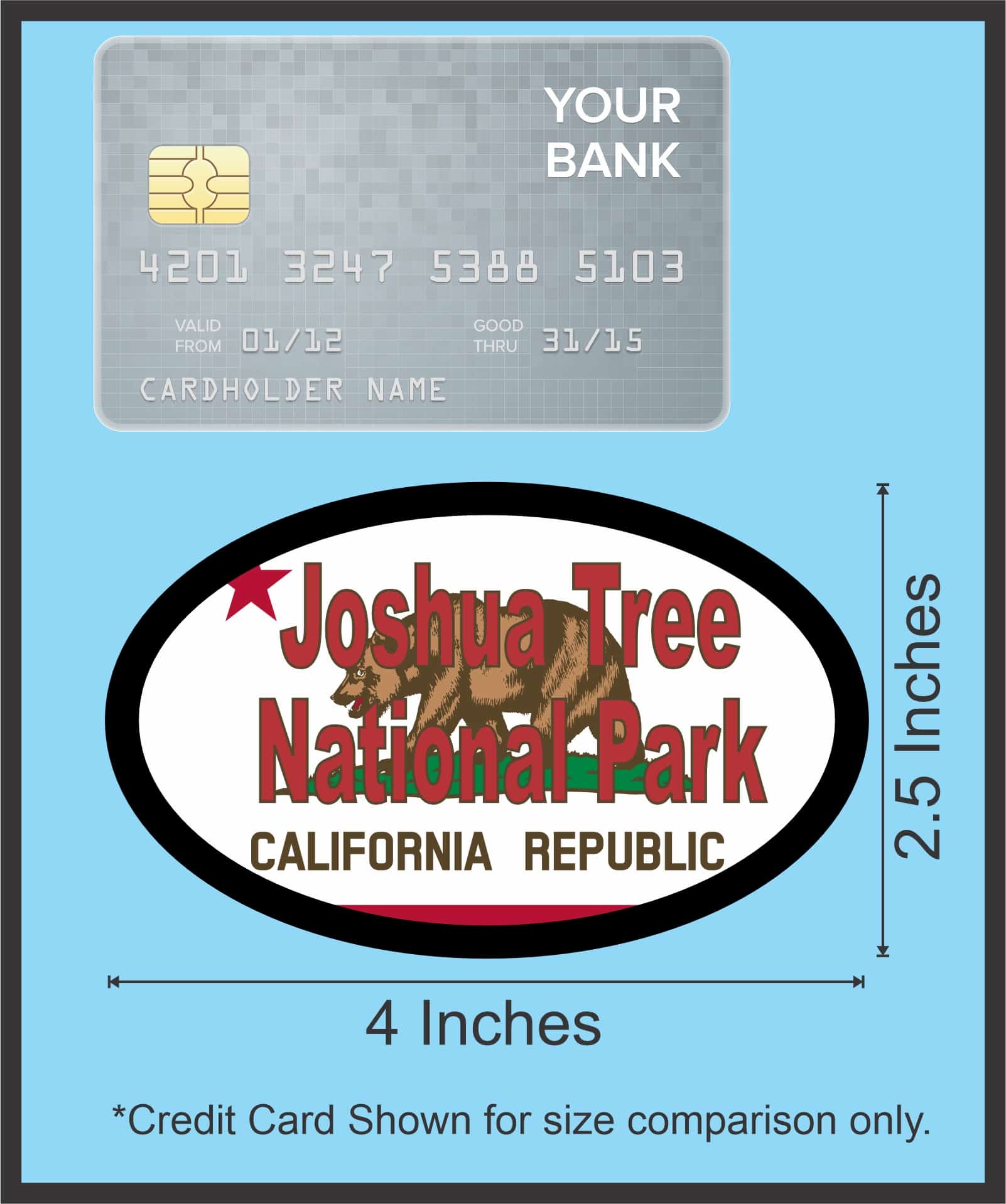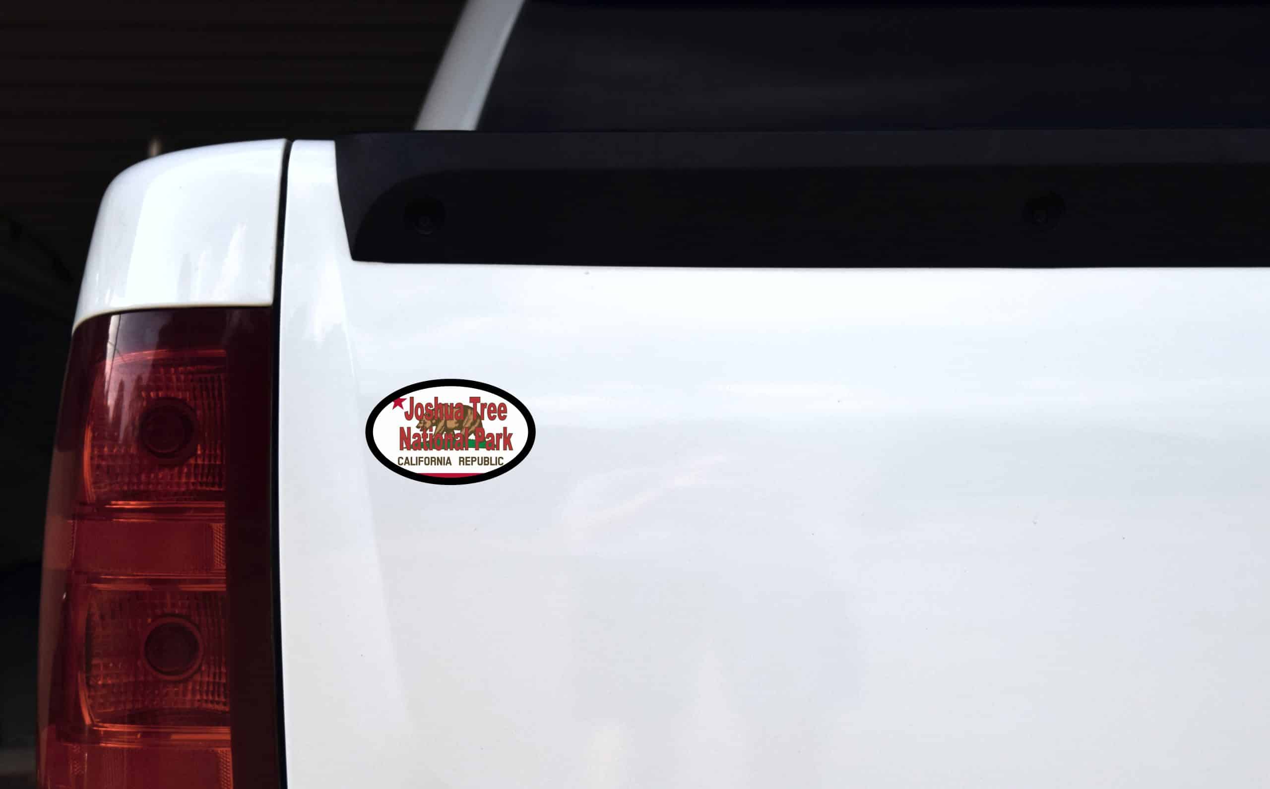 This sticker measures 4 inches wide by 2.5 inches tall. It is cut in the shape of an oval with the California Flag as the background. In the foreground are the words Joshua Tree National Park in Red. This is a great way to remember your trip to Joshua Tree National Park. The pink line indicates where the sticker will be cut and will not be printed on the final product.