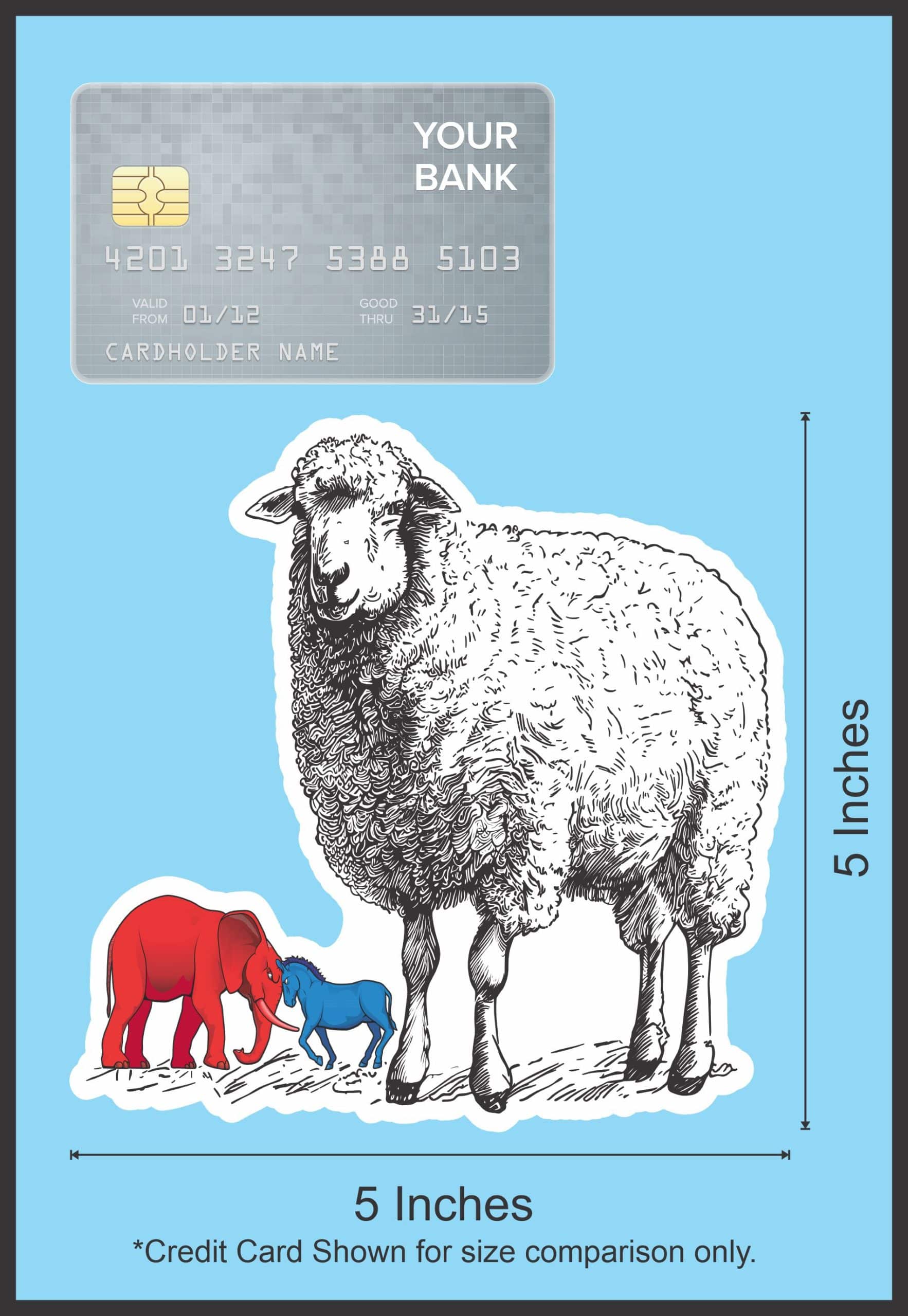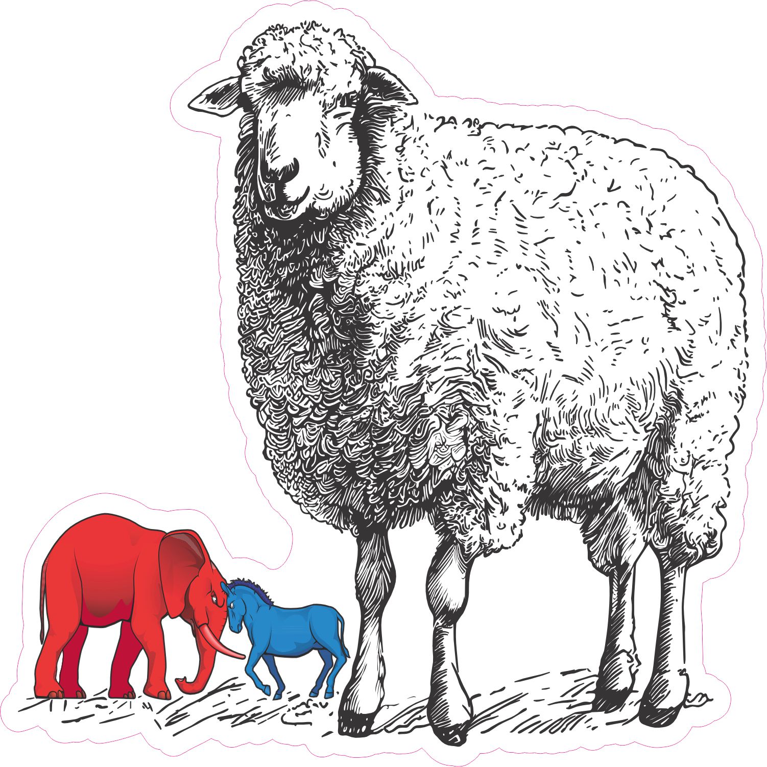 This sticker measures 5 inches wide and 5 inches tall. It depicts the two main American political parties as a red elephant and a blue donkey. Standing to the left of a lamb. The lamb is larger than the political parties. This is meant to symbolize that Jesus is greater than both parties. This sticker can be applied to any flat smooth surface. The pink line indicates where the sticker will be cut and will not be printed on the final product.