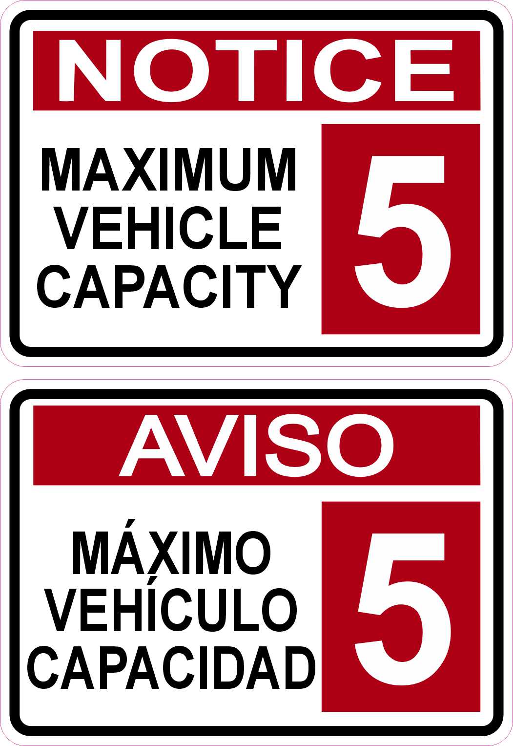 This is 1 sheet of 2 stickers. Each sticker measures 3.5 inches wide and 2.5 inches tall. The first sticker is in English a red banner at the top that says, NOTICE, in a white text. Below that the background is white with black text that says, MAXIMUM VEHICLE CAPACITY, with a red square to the right of the text with a white 5 inside of it. The second sticker is in Spanish a red banner at the top that says, AVISO, in a white text. Below that the background is white with black text that says, MAXIMO VEHICULO CAPACIDAD, with a red square to the right of the text with a white 5 inside of it. These stickers are easy to read! They can be applied to any flat smooth surface. The pink line indicates where the stickers will be cut and will not be printed on the final product.