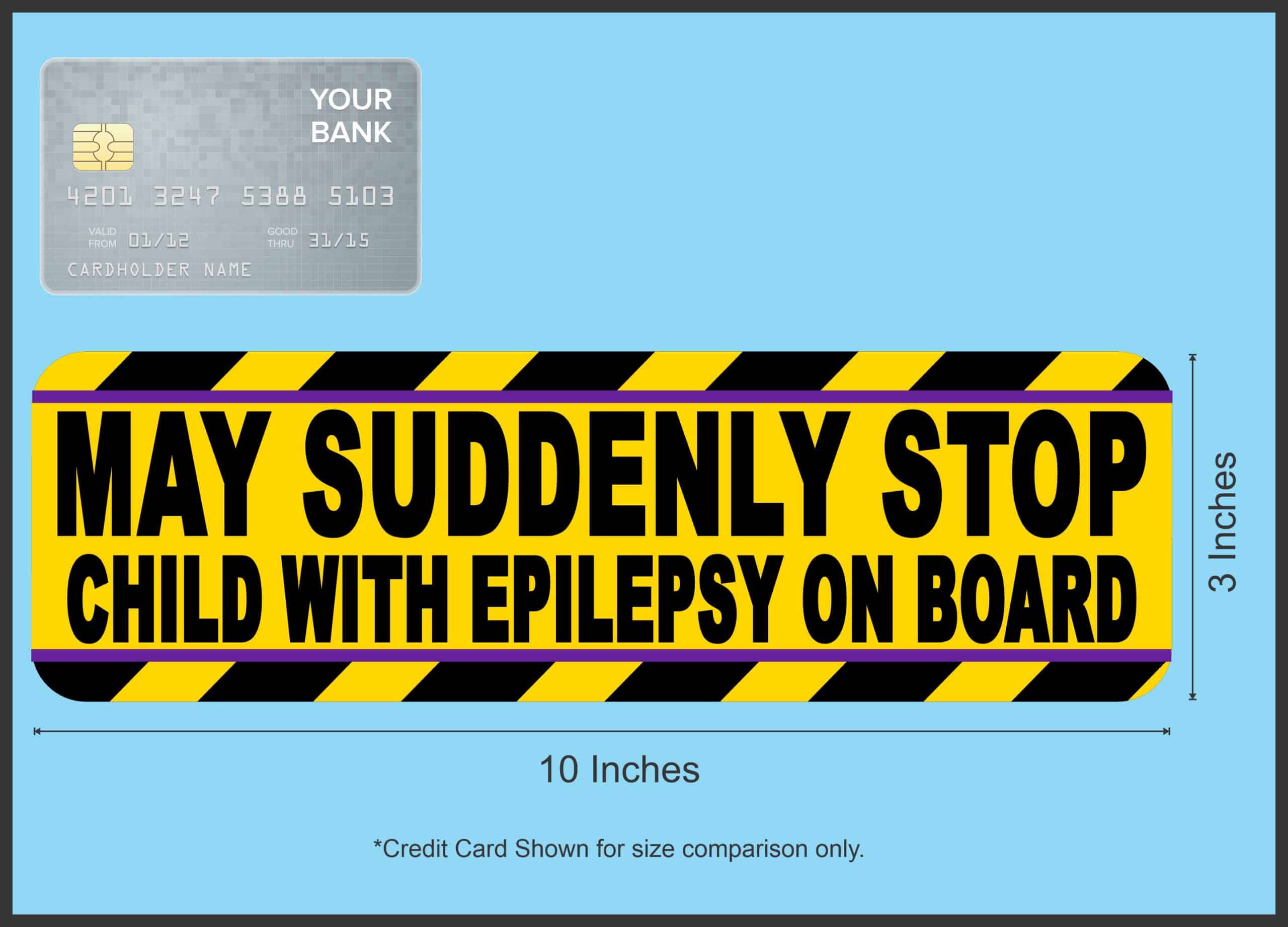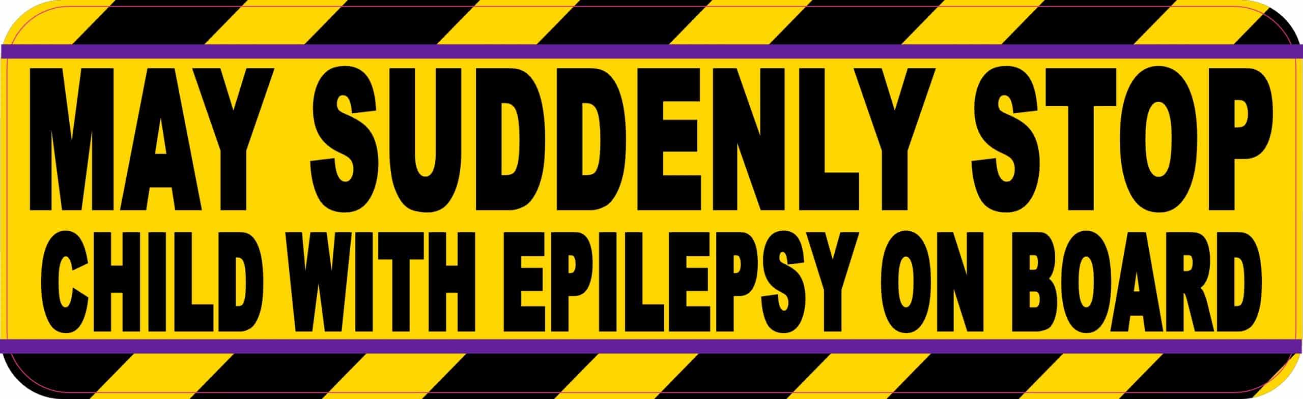 This magnet measures 10 inches wide by 3 inches tall. This vinyl removable magnet features a bright yellow background with bold black text reading “MAY SUDDENLY STOP CHILD WITH EPILEPSY ON BOARD” surrounded by attention-grabbing black and yellow diagonal stripes with purple accent borders. The magnetic backing requires no adhesive and can be easily applied to and removed from metal surfaces without leaving residue. The high-contrast design ensures maximum visibility for other drivers. This magnetic sign serves as an important communication tool for parents and caregivers transporting children with epilepsy, alerting other drivers that the vehicle may need to stop suddenly for medical reasons.