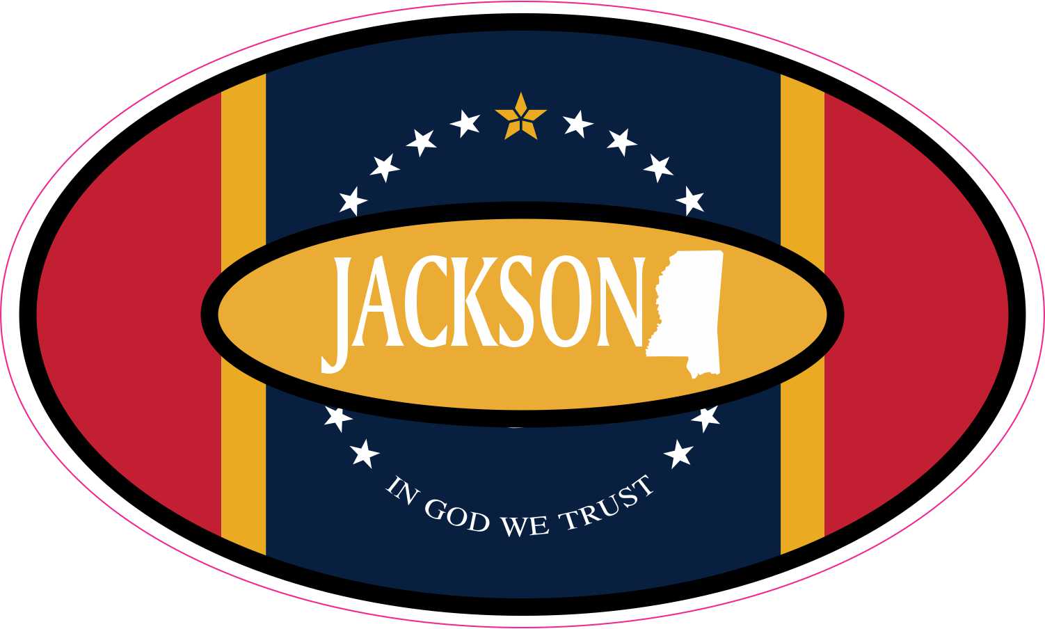 This oval-shaped sticker is 5 inches wide by 3 inches tall when applied.  The center of the sticker’s design is a gold oval with black outlining containing the city name, JACKSON, in white letters.  A white silhouette of the state of Mississippi is printed in the oval on the right side of the text.  The remainder of the sticker depicts the state flag of Mississippi.  A black border is printed just inside the edges of the sticker, leaving a small white margin on the outer edges.  The pink line in the image shows where the sticker is cut; the pink line is not printed on the sticker.  This product is the perfect novelty for both locals and visitors to this historic city!  It can be proudly displayed on vehicles, cups and tumblers, luggage, and other hard, smooth surfaces.
