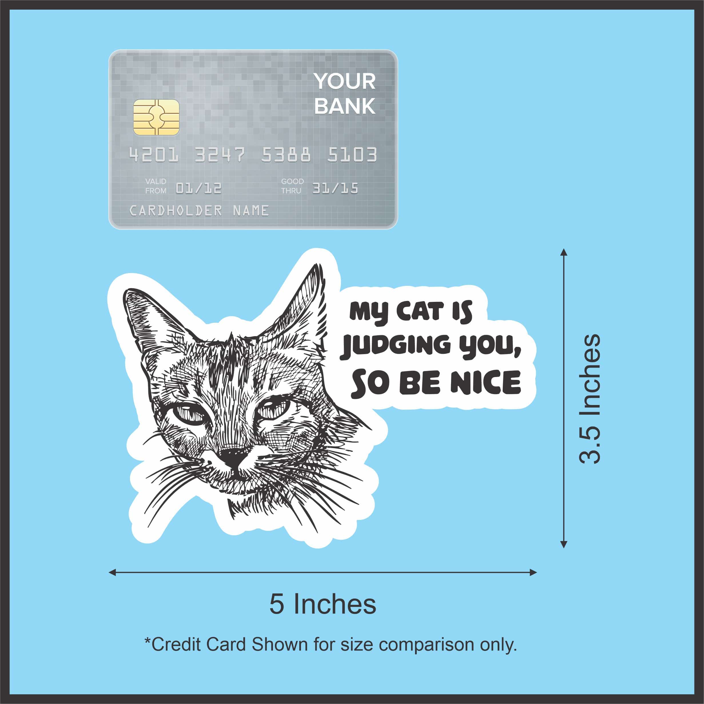 5 inches by 3.5 inches (127 mm x 88.9 mm) My Cat Is Judging You So Be Nice Vinyl Sticker