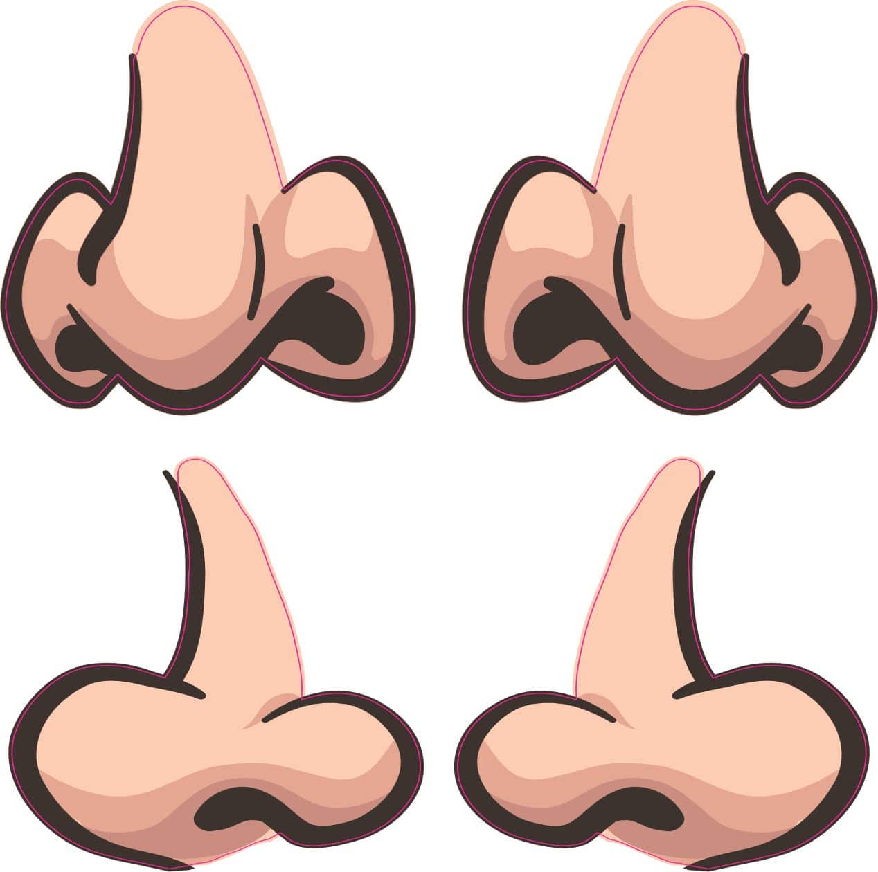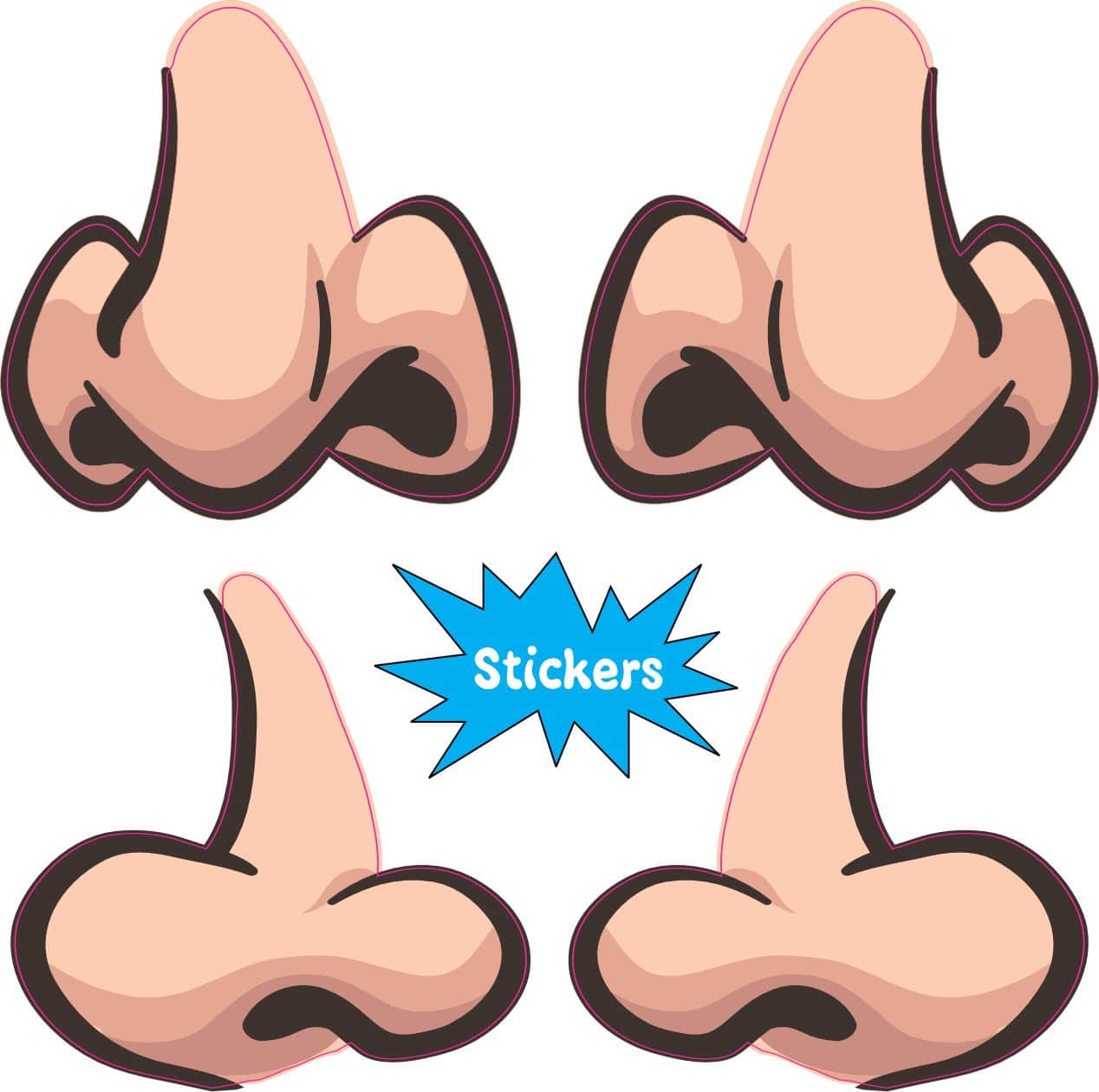 This is 1 sheet of 4 stickers. Each sticker measures 2 inches wide and 2 inches tall. There are two types of nose stickers on this sheet. One type is forward facing, and the other is outward facing with a mirrored image of each. These nose stickers are good for decorating anything that needs a face. They look best when applied to a flat smooth surface. The pink line indicates where the stickers will be cut and will not be printed on the final product.