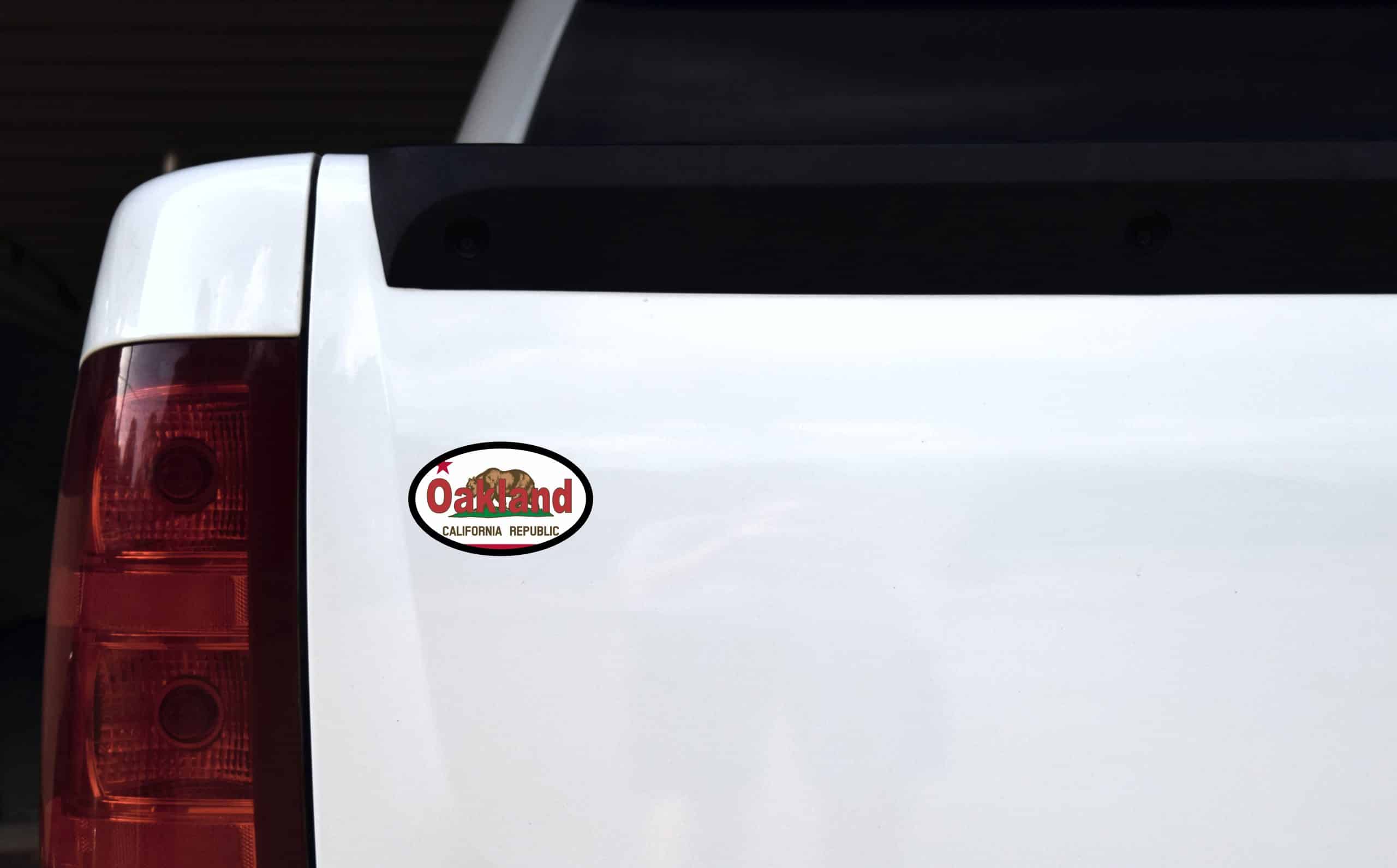 This oval sticker measures 4 inches wide by 2.5 inches tall. It has a California flag as the background with the word Oakland in bold red letters across the face of the sticker. This travel sticker is a great way to document your travels to Oakland. The pink line indicates where the sticker will be cut and will not be printed on the final product.