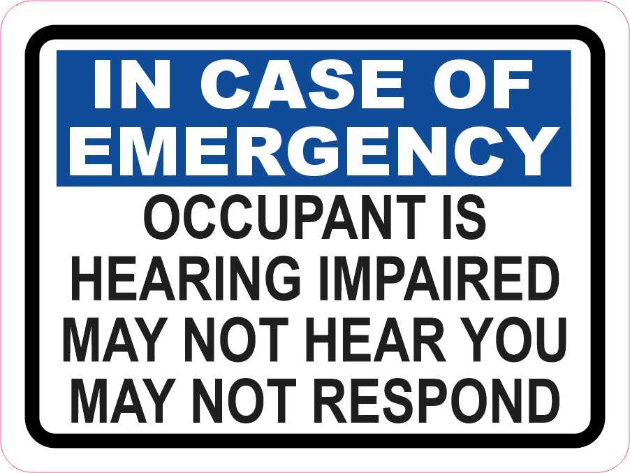 This sticker is 3 inches wide by 2.25 inches tall when applied. The words, IN CASE OF EMERGENCY, are printed at the top of the sticker in white letters on a blue rectangle; under this, the words, OCCUPANT IS HEARING IMPAIRED MAY NOT HEAR YOU MAY NOT RESPOND, are printed in black letters on a white background. A black border accents the edges of the sticker. The pink line in the image shows where the sticker is cut; the pink line is not printed on the sticker. This quality-made product durable and easily visible, making it an effective way to stay safe!