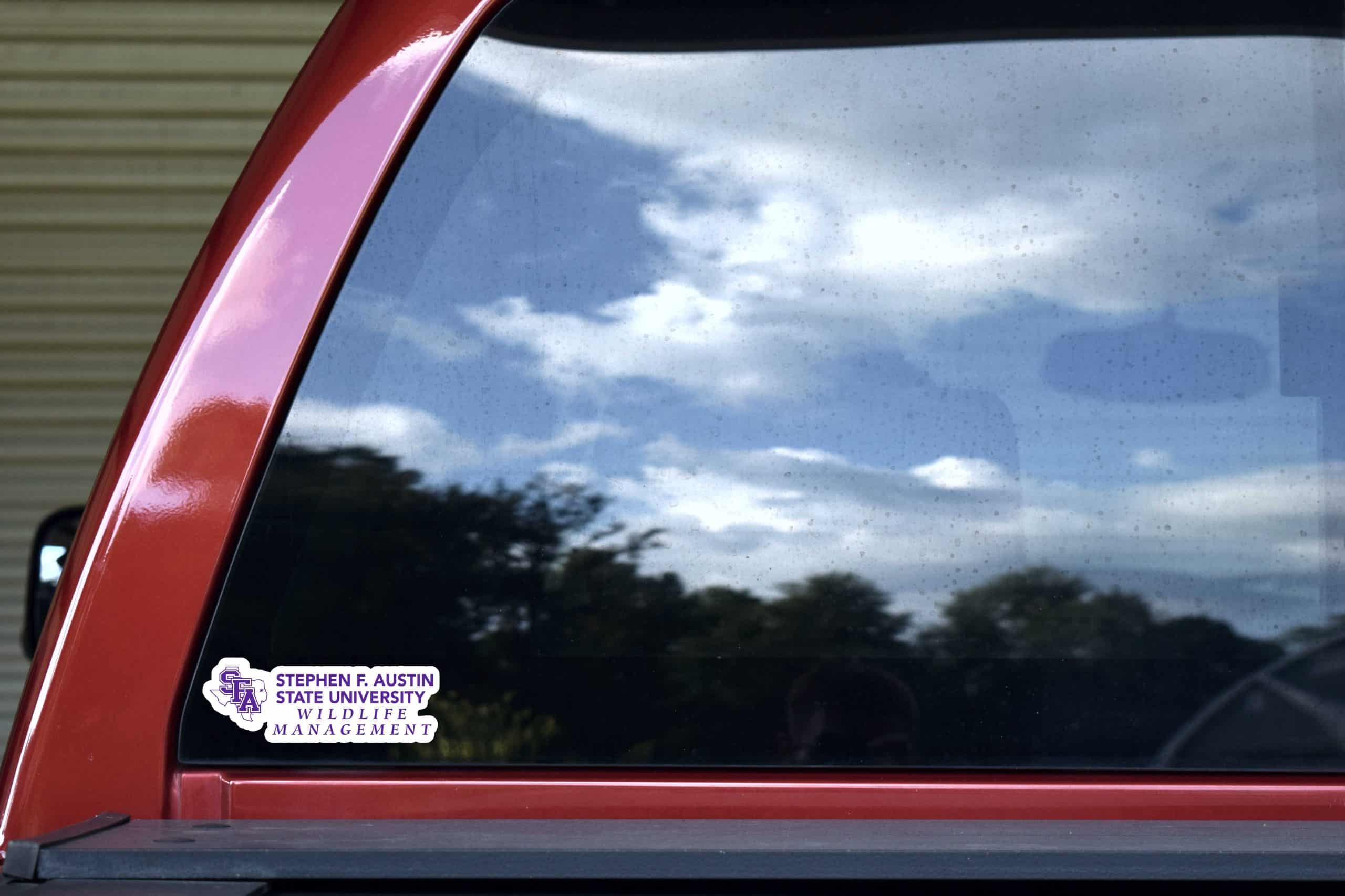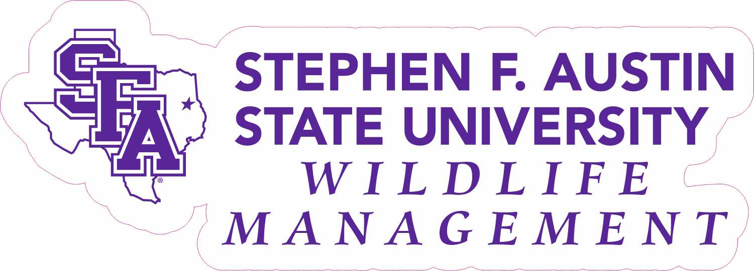 This sticker measures 5 inches wide by 1.6 inches tall. On the left side of the sticker is the SFA Texas state logo in SFA purple. To the right of the logo are the words Stephen F. Austin State University Wildlife Management, all in SFA purple. This is a fantastic way to show pride in your chosen degree and future career. These fit great on your coffee mug or car window.