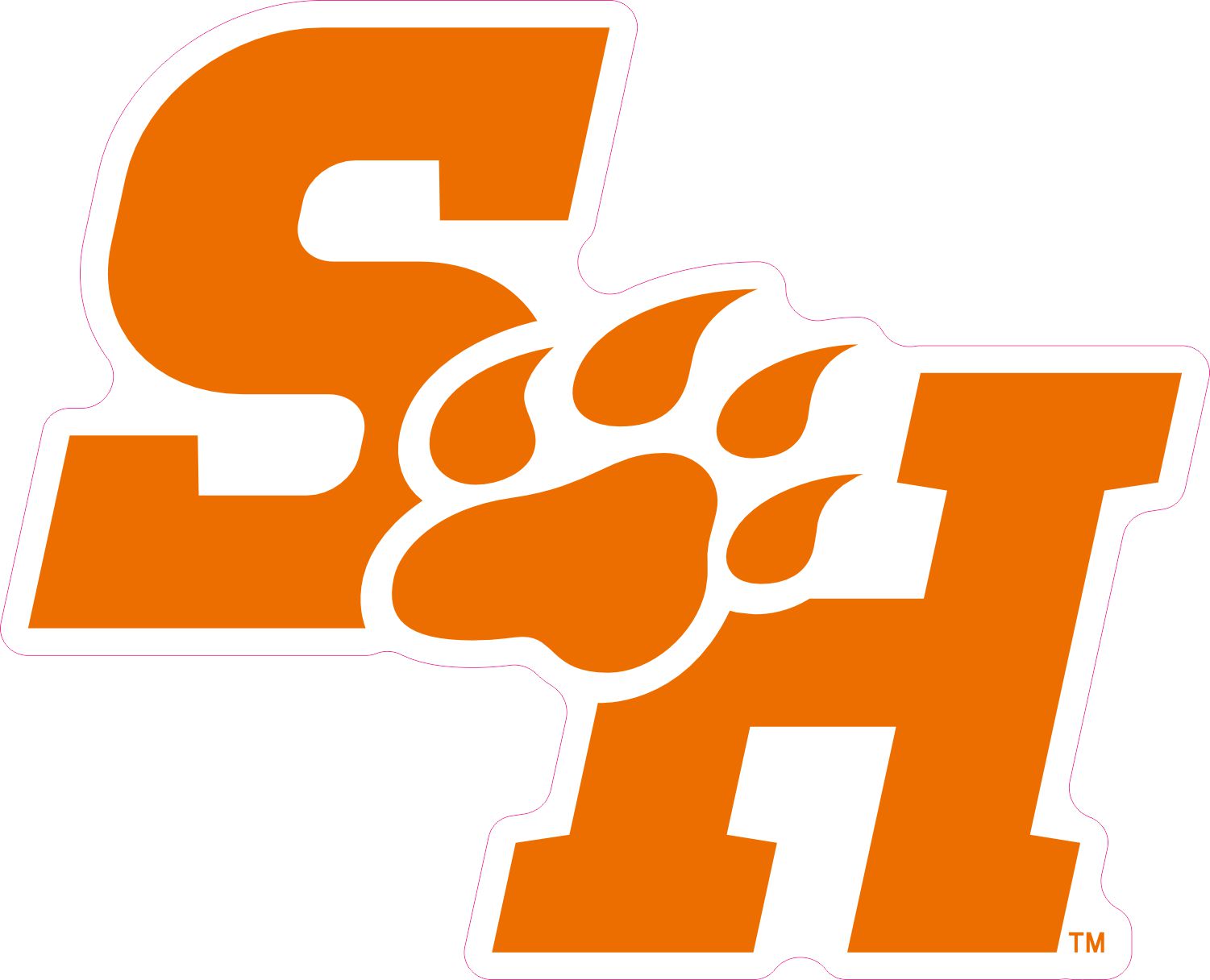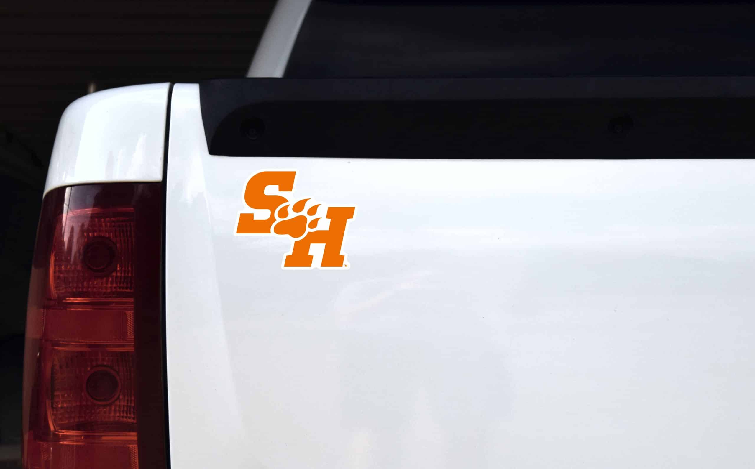 This sticker measures 5 inches wide by 4 inches tall. It has the letters SH in bright Sam Houston State University orange. Between the S and the H is the Bearkat paw print. This sticker is made for outdoor use, but will also work great on your laptop or any other smooth flat surface. Show support for your school with this high quality tribute to the Sam Houston Bearkats. The pink line indicates where the sticker will be cut and will not be printed on the final product.