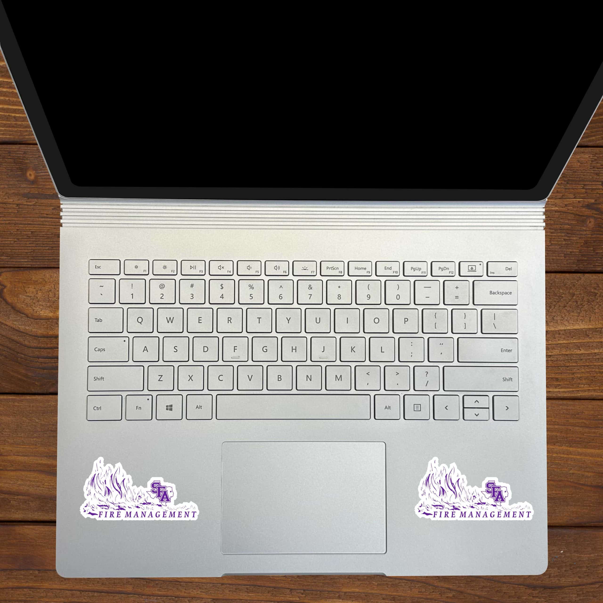 This is a sheet of 2 officially licensed SFA stickers. Each sticker measures 3 inches wide by 1.5 inches tall. Each one has flames in SFA Purple with the SFA Texas State logo and the words Fire management. This hot sticker is a great way to show pride in your chosen profession.