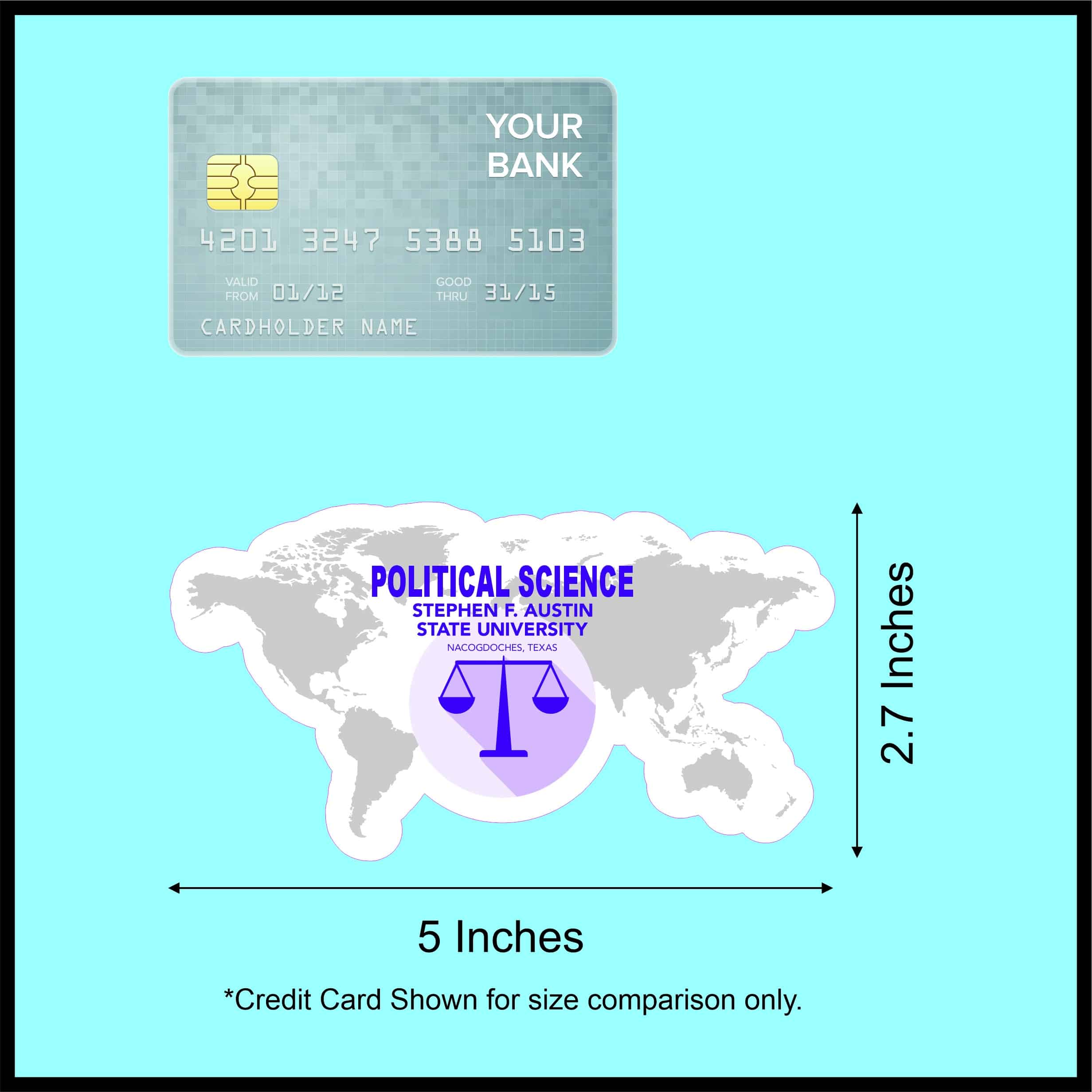 This sticker measures 5 inches wide and 2.7 inches tall. This sticker is an officially licensed Stephen F. Austin State University Sticker. This sticker has a world map with Political Science Stephen F. Austin State University Nacogdoches, Texas printed at the top of the sticker in purple. Below that is the scale of justice in a dark purple with a light purple circle as the background. Show pride in your major with this cool sticker. It can be applied to any flat smooth surface. The pink line indicates where the sticker will be cut and will not be printed on the final product.