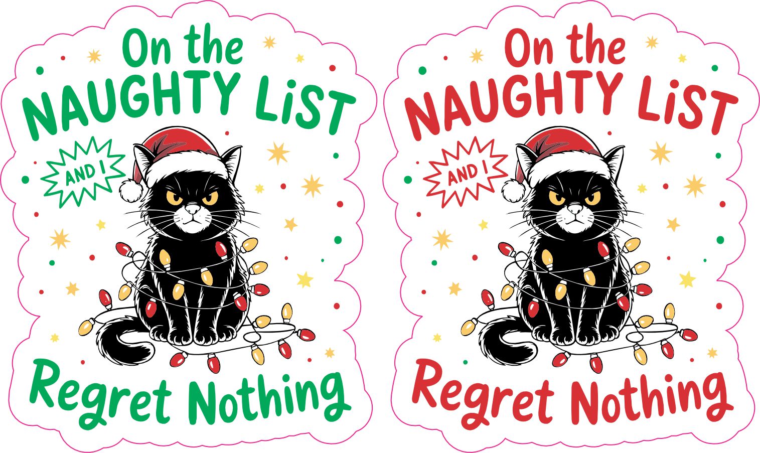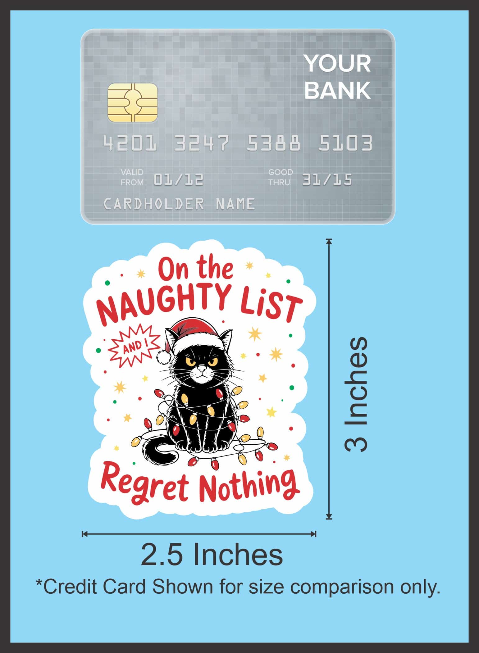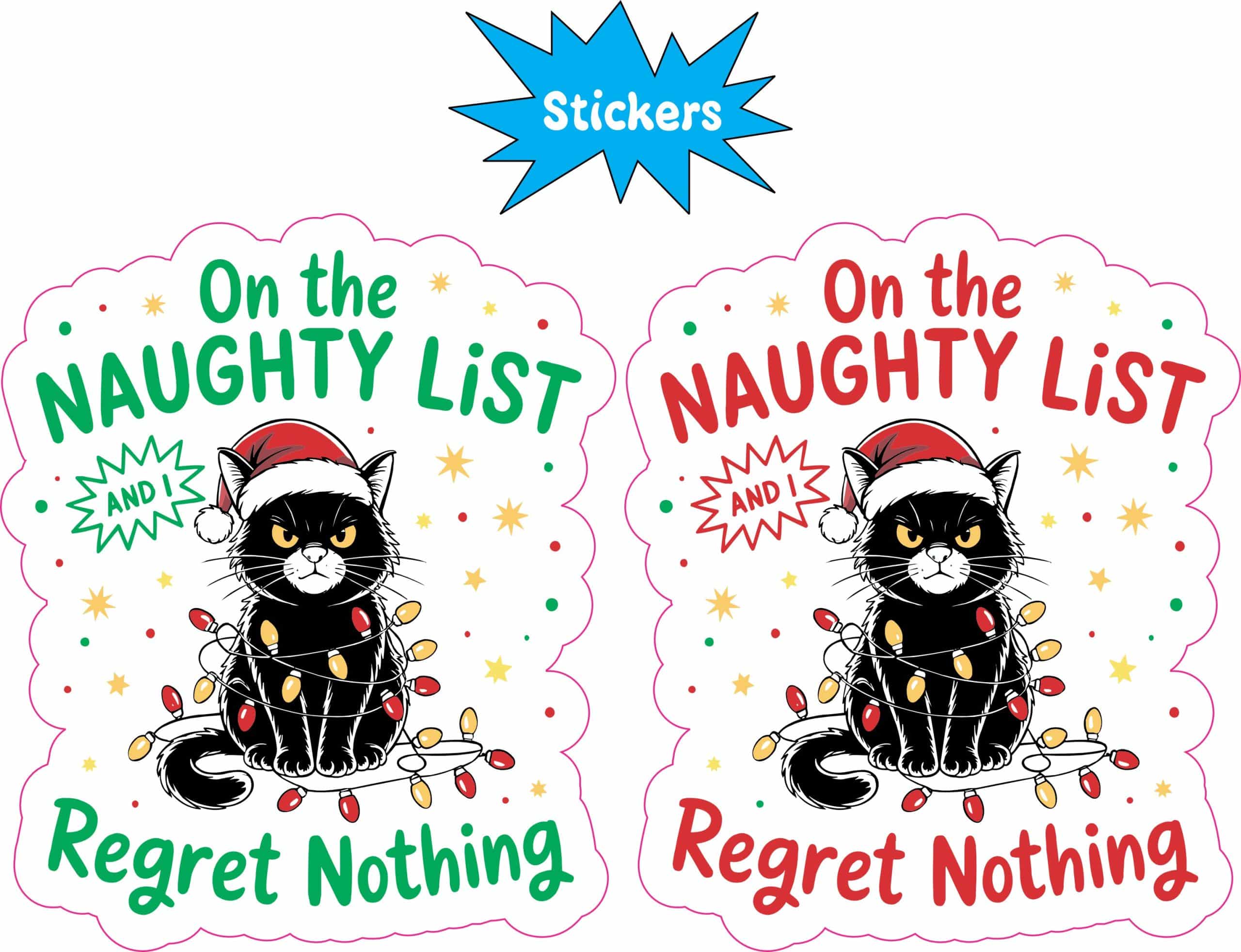This is 1 sheet of 2 stickers, each one measures 2.5 inches wide by 3 inches tall. These festive Christmas stickers feature a mischievous black cat with yellow eyes wearing a Santa hat, tangled up in colorful Christmas lights. The design includes the humorous text “On the NAUGHTY LiST AND I Regret Nothing” with decorative stars and holiday elements. One sticker has green text while the other features red text, giving you versatile options for your holiday decorating needs. These cat-themed Christmas stickers are perfect for adding humor to your holiday decorations, personalizing gifts, decorating laptops, water bottles, or any smooth surface. The playful design captures the spirit of cats who embrace their mischievous nature during the holiday season.