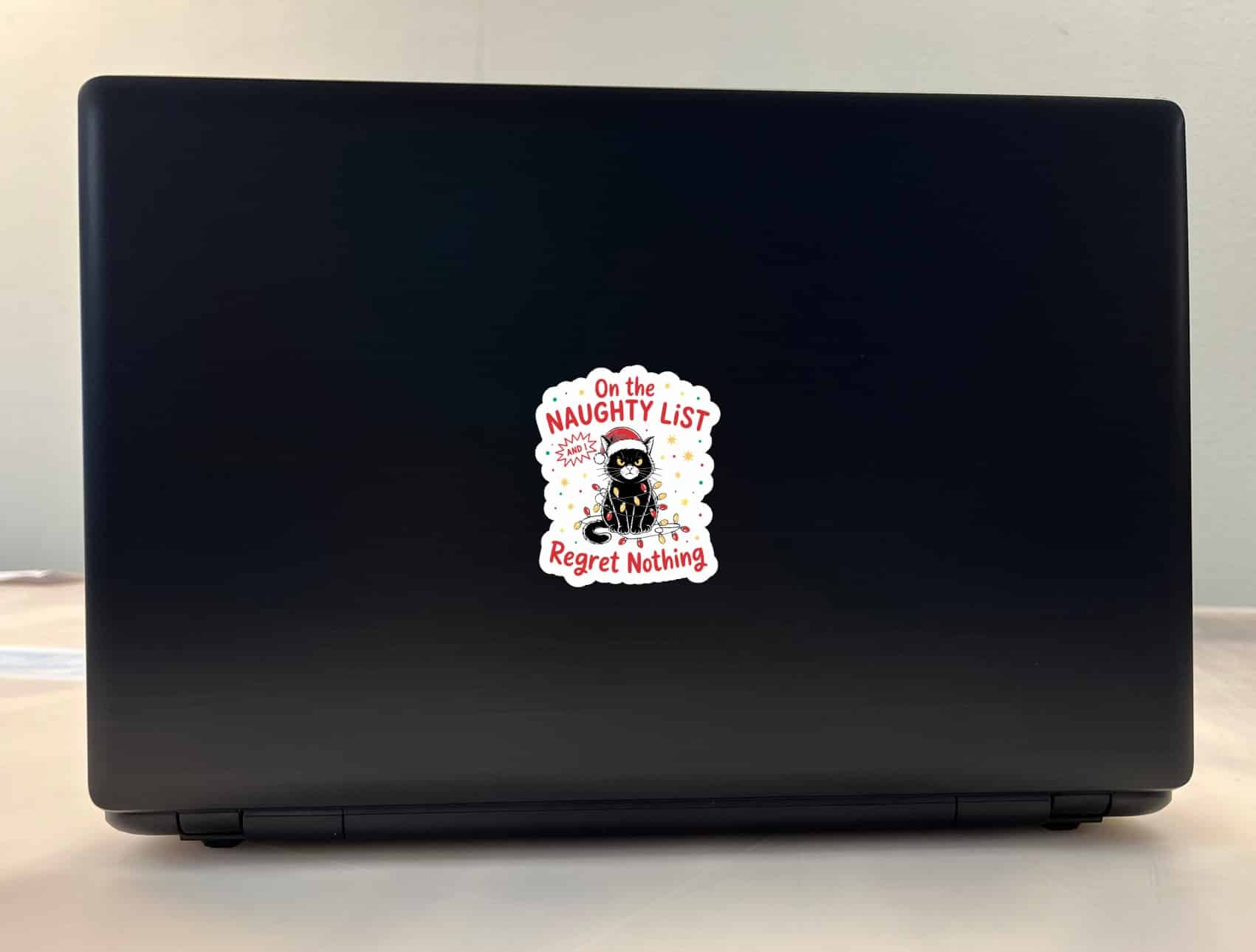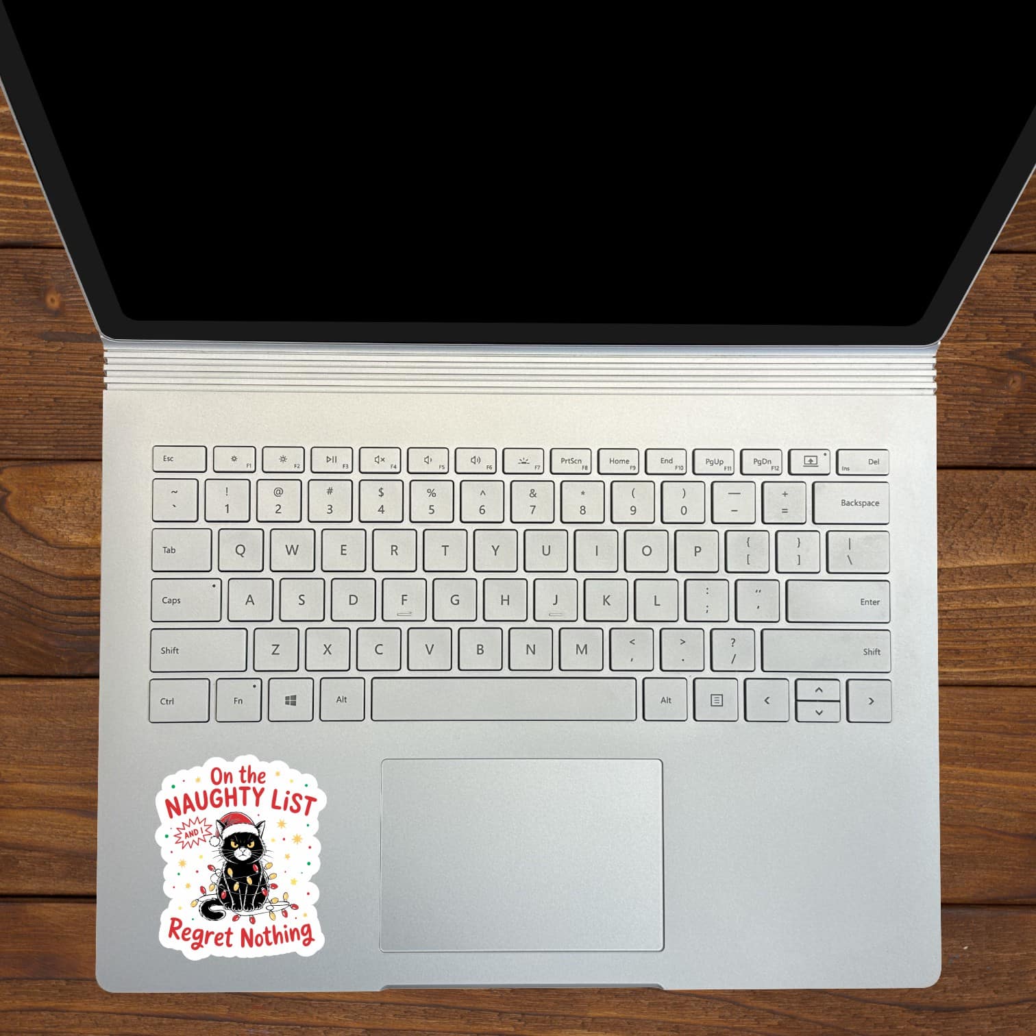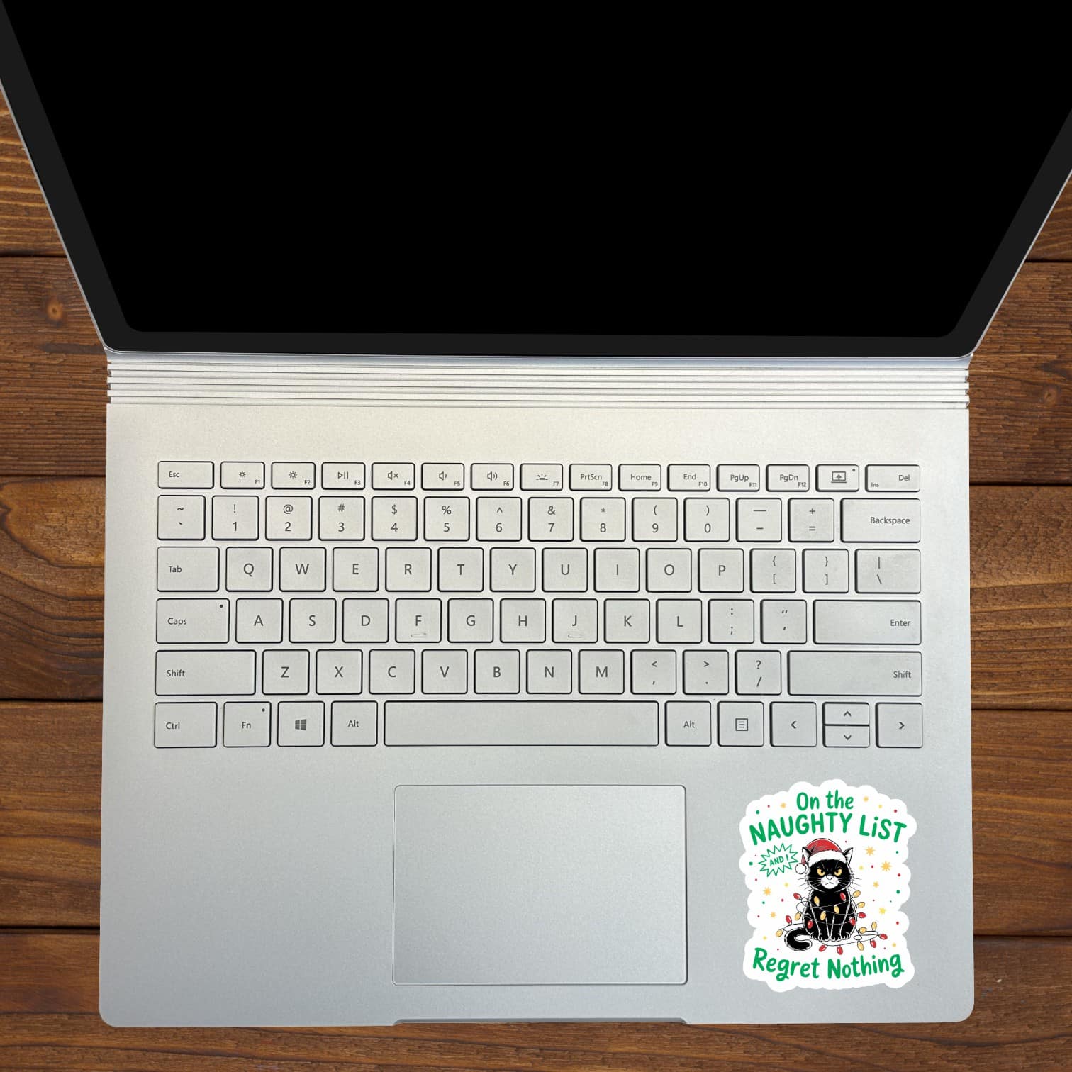 This is 1 sheet of 2 stickers, each one measures 2.5 inches wide by 3 inches tall. These festive Christmas stickers feature a mischievous black cat with yellow eyes wearing a Santa hat, tangled up in colorful Christmas lights. The design includes the humorous text “On the NAUGHTY LiST AND I Regret Nothing” with decorative stars and holiday elements. One sticker has green text while the other features red text, giving you versatile options for your holiday decorating needs. These cat-themed Christmas stickers are perfect for adding humor to your holiday decorations, personalizing gifts, decorating laptops, water bottles, or any smooth surface. The playful design captures the spirit of cats who embrace their mischievous nature during the holiday season.