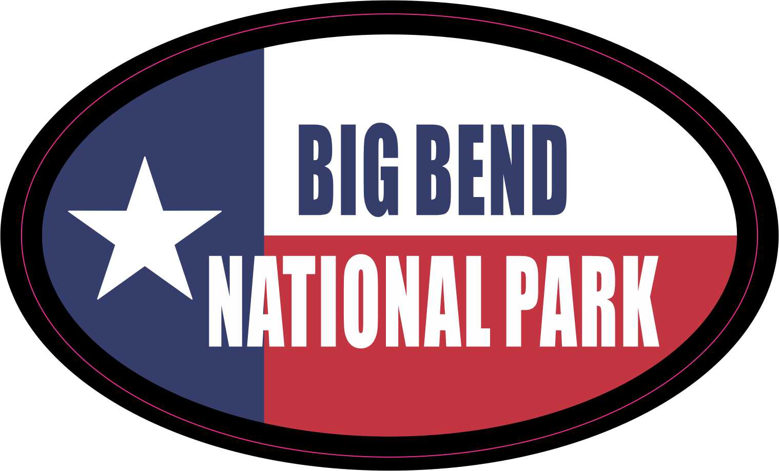 This oval-shaped sticker is approximately 4.75 inches wide by 3 inches tall when applied.  It depicts the state flag of Texas.  The words, BIG BEND, are printed in the white portion of the flag in blue letters, and the words, NATIONAL PARK, are printed in the red portion of the sticker in white letters.  A black border accents the edges of the sticker.  This quality-made product is the perfect novelty for visitors to this picturesque area!  It can be proudly displayed on luggage, vehicles, cups and tumblers, and other hard, flat surfaces.