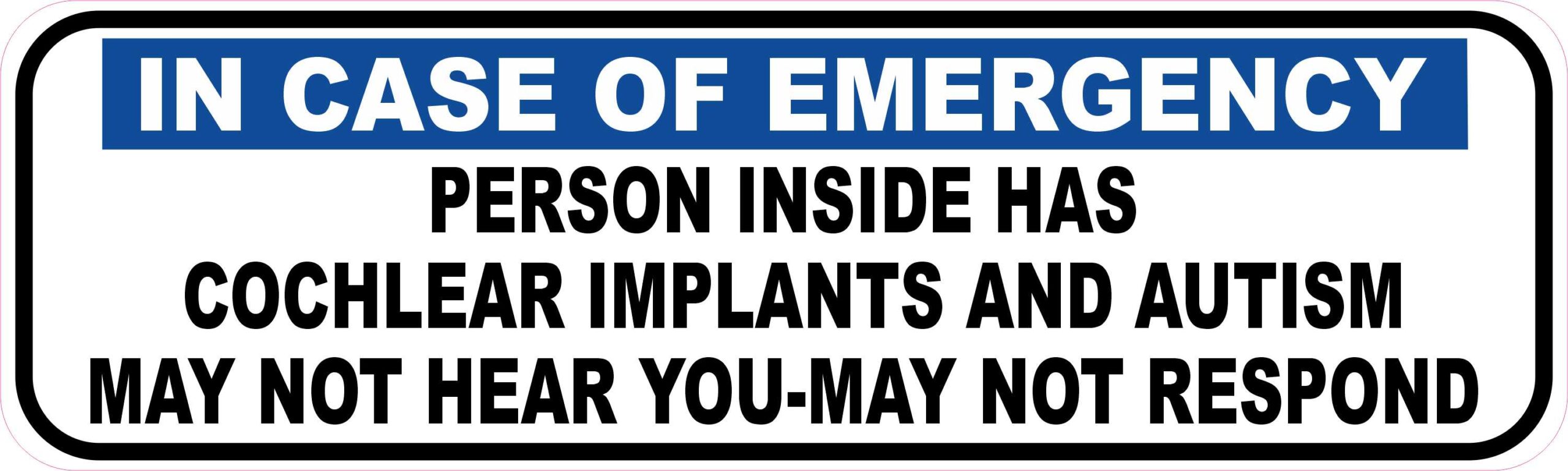 This magnet is 10 inches wide by 3 inches tall. The words, IN CASE OF EMERGENCY, are printed near the top of the magnet in white letters on a blue rectangle. Below the rectangle, the words, PERSON INSIDE HAS COCHLEAR IMPLANTS AND AUTISM MAY NOT HEAR YOU-MAY NOT RESPOND, are printed in black letters on a white background. A black border accents the edges of the magnet. The pink line in the image shows where the magnet is cut; the pink line is not printed on the magnet. Please note that this magnet only attracts ferromagnetic metals.