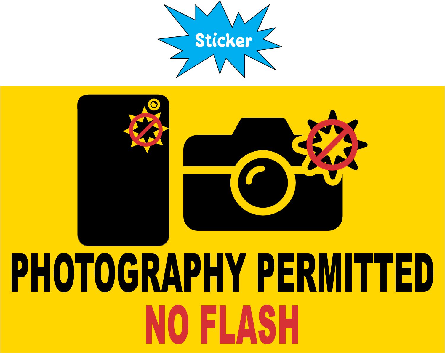 This sticker measures 5 inches wide and 3 inches tall. It has a yellow background with black text that says, PHOTOGRAPHY PERMITTED. Below that in a red text it says, NO FLASH. Above the text are images of both a phone and a camera with don’t symbols over the flash. This sticker can be applied to any flat smooth surface. The pink line indicates where the sticker will be cut and will not be printed on the final product.