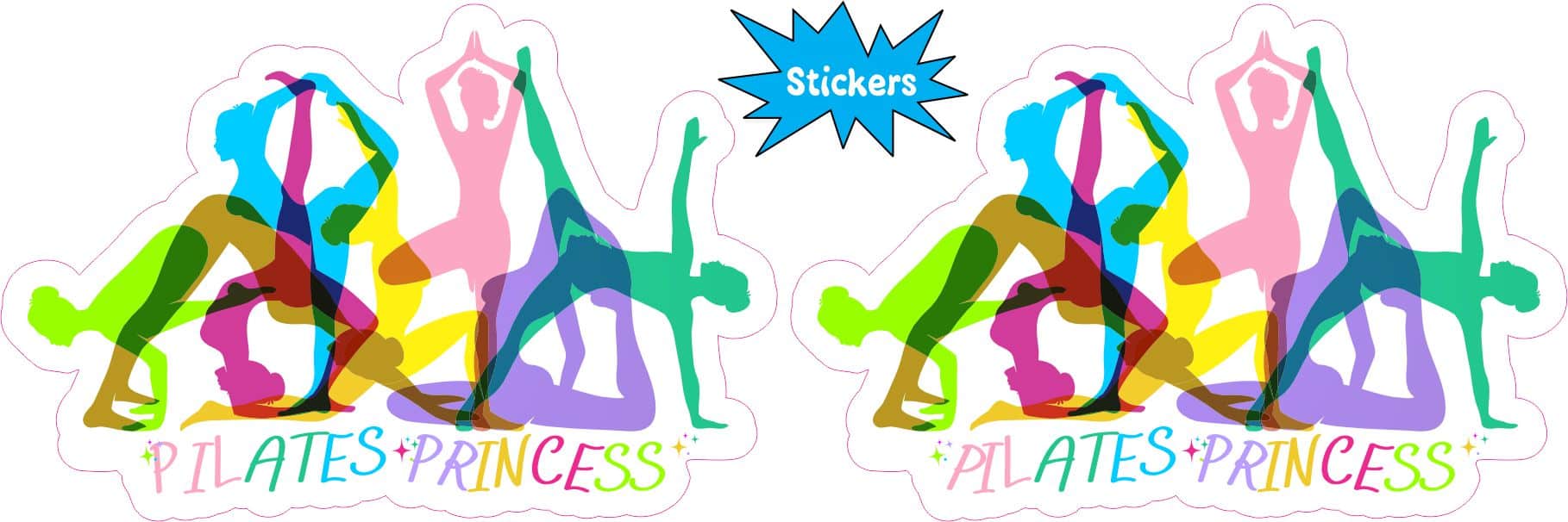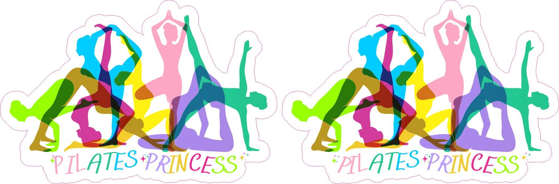 This is 1 sheet of 2 stickers. Each sticker measures 3 inches wide and 2 inches tall. They both have silhouettes of a woman performing different stretches in various light washes of colors. Under that in a rainbow text it says, PILATES PRINCESS. These stickers are perfect anyone who loves Pilates. They are the ideal size for decorating your gym water bottle. They look best when applied to a flat smooth surface. The pink line indicates where the stickers will be cut and will not be printed on the final product.