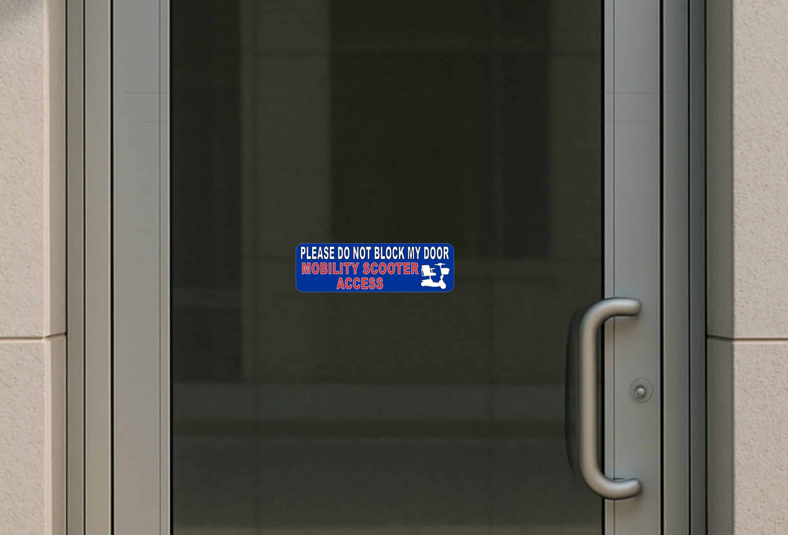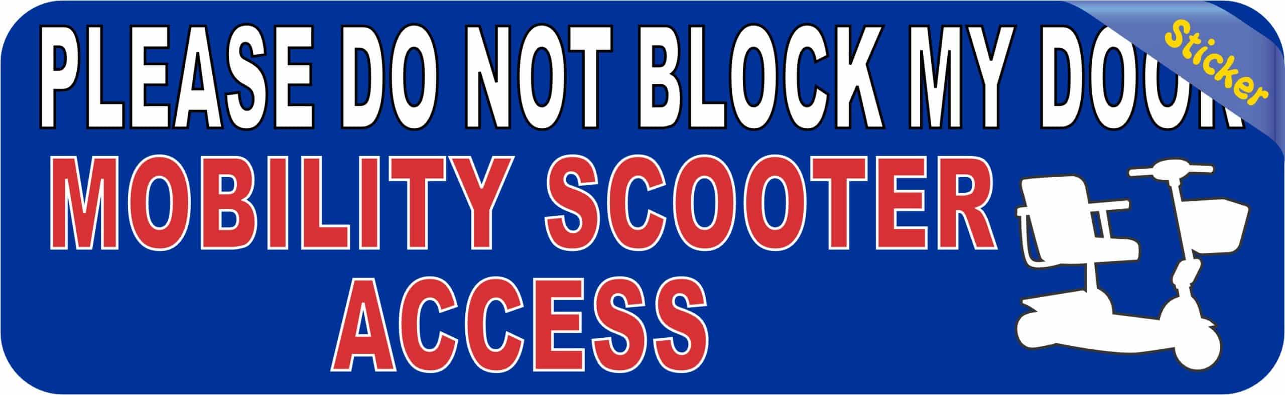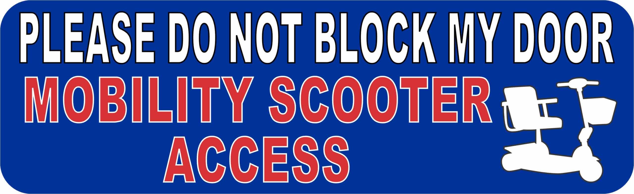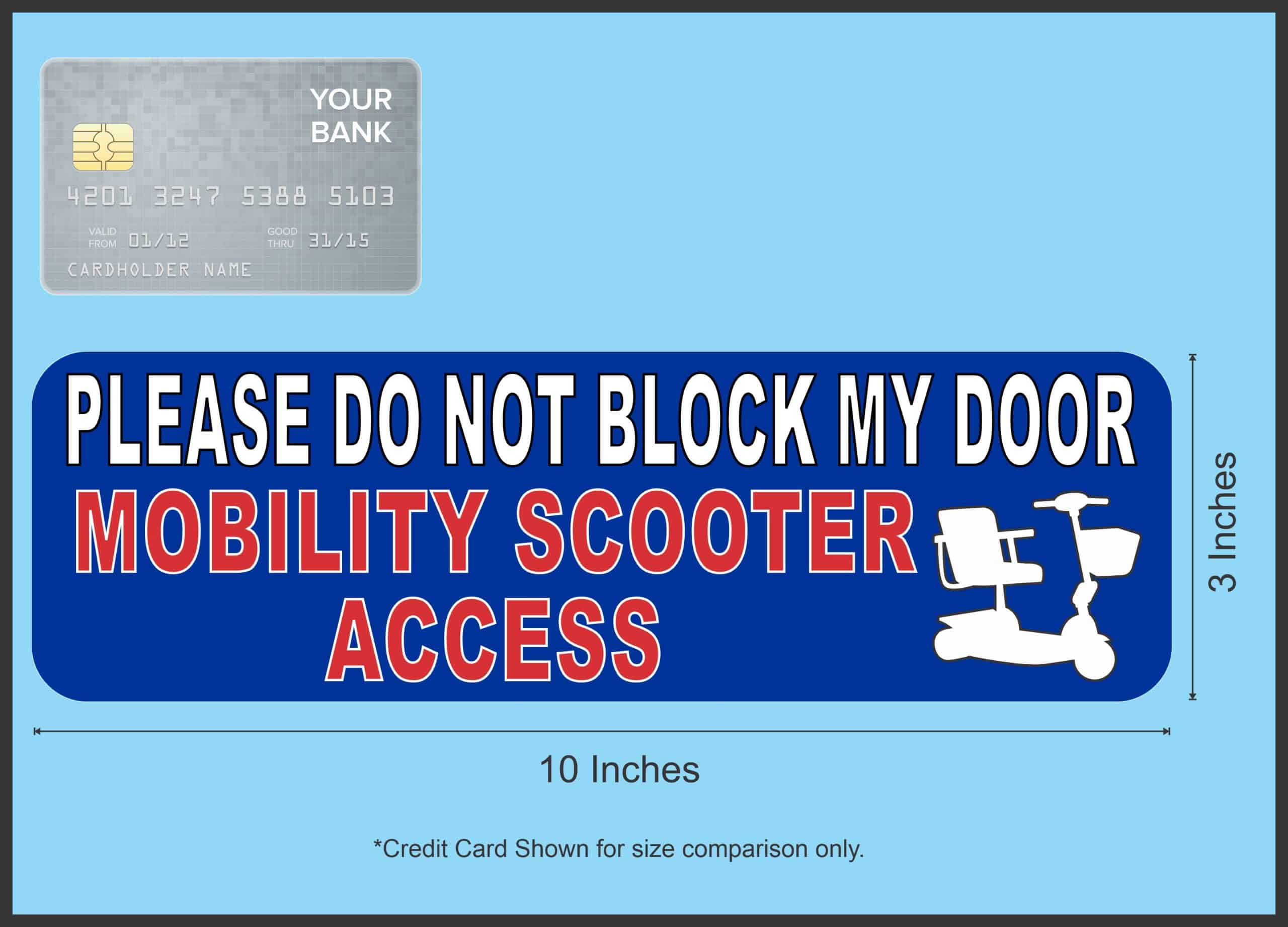 This sticker measures 10 inches wide by 3 inches tall (254 mm x 76.2 mm). Display this clear accessibility message to ensure your mobility scooter access remains unobstructed. The bold blue and red design features “PLEASE DO NOT BLOCK MY DOOR MOBILITY SCOOTER ACCESS” text with a mobility scooter graphic for instant recognition.