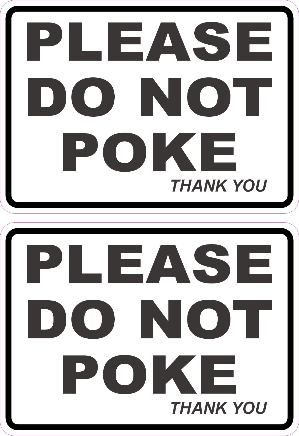 This is 1 sheet of 2 stickers. Each sticker measures 3.5 inches wide and 2.5 inches tall. Both stickers read, Please Do Not Poke Thank You. In bold, black letters on a white background. This sticker can be applied to any flat smooth surface, and warn the reader to not touch any valuable, hazardous, or delicate items. The pink line indicates where the stickers will be cut and will not be printed on the final product.